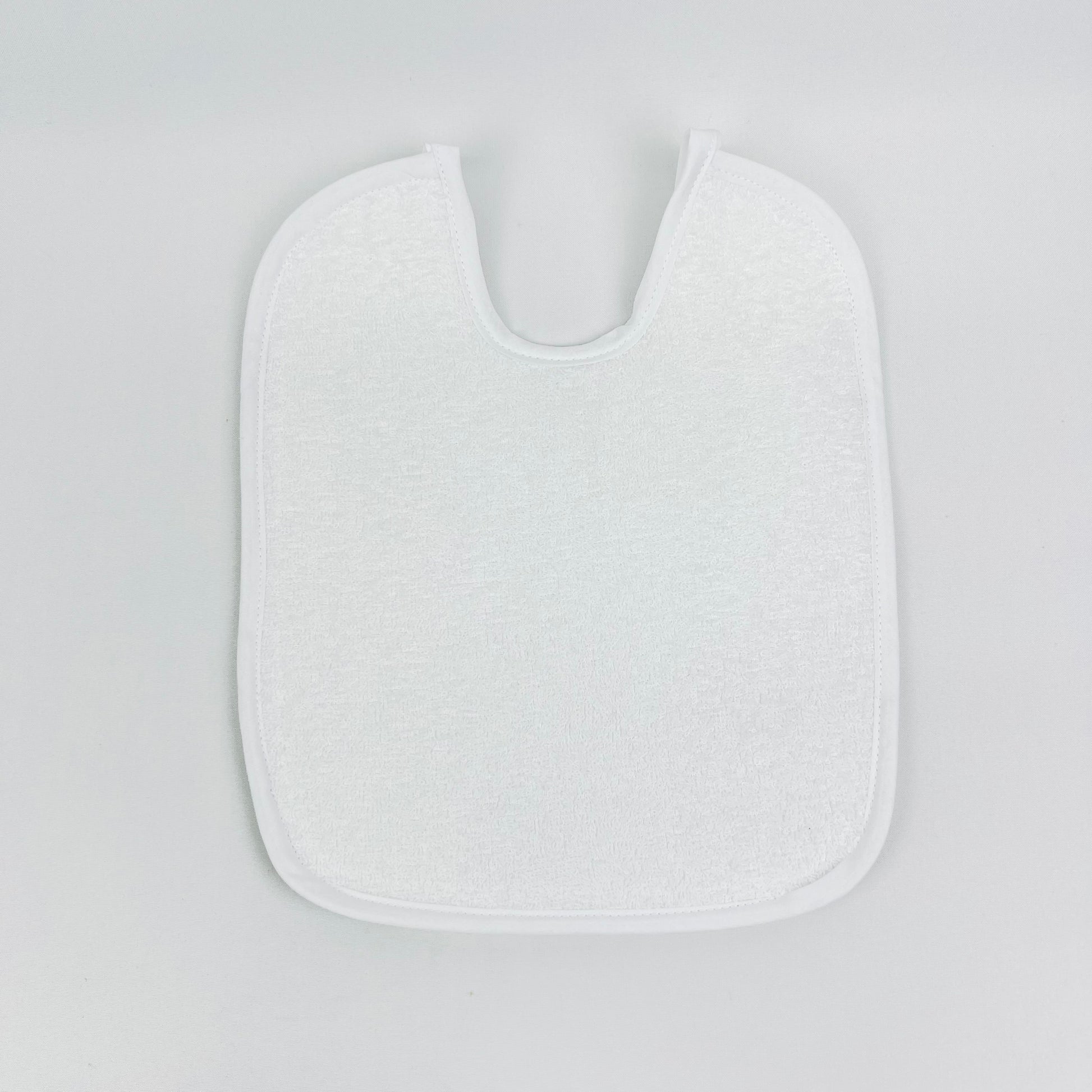 Babete de adulto em felpo branco e com revestimento de plástico, disponível em duas medidas