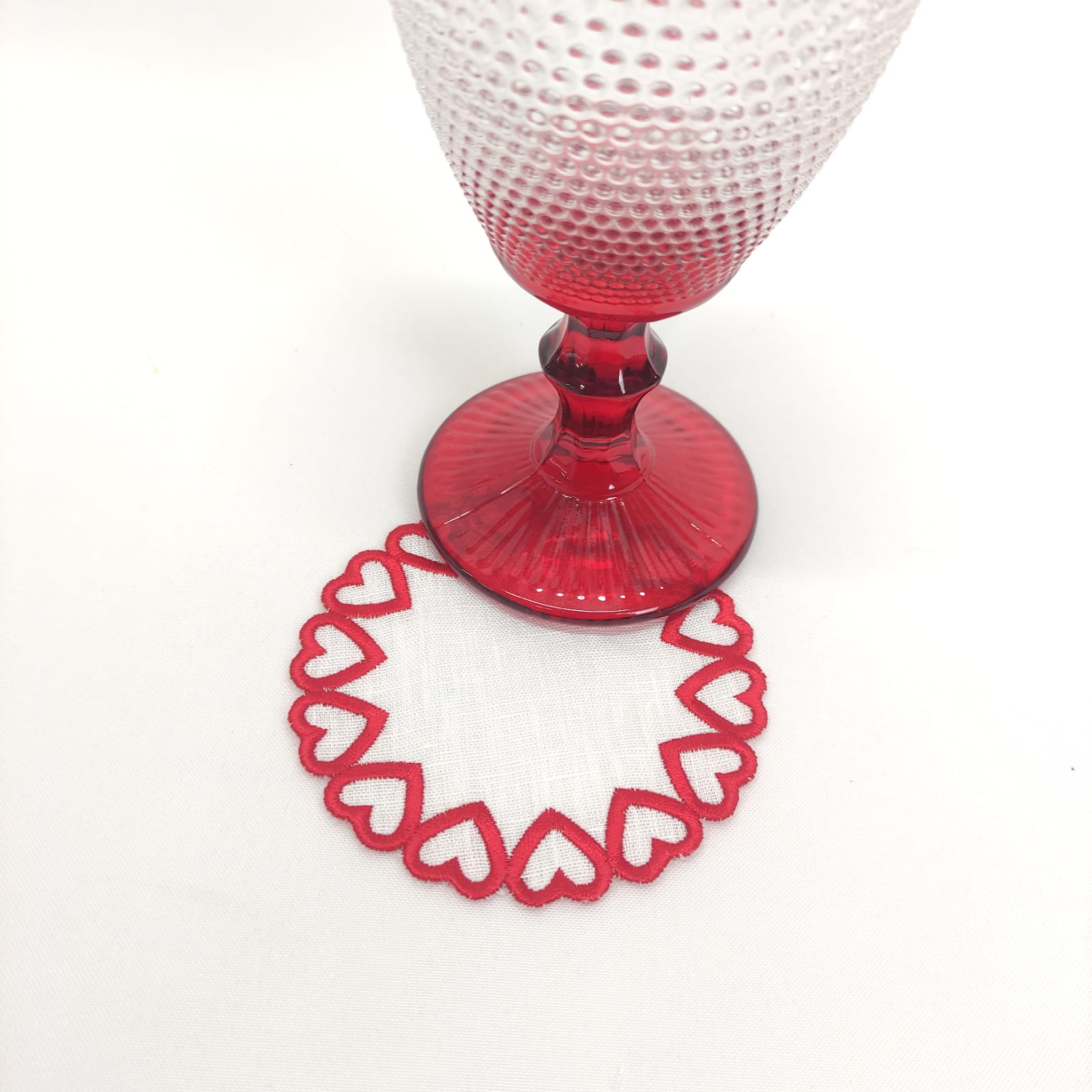 Base p/ pão ou copo em linho branco, diâmetro de 10cm, c/ acabamento em rolinho.