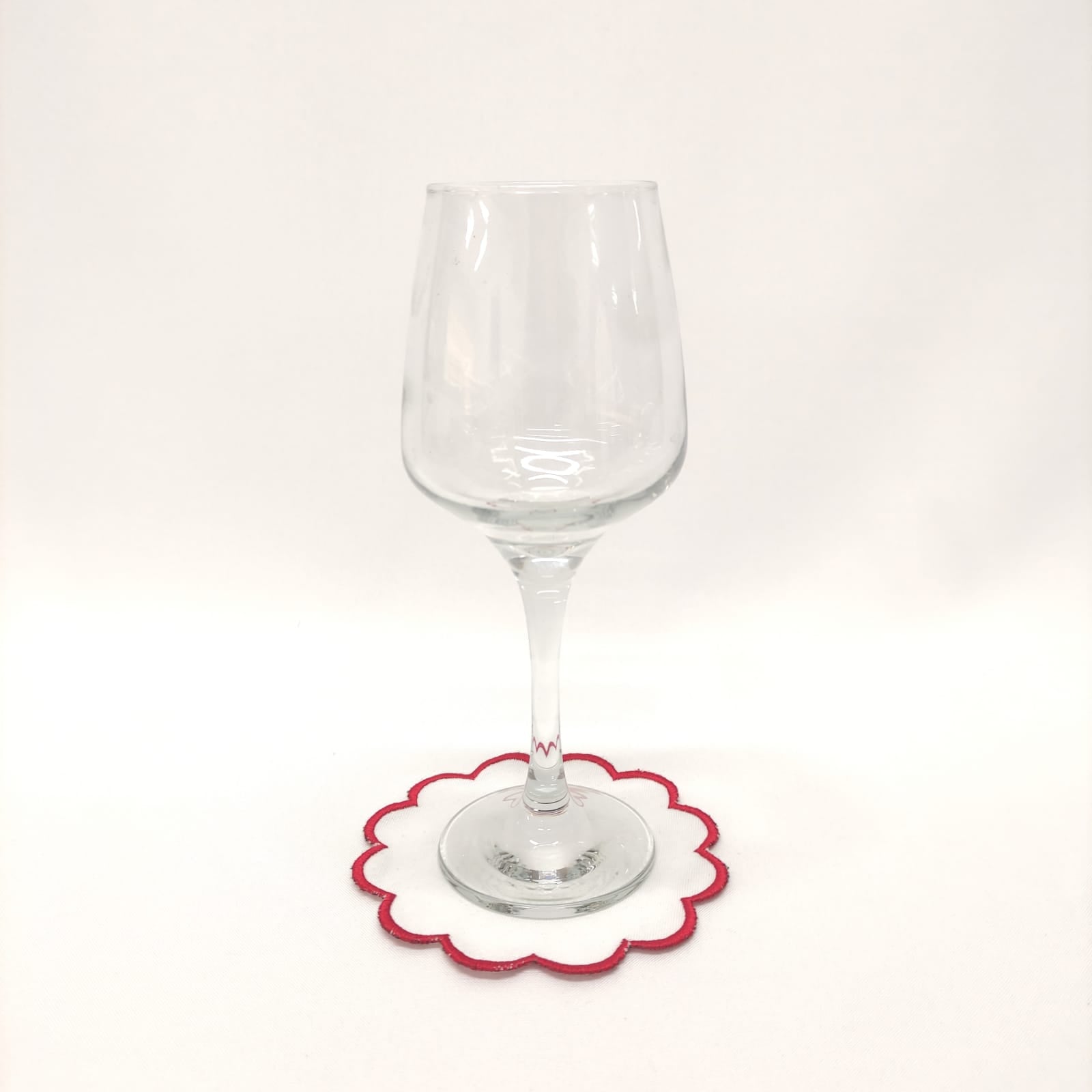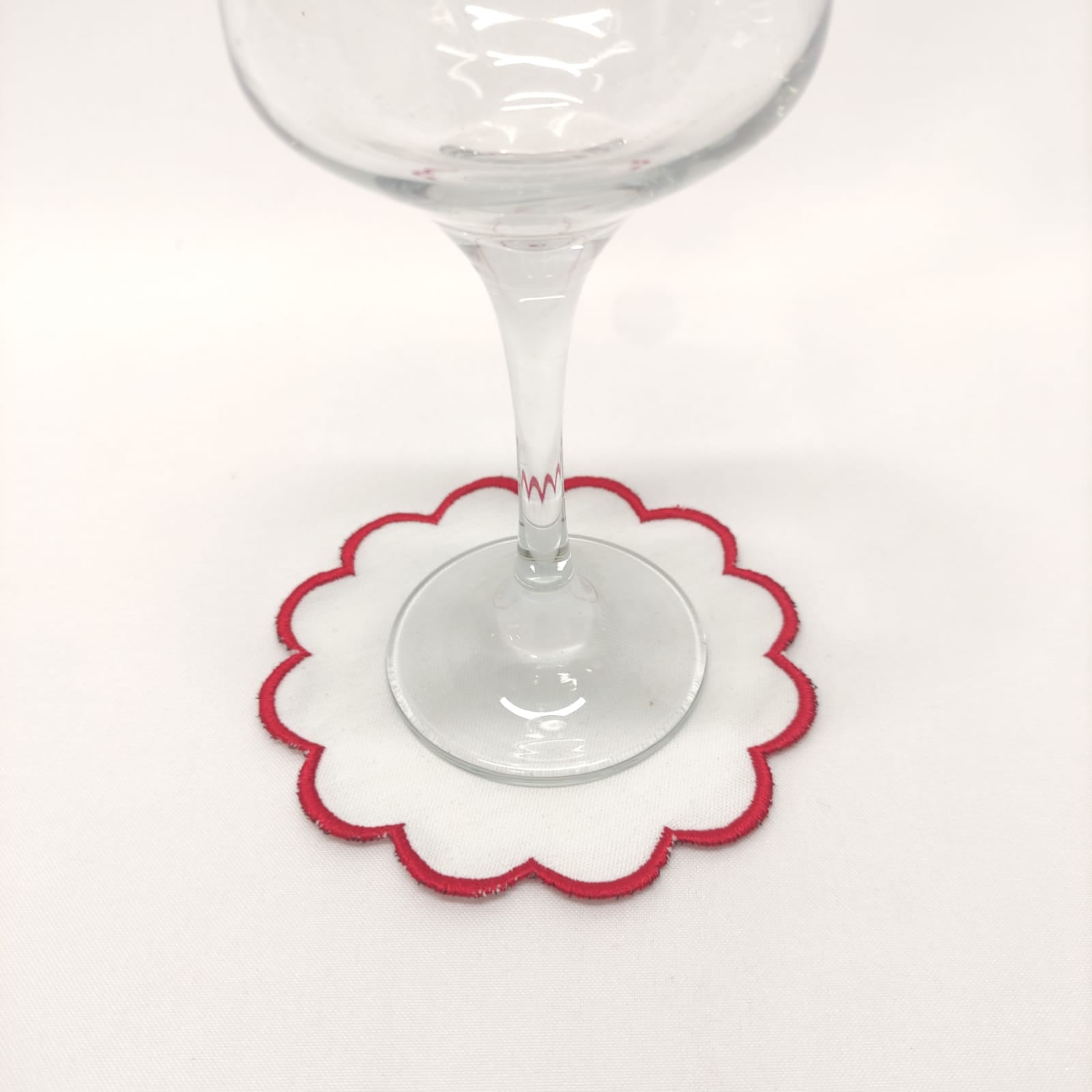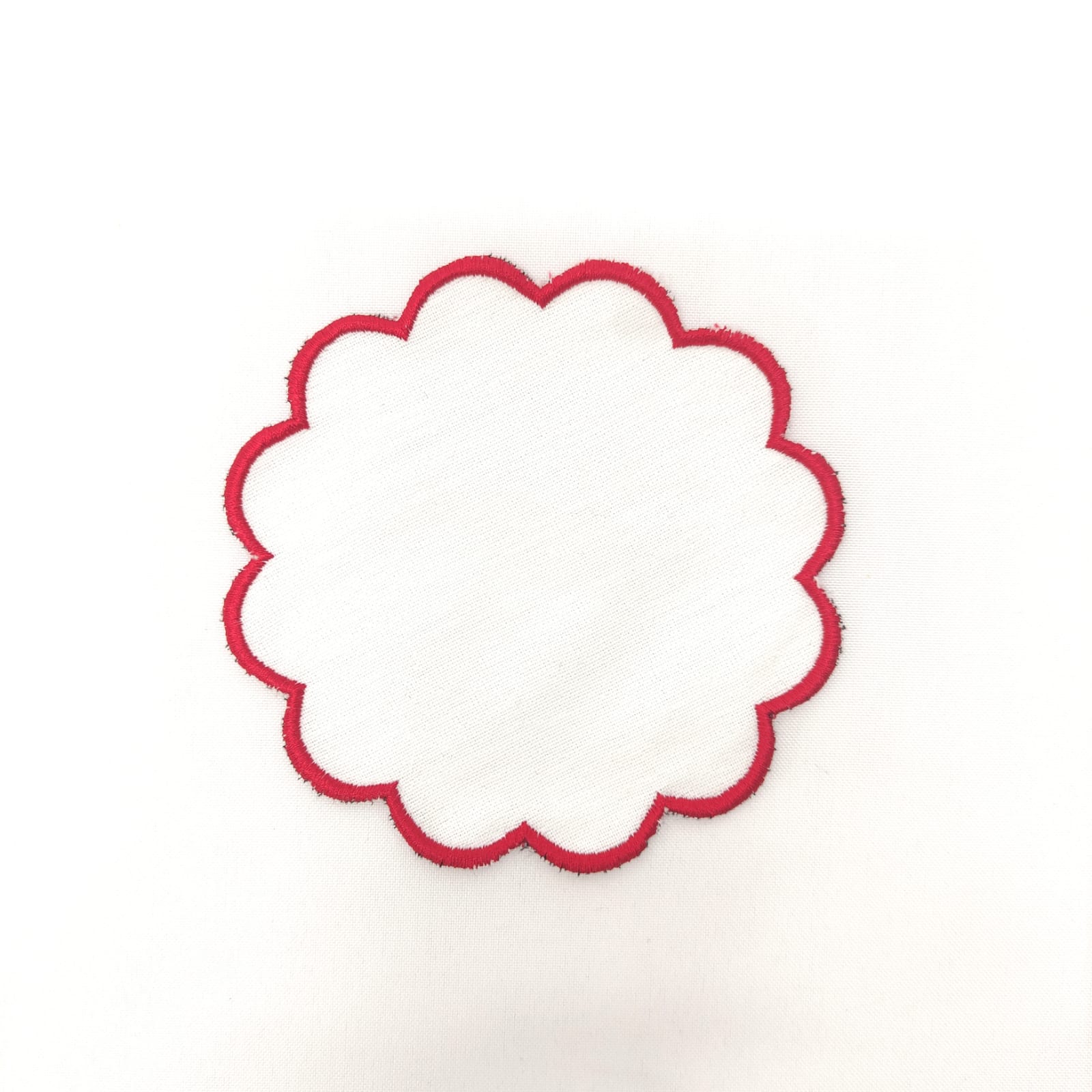 Base para pão/copo em linho branco, 10cm de diâmetro (aprox.), com acabamento em rolinho com ondas.
