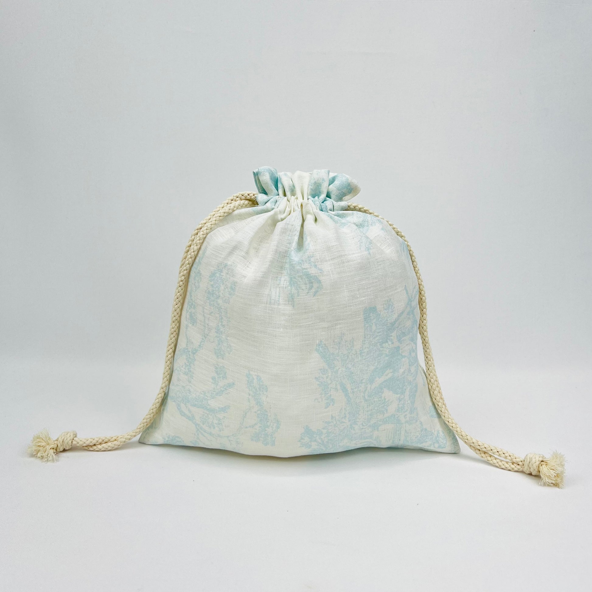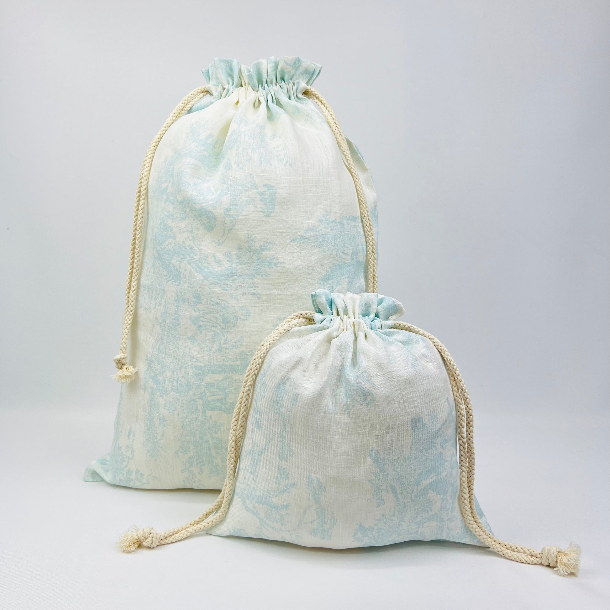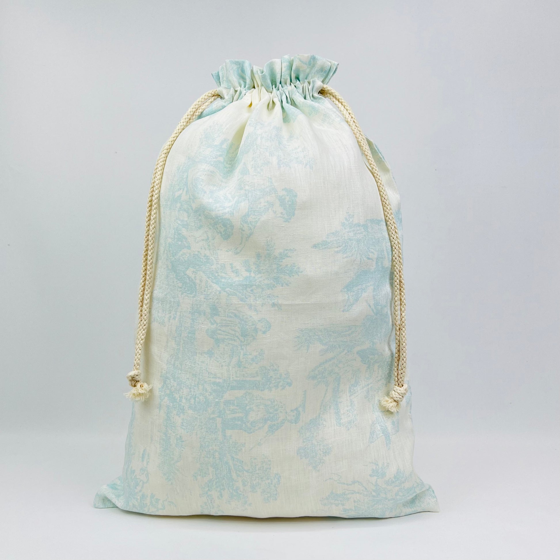 Bolsa de Pão ou Merenda em linho estampado toile de jouy azul baby, disponível em duas medidas.