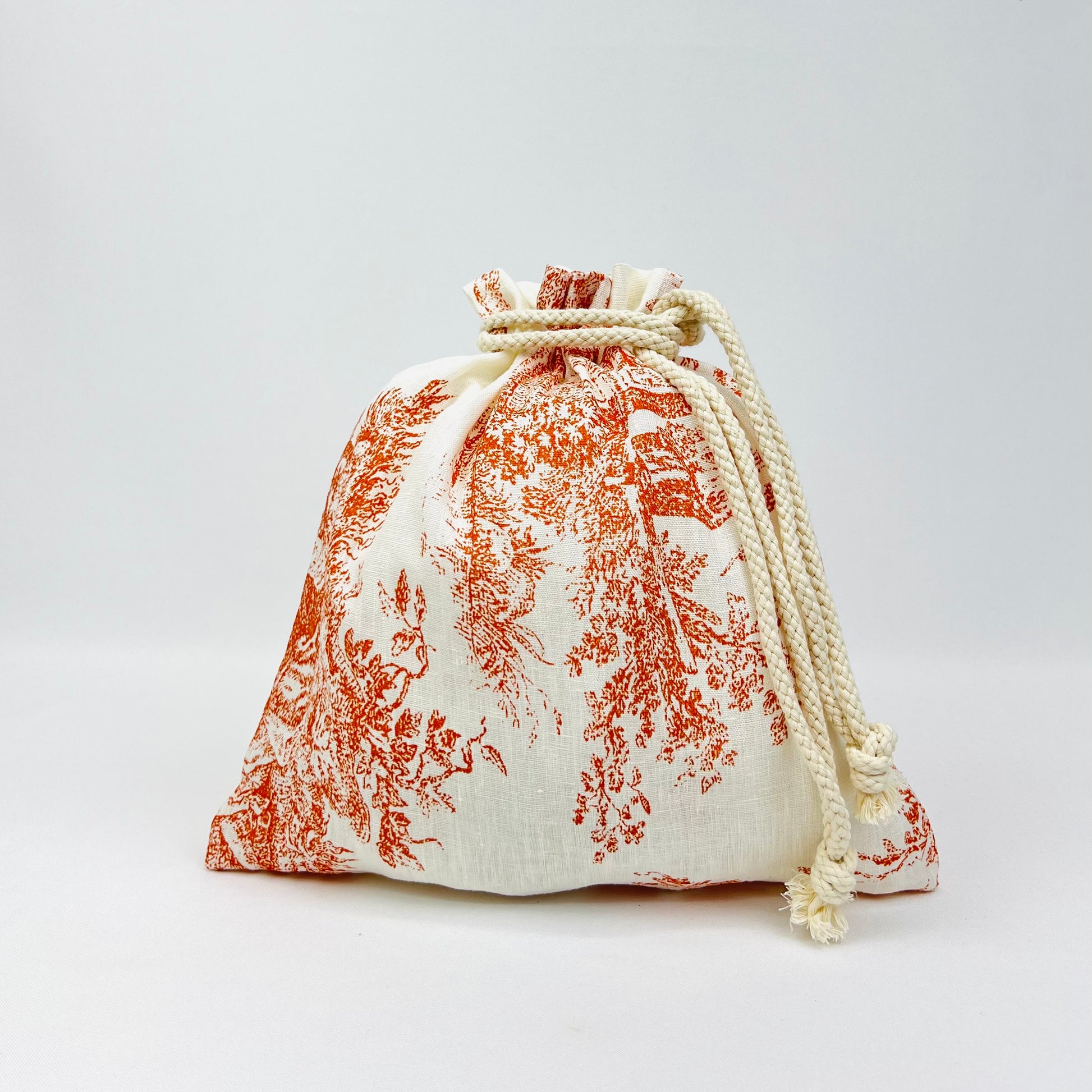 Bolsa de Pão ou Merenda em linho estampado toile de jouy terracota, disponível em duas medidas.