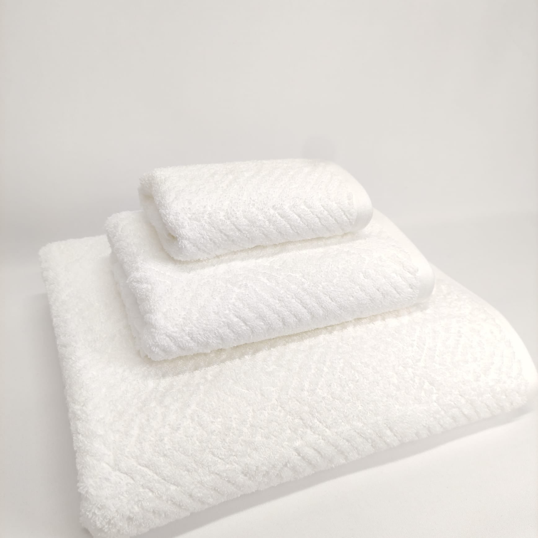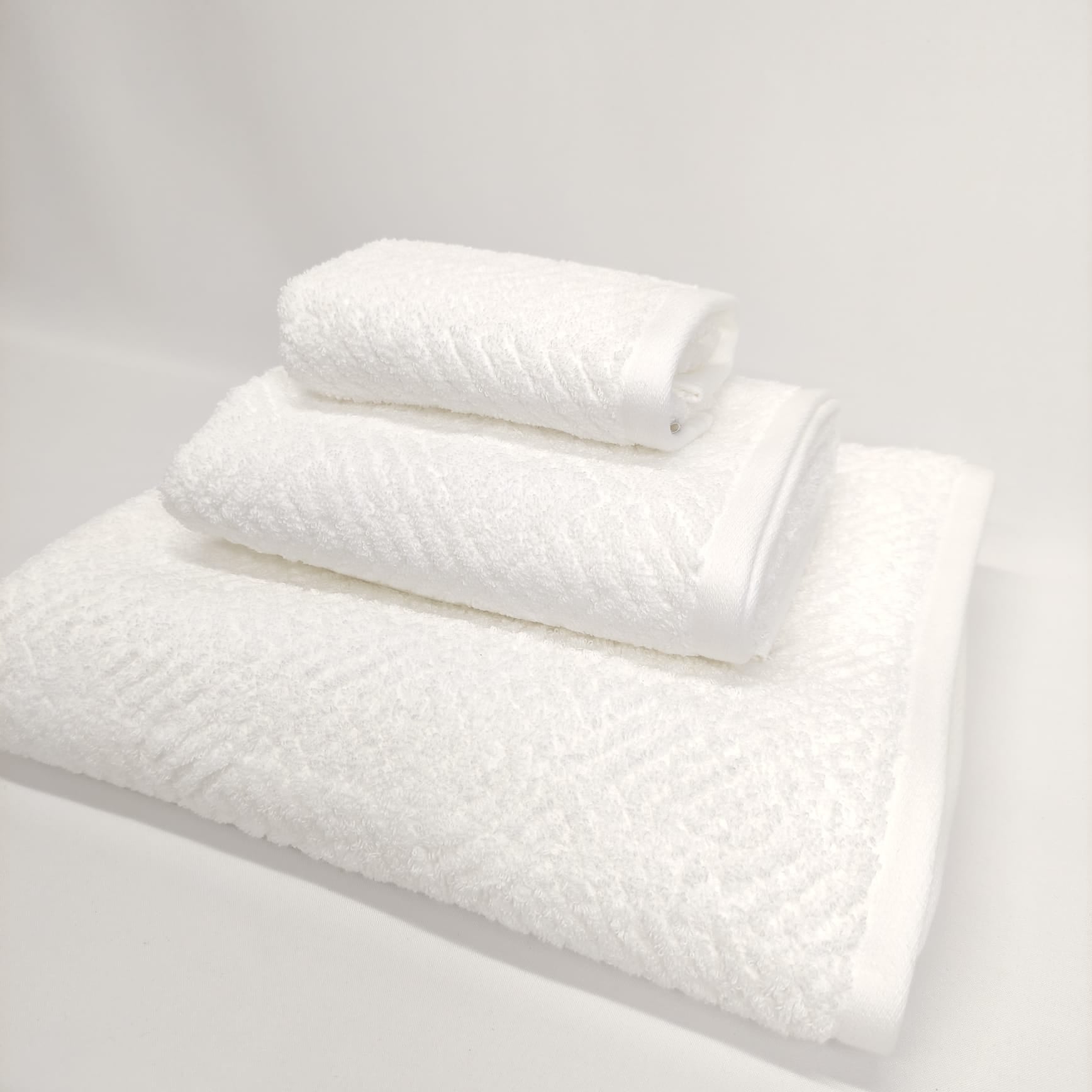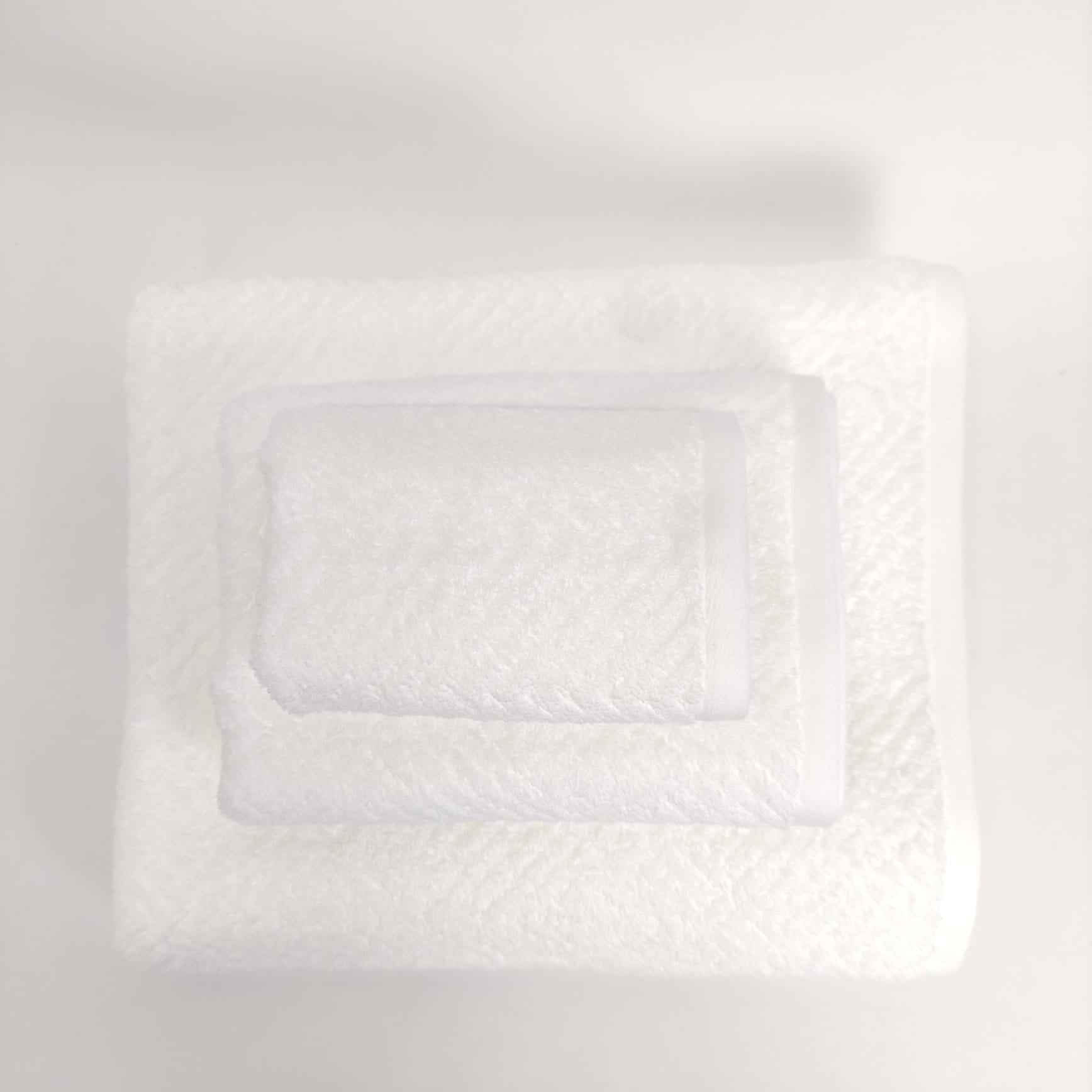 Toalhas de banho em felpo de algodão branco, disponível em várias medidas.