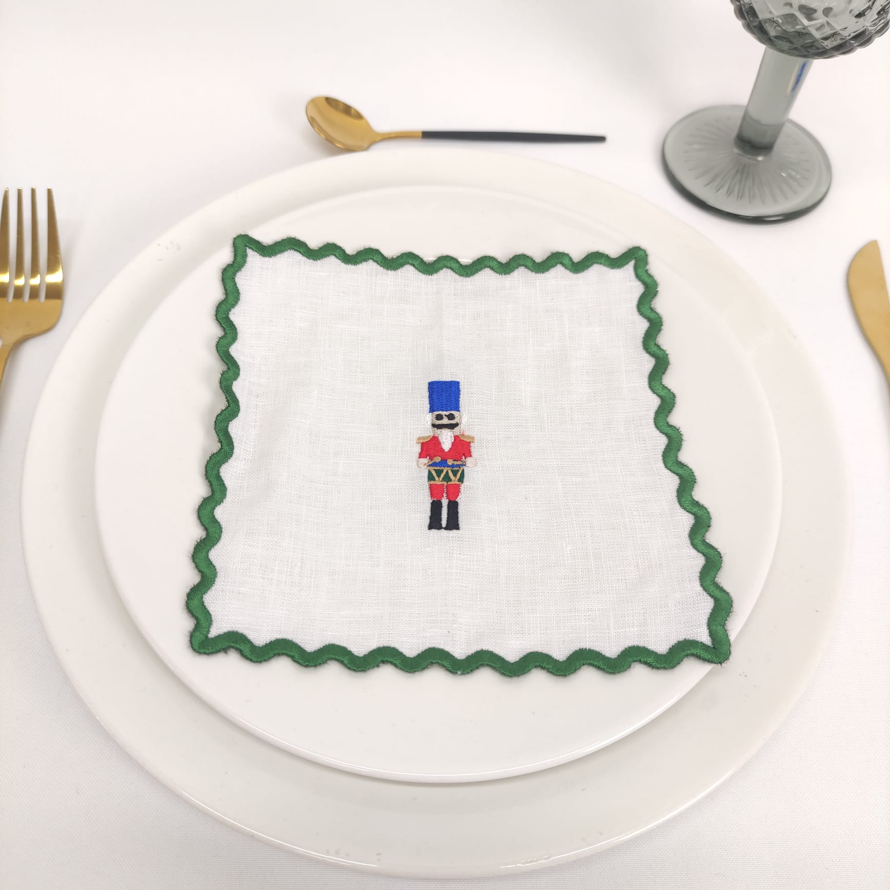 Guardanapo cocktail em linho branco, 15x15cm, c/ bordado e acabamento em rolinho às ondas.