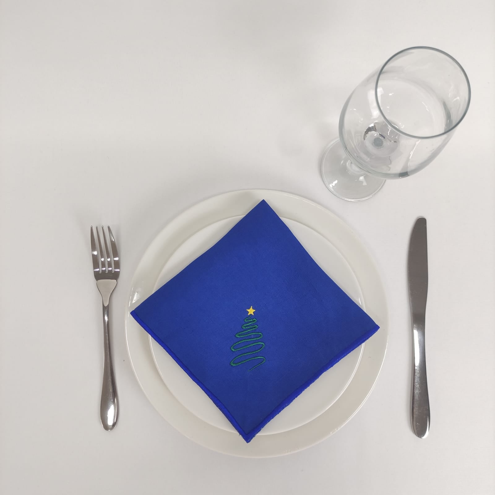 Guardanapo em linho azul, 30x30 cm, c/ acabamento em rolinho e bordado de Natal, disponível em verde ou vermelho.