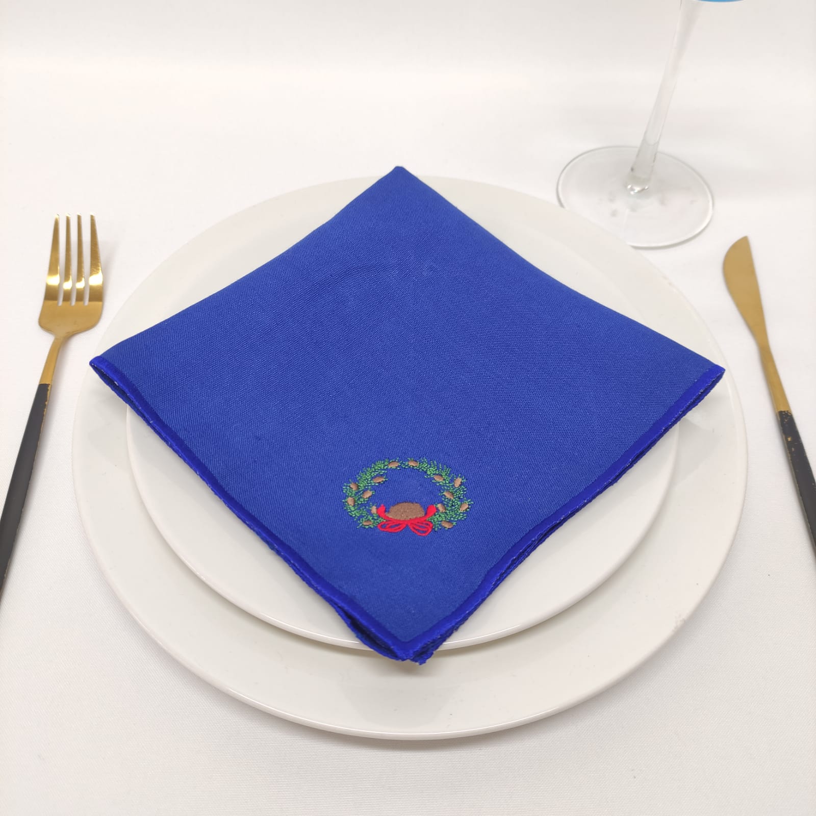Guardanapo em linho azul, 30x30 cm, com acabamento em rolinho e bordado natalício.