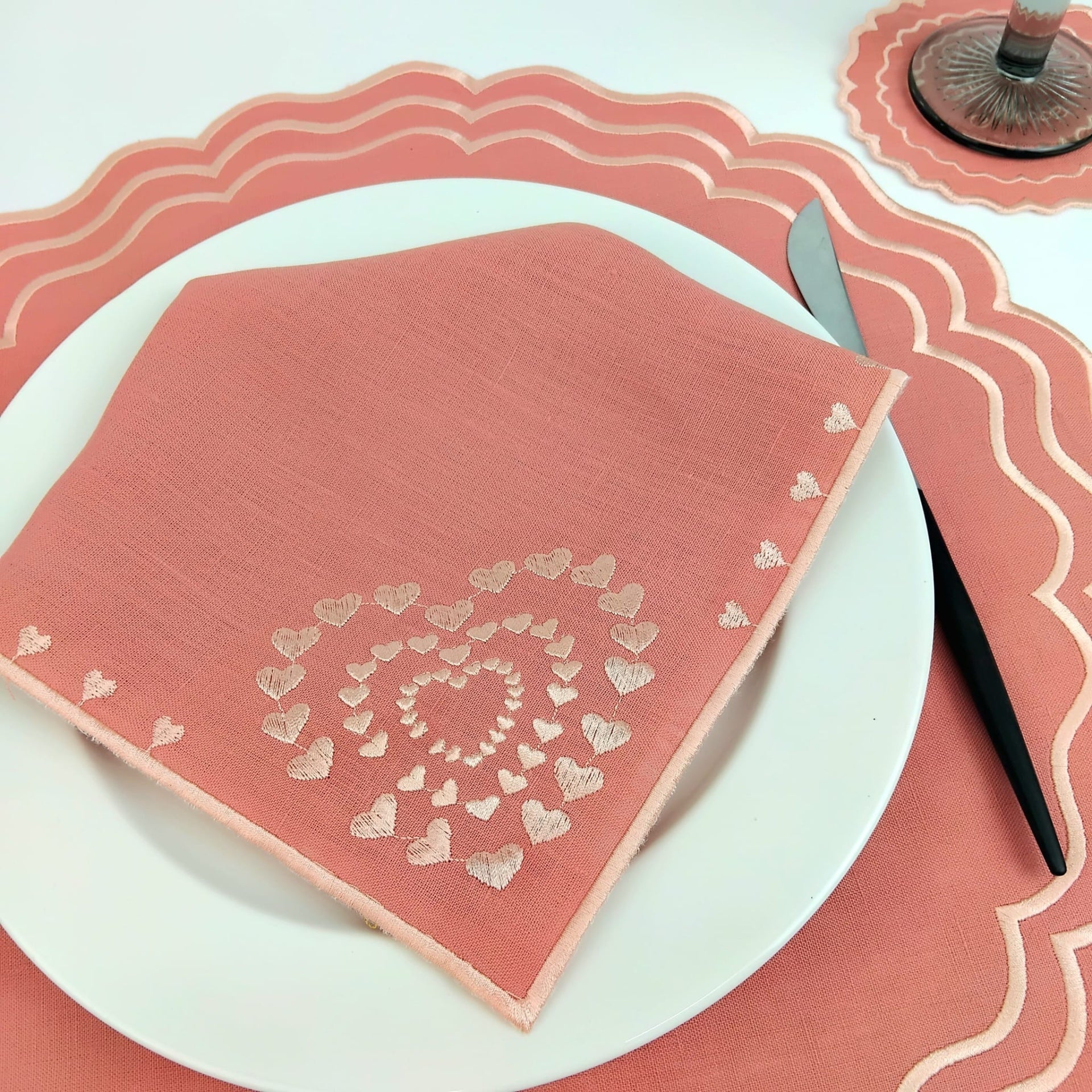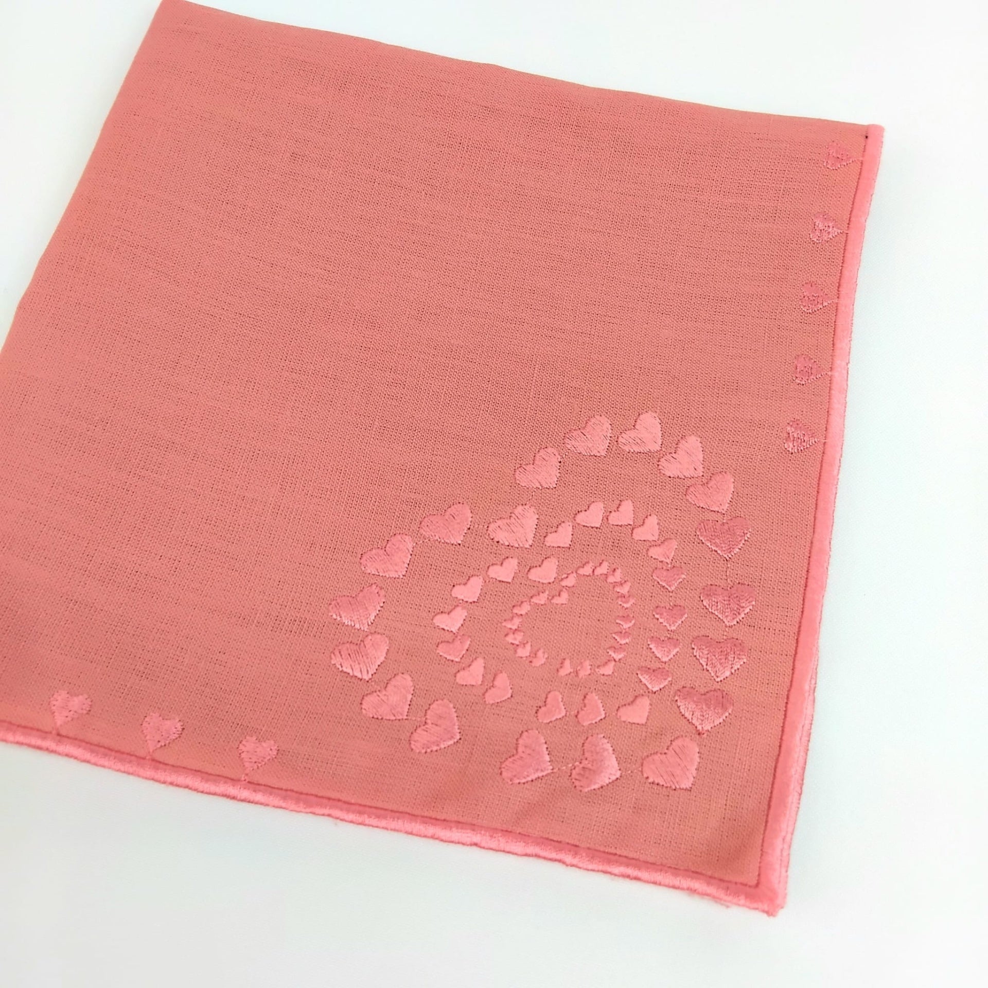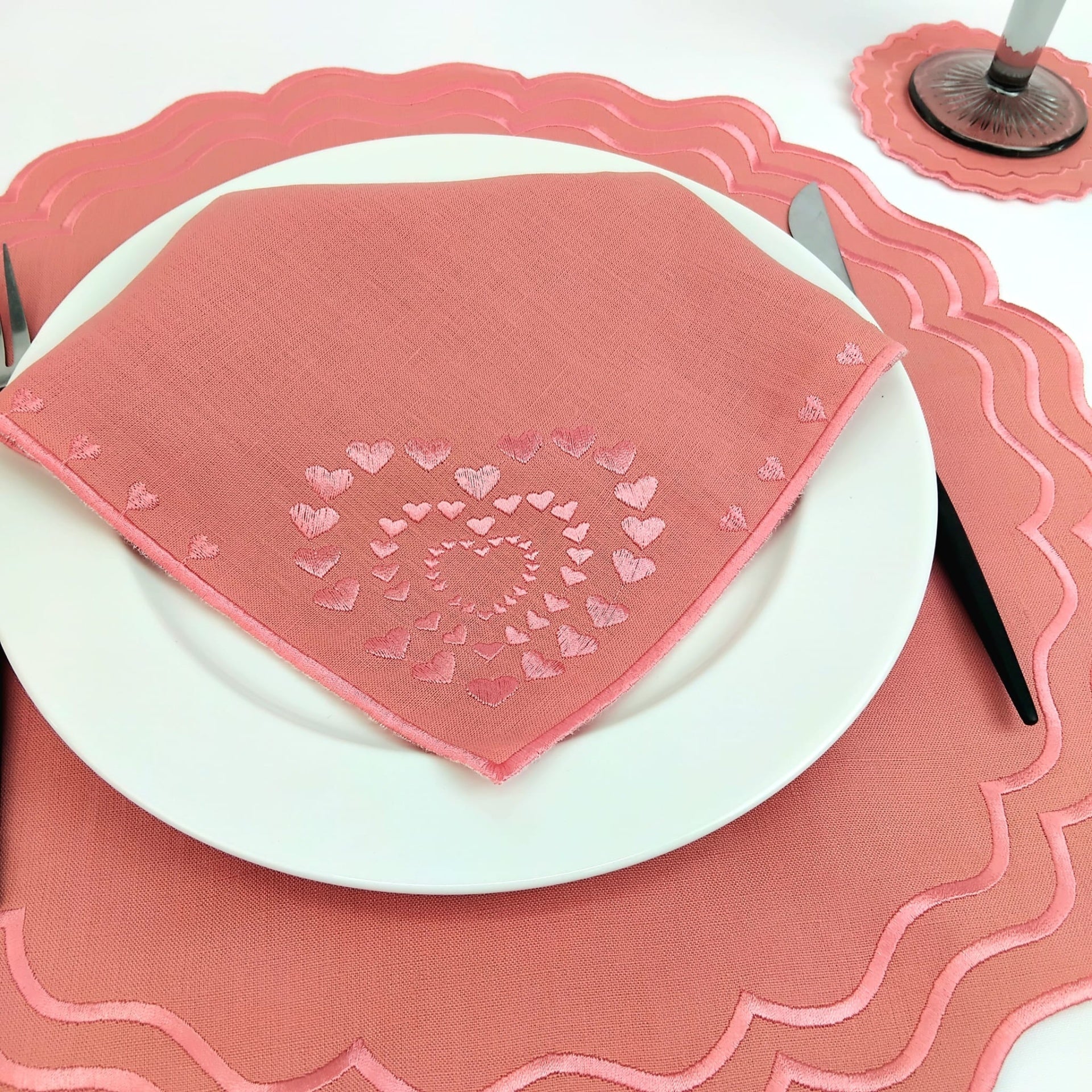 Guardanapo em linho salmão, c/ acabamento em rolinho, disponível em várias cores.
