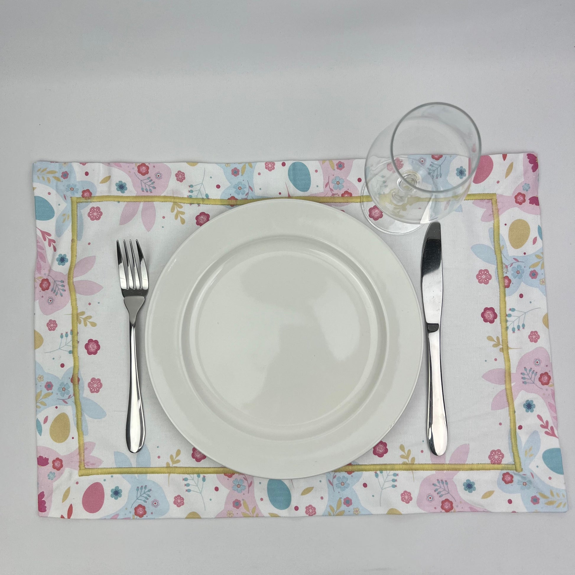 Individual em algodão, 35x50 cm aprox., c/ estampado digital e acabamento em rolinho amarelo ou azul.