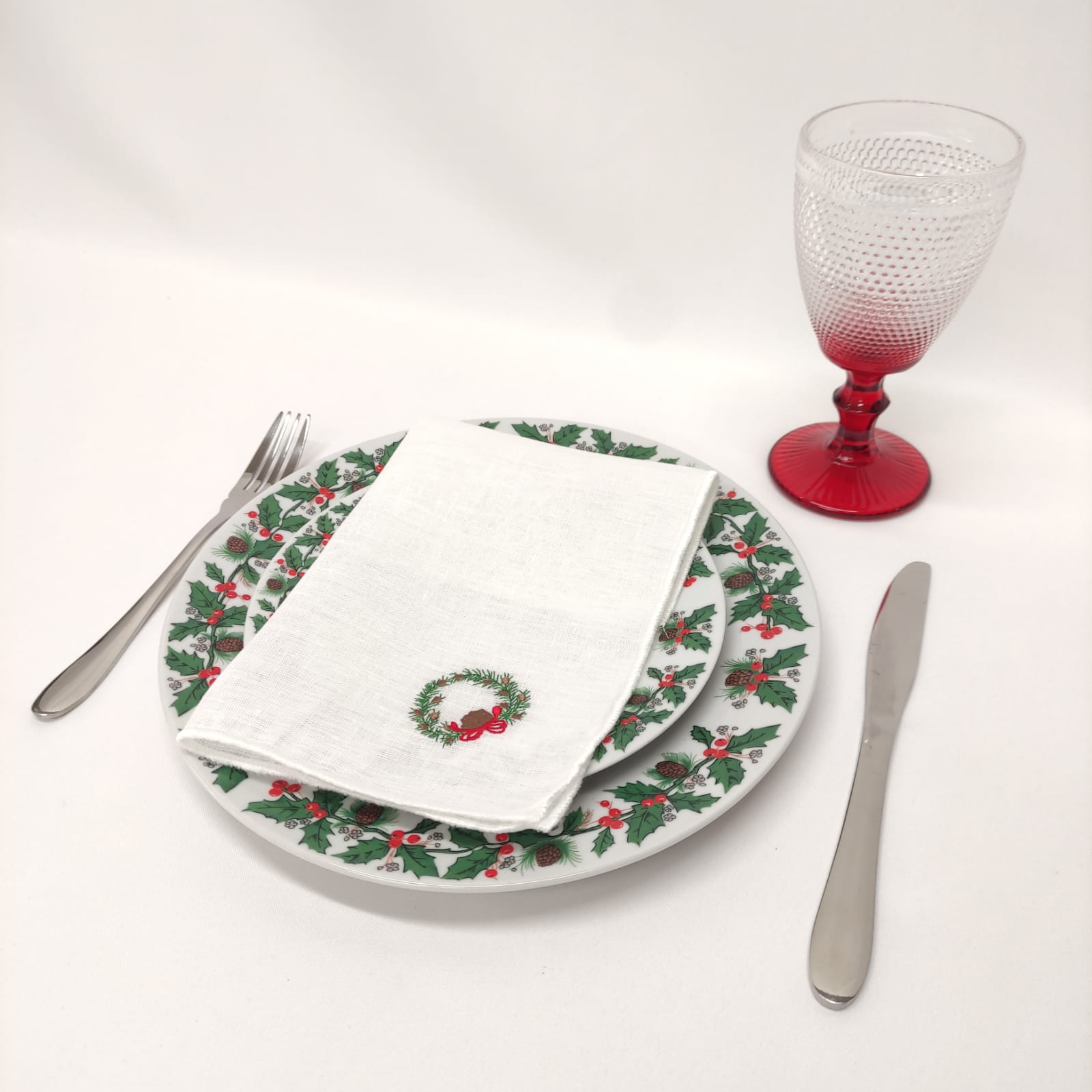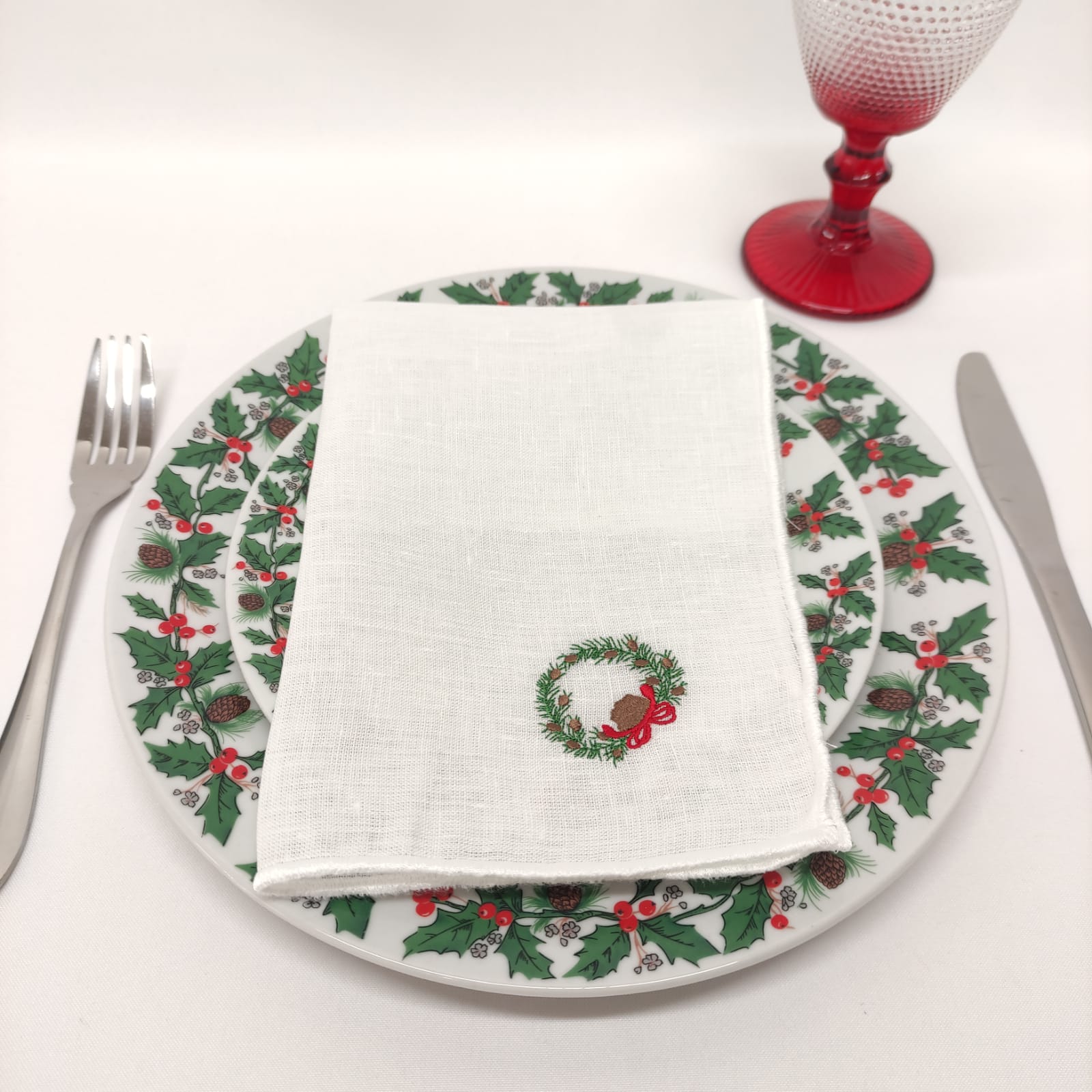 Guardanapo em linho branco, 30x30 cm, c/ acabamento em rolinho branco e bordado natalício.