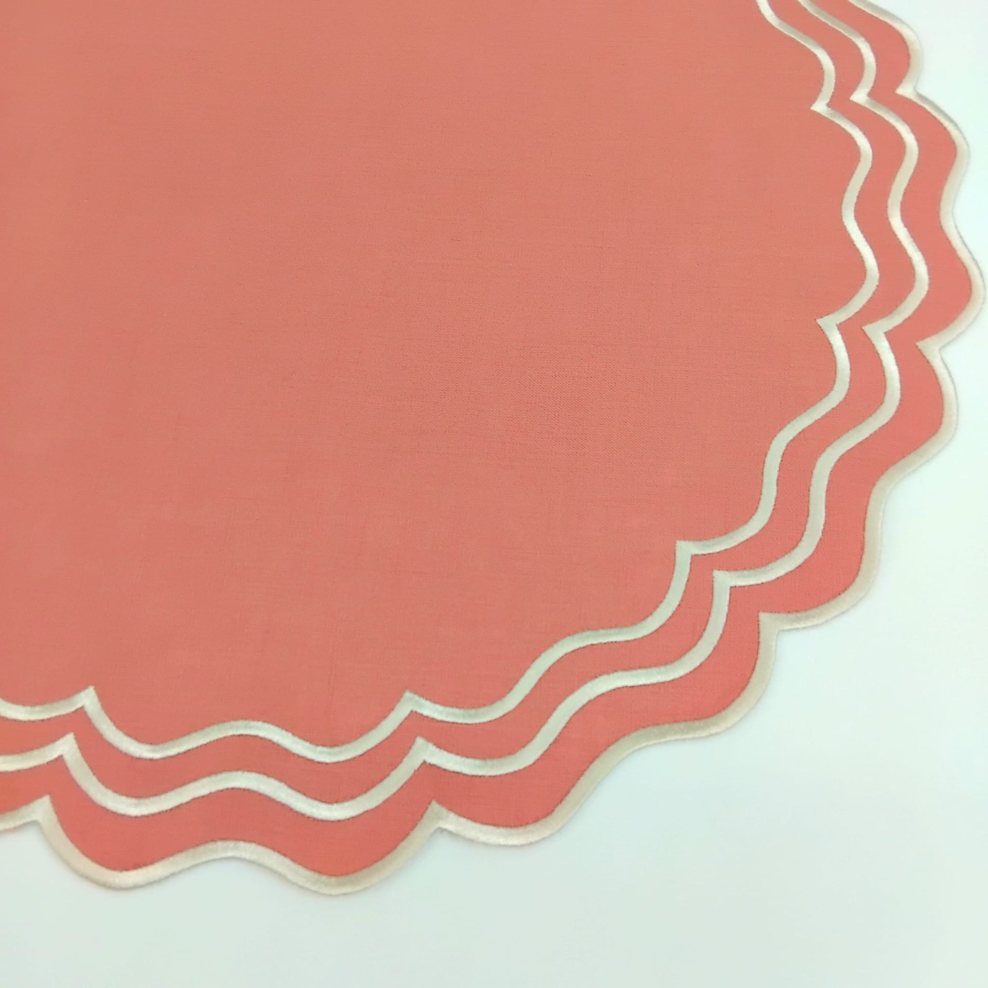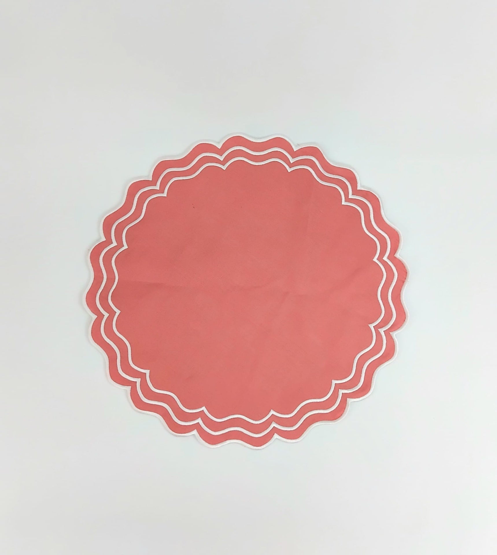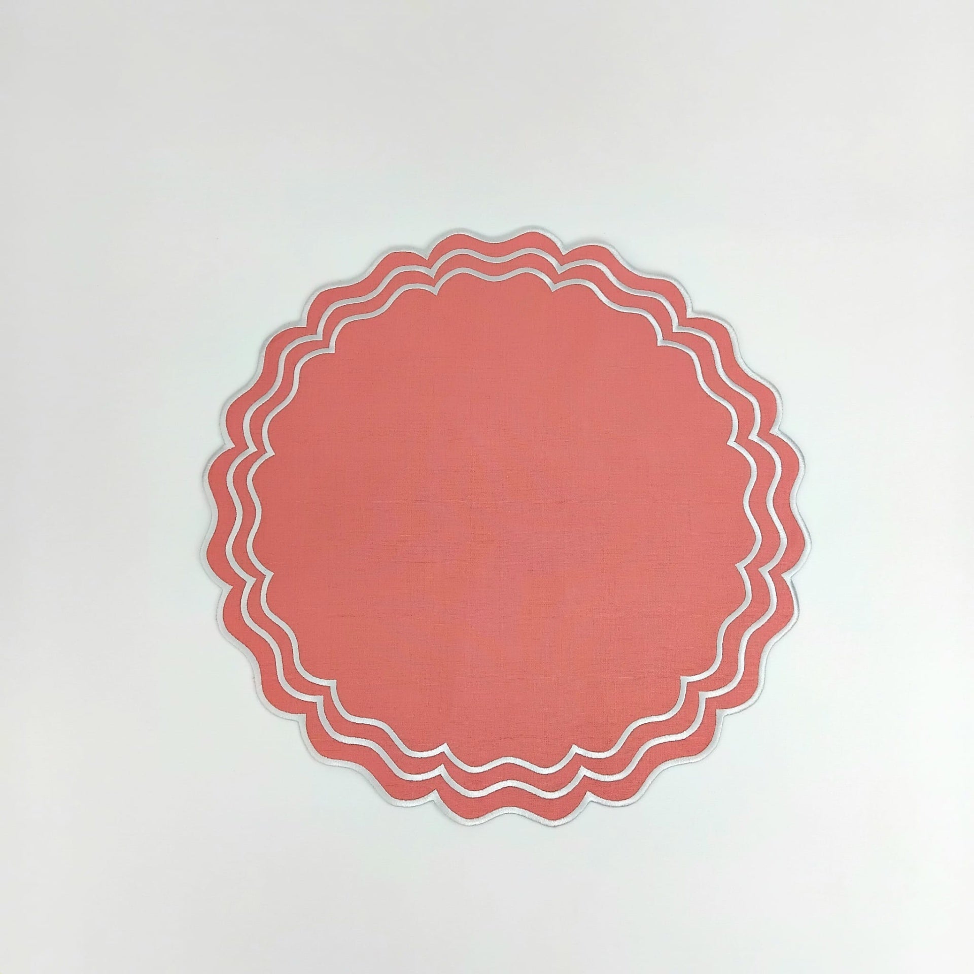 Individual em linho salmão, 45cm de diâmetro, c/ acabamento em rolinho.