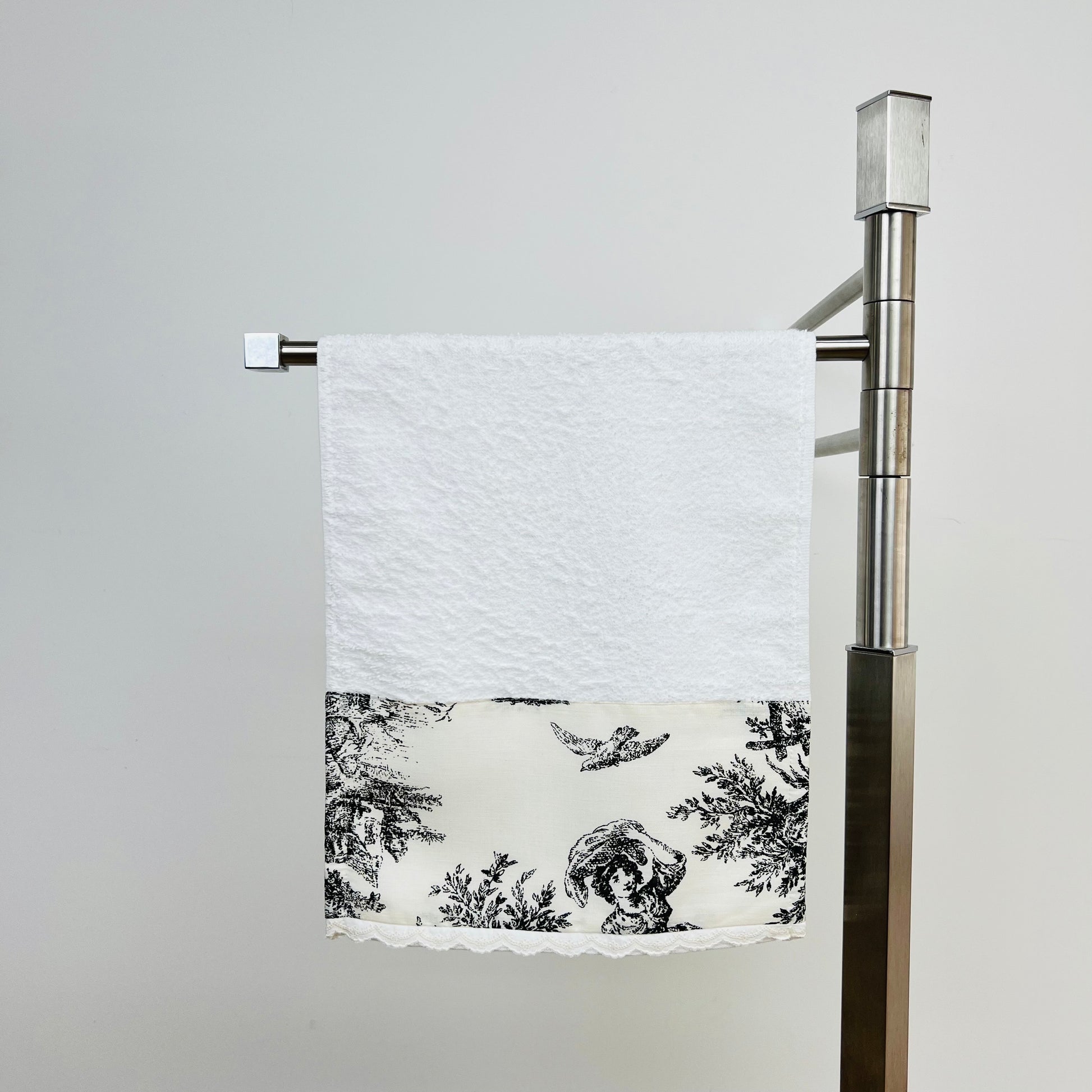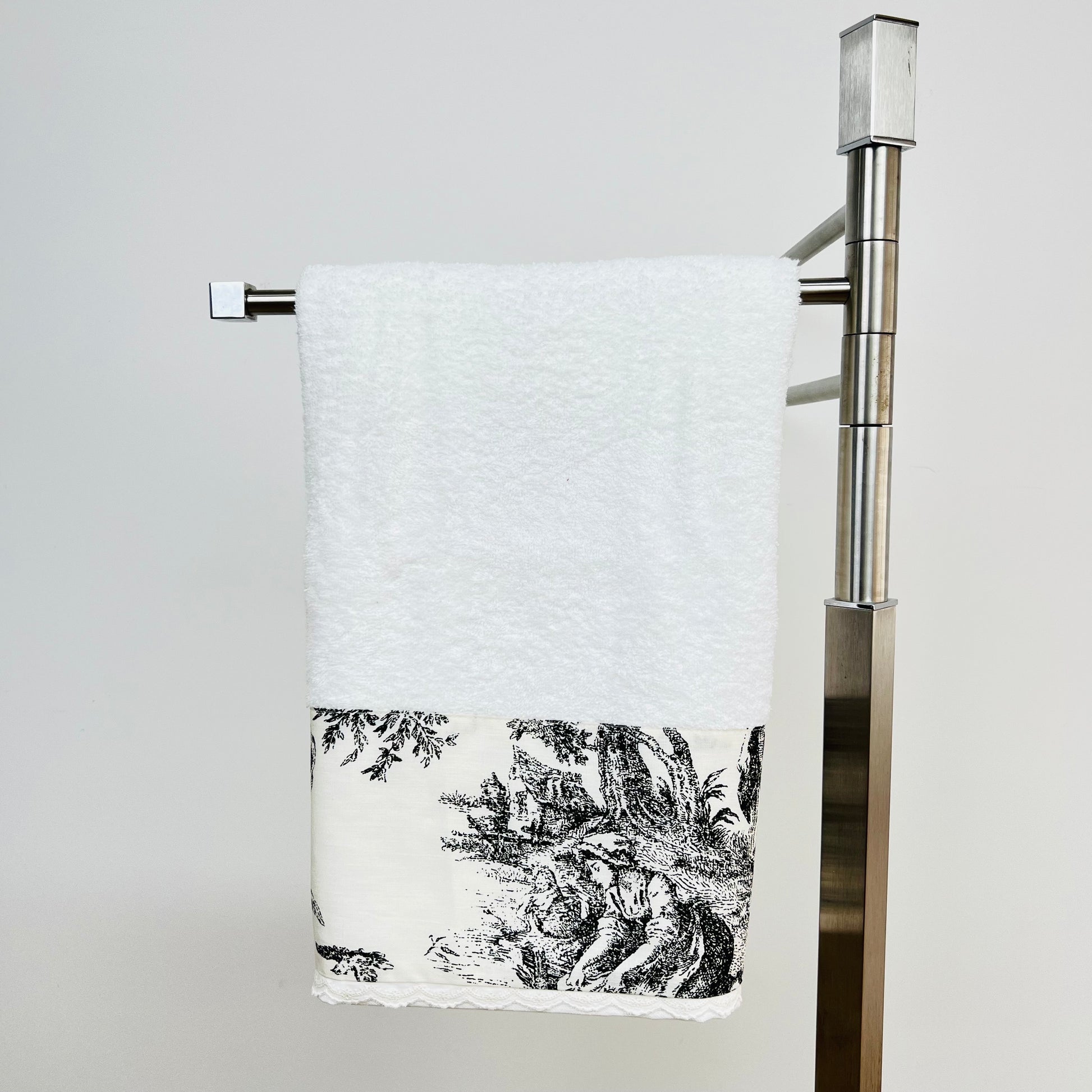 Toalhas em felpo de algodão branco, com pormenor do intemporal estampado Toile de Jouy.