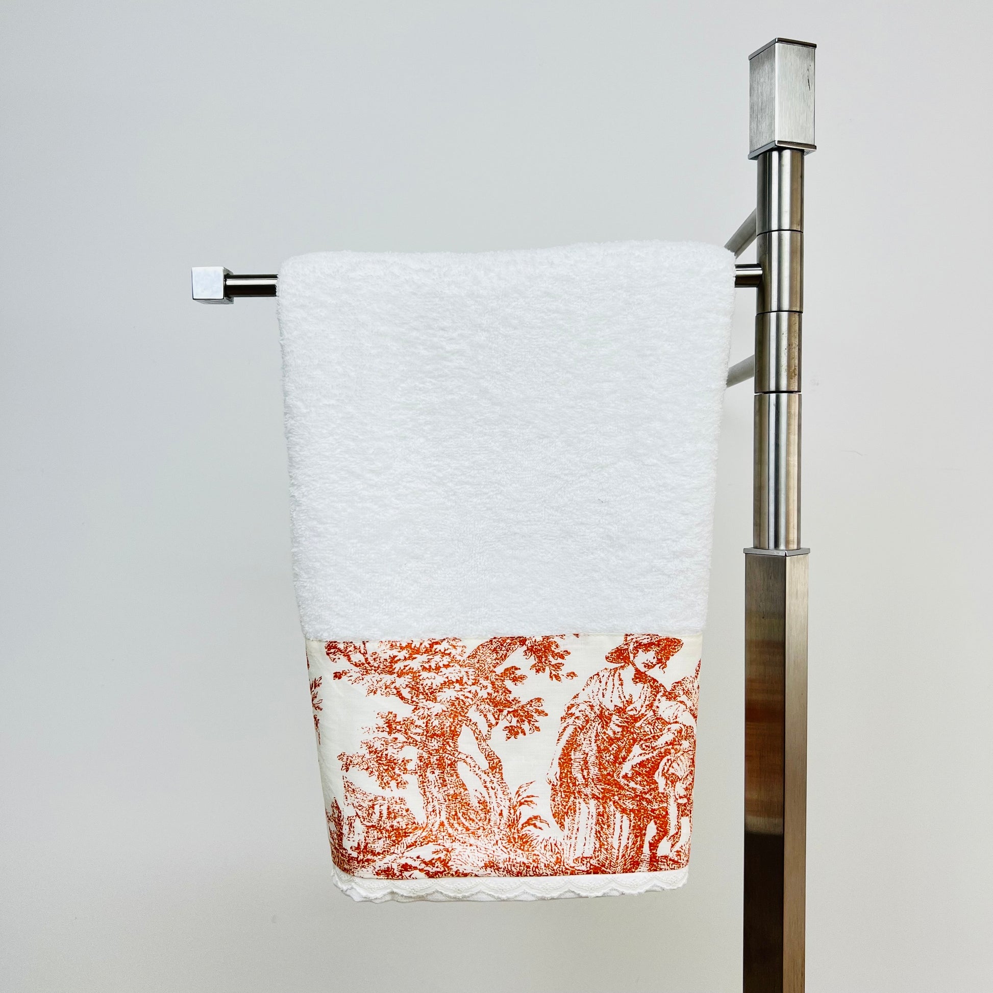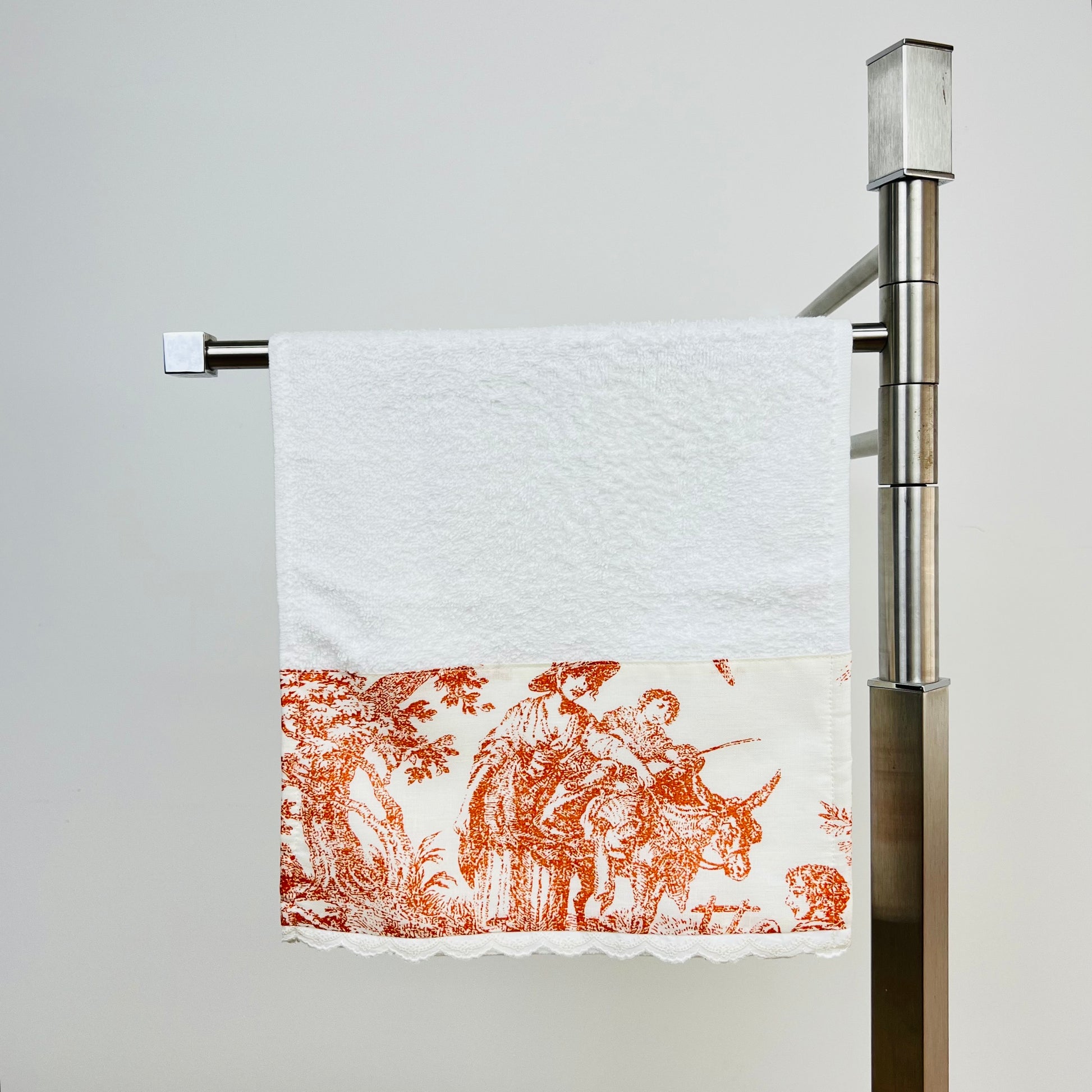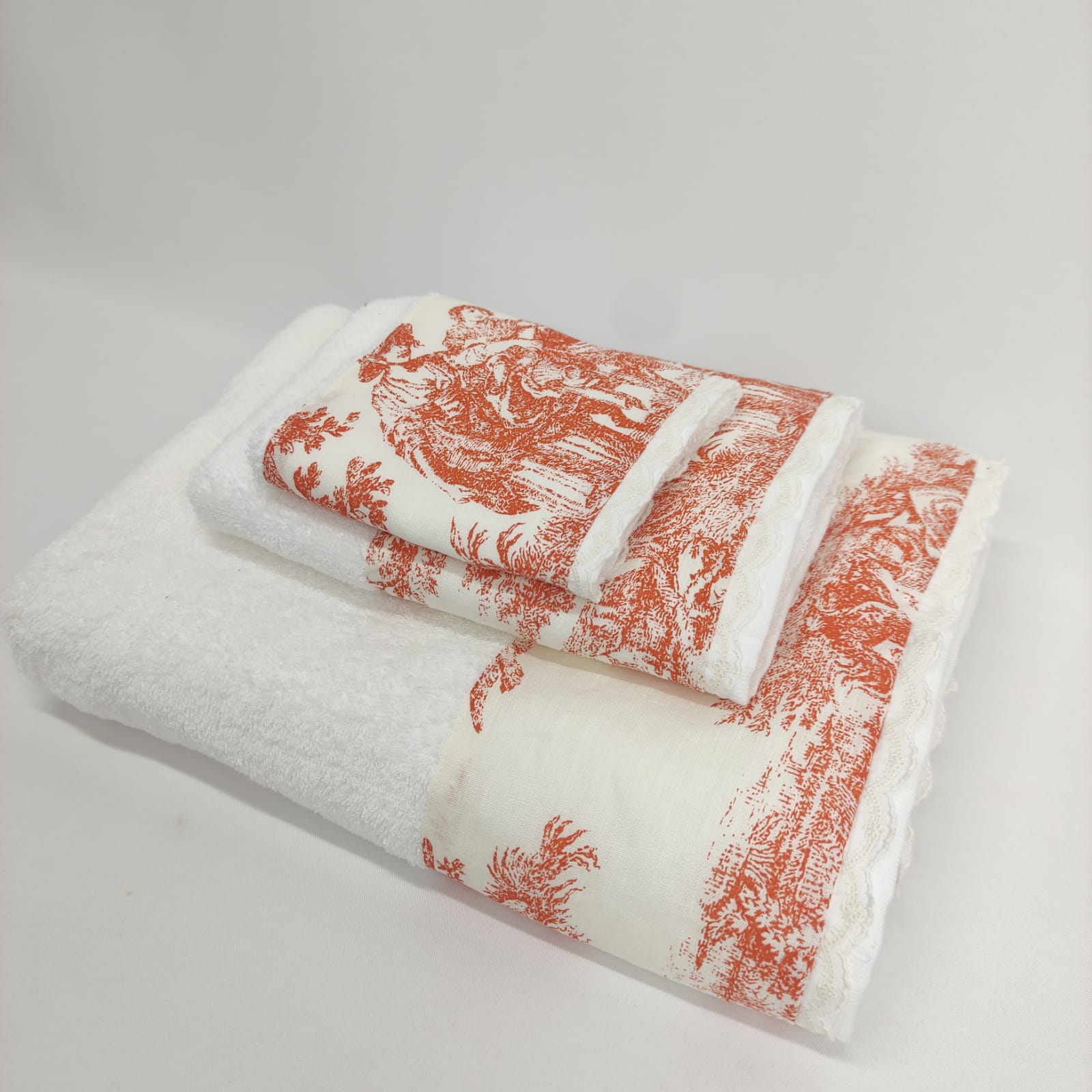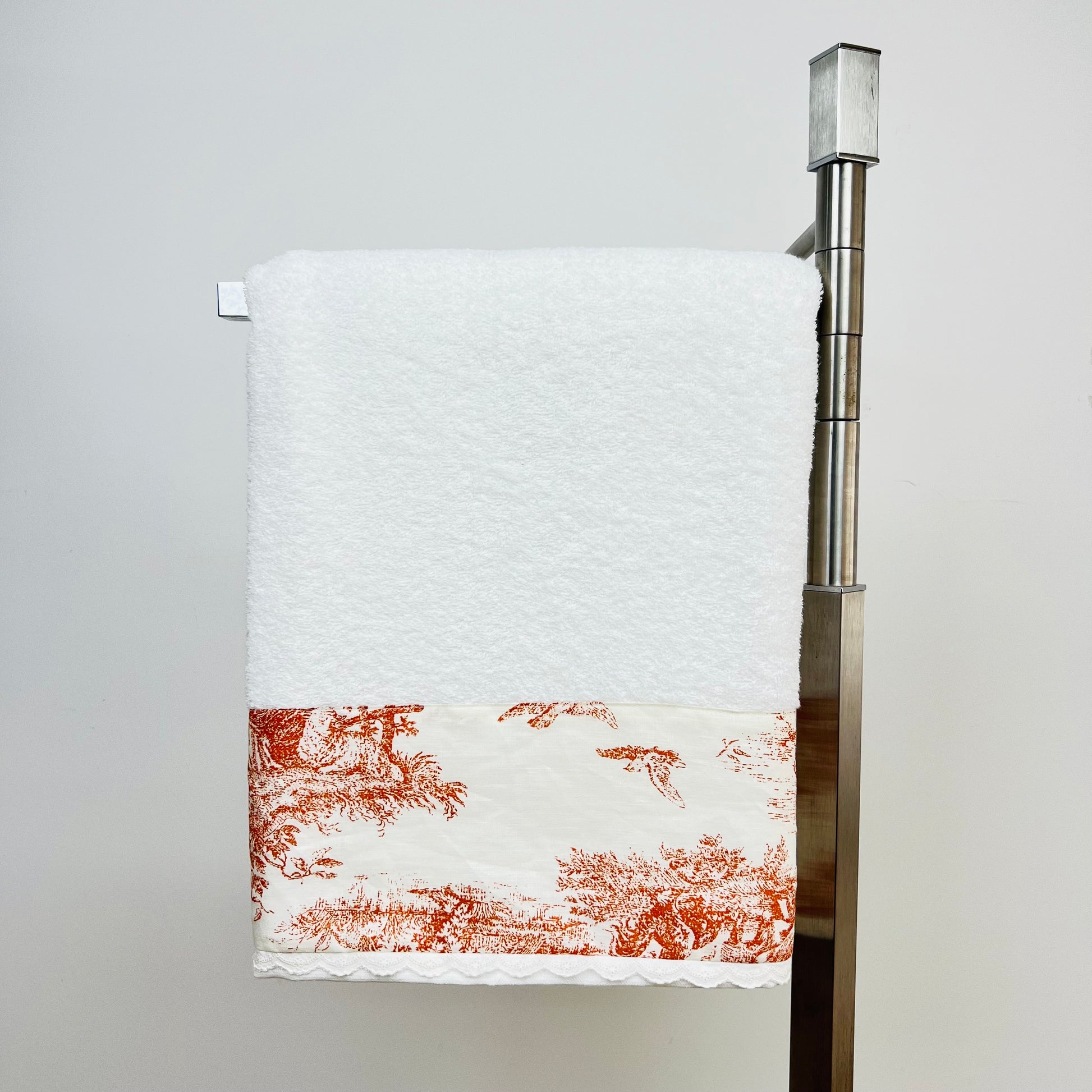 Toalhas em felpo de algodão branco, com pormenor do intemporal estampado Toile de Jouy.