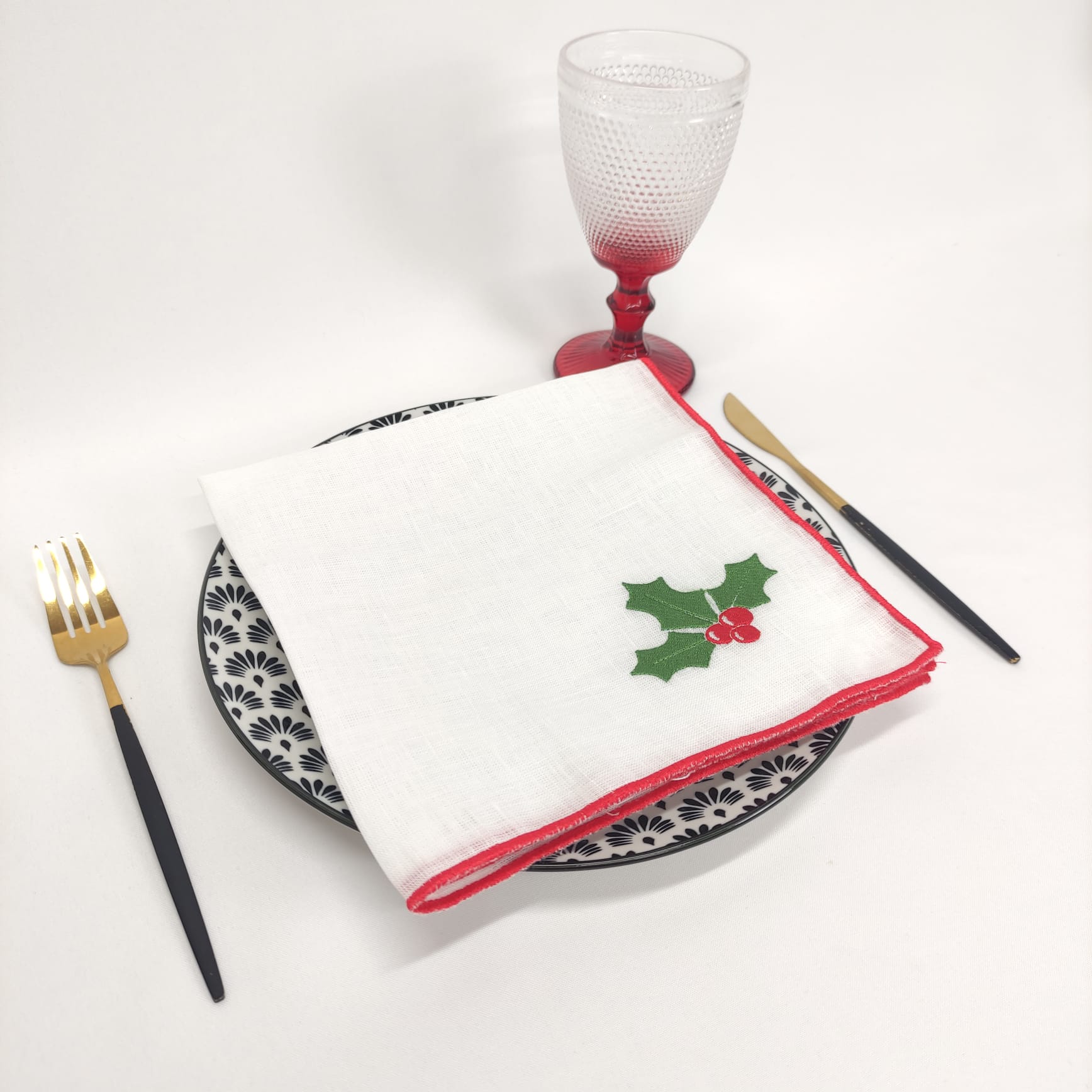 Guardanapo em linho branco, 40x40cm, c/bordado de Natal e acabamento em rolinho vermelho.