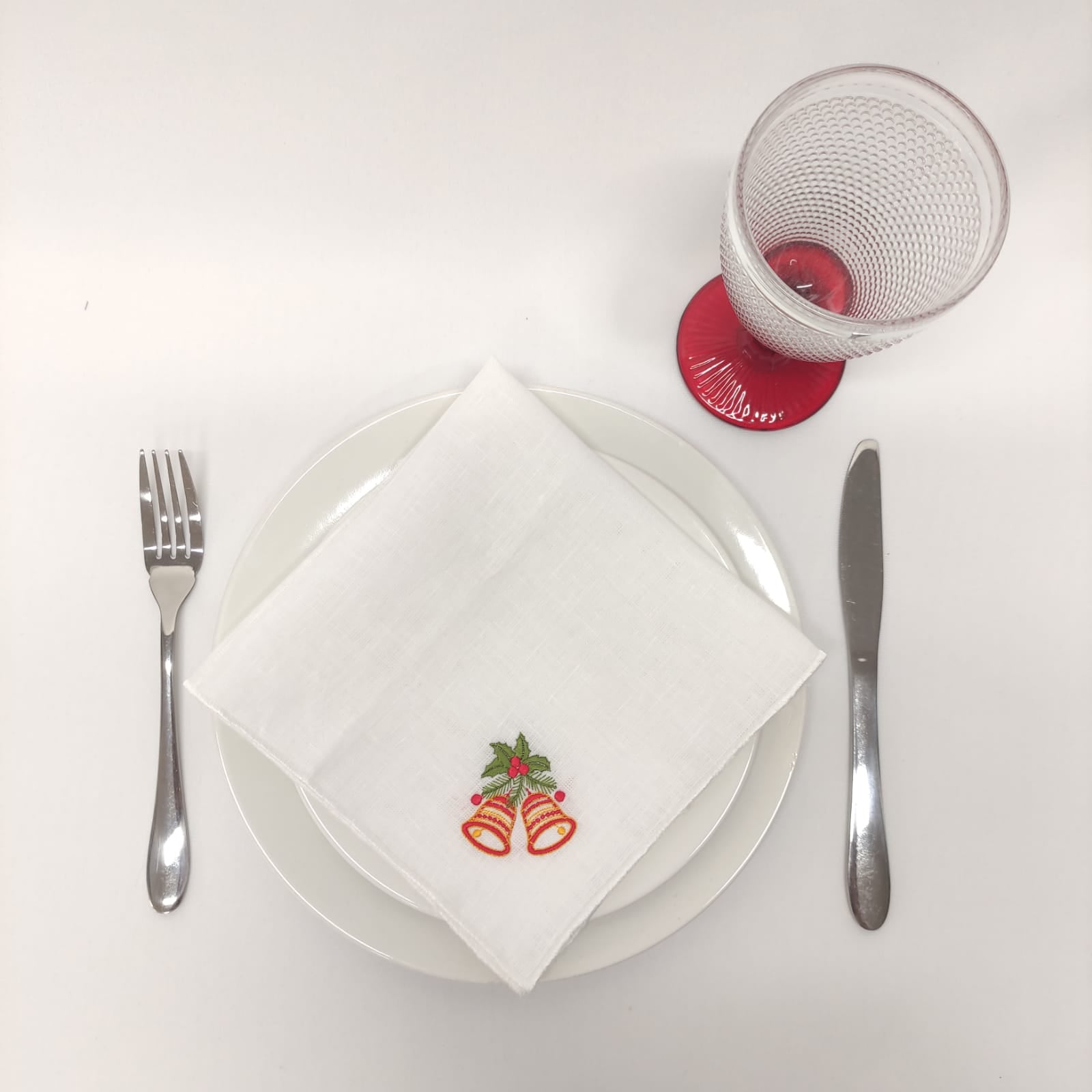 Guardanapo linho branco, com bordado natalício e acabamento de rolinho.