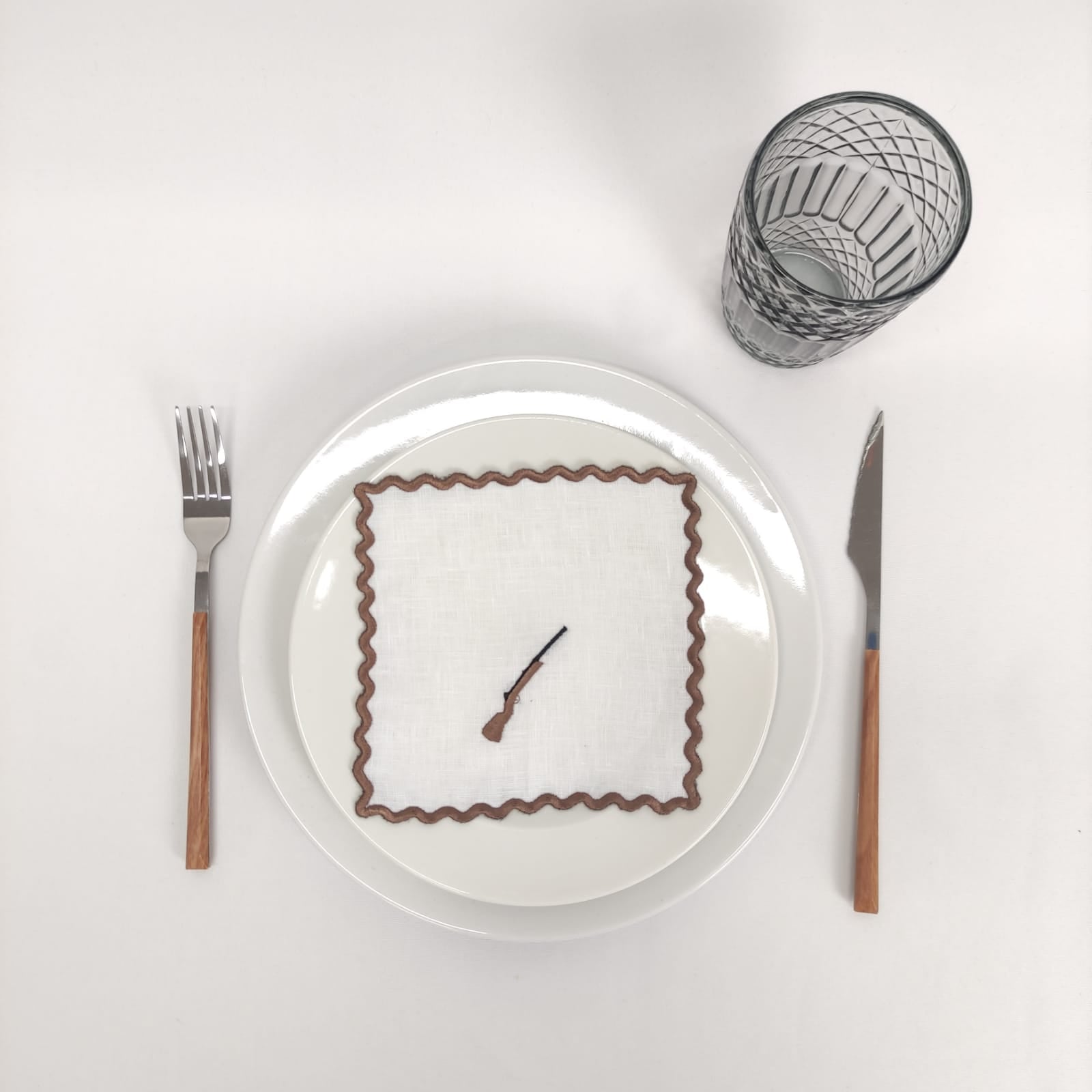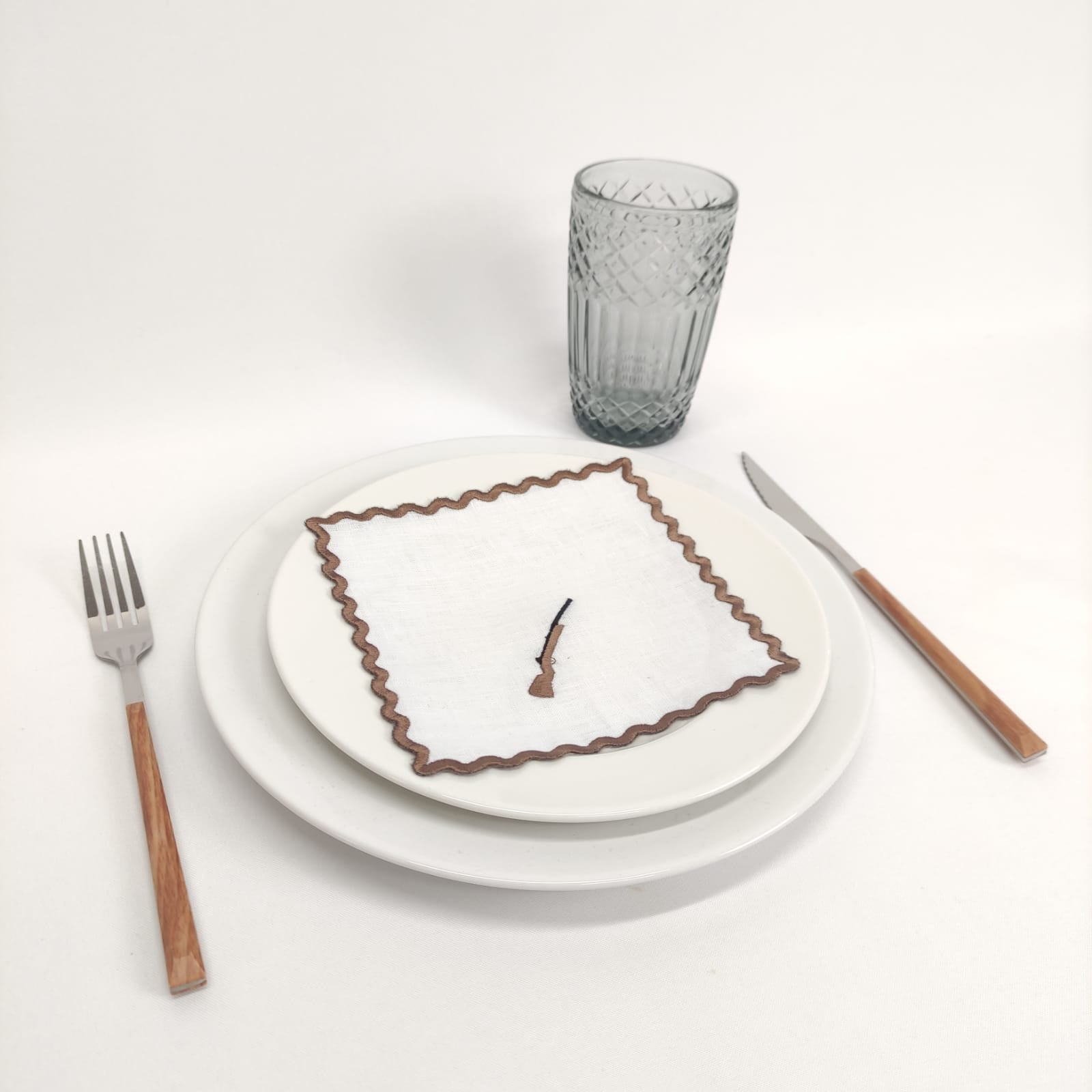 Guardanapo cocktail em linho branco, 15x15cm, c/bordado e acabamento em rolinho às ondas.