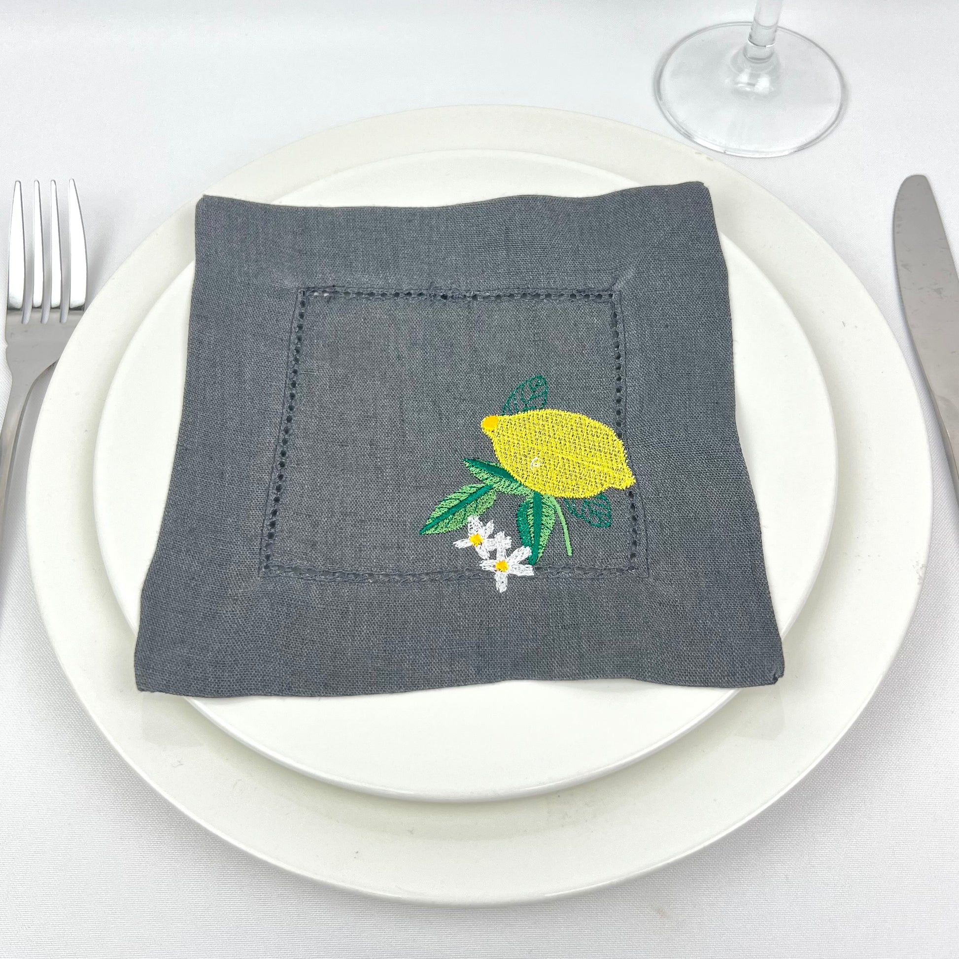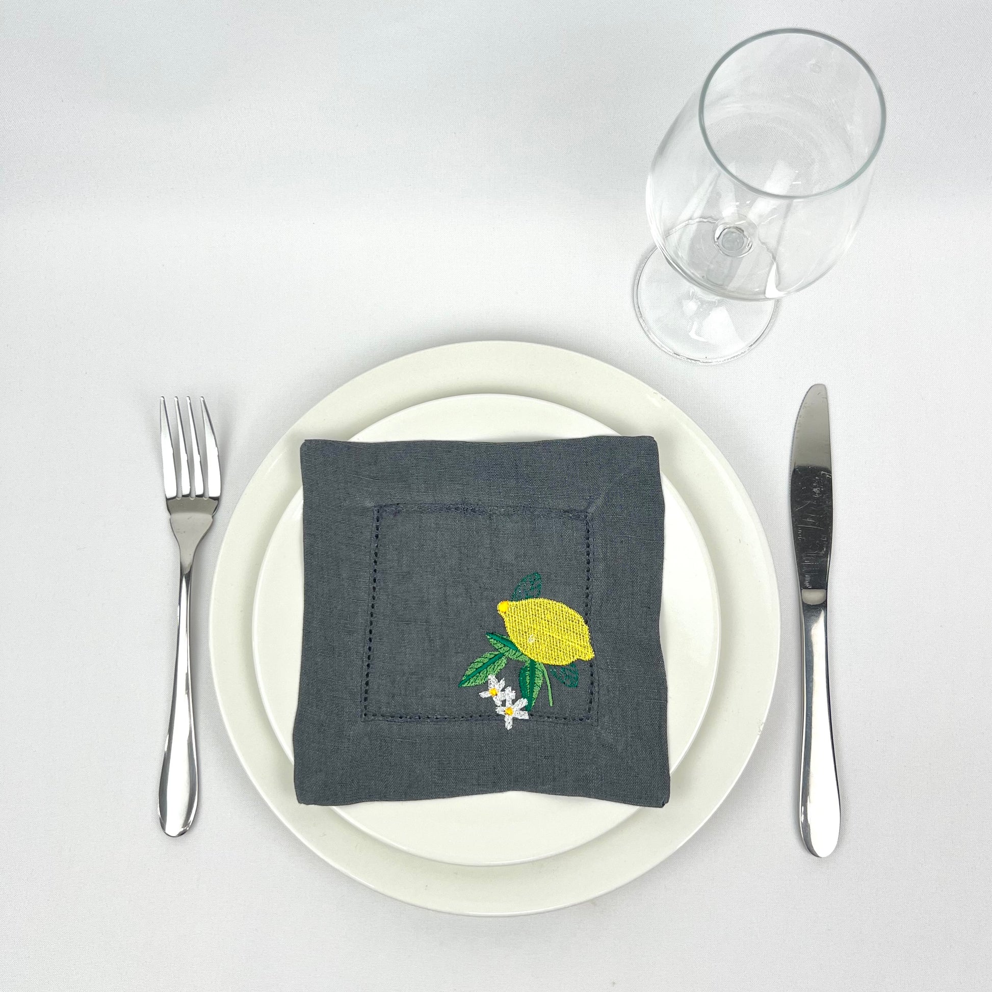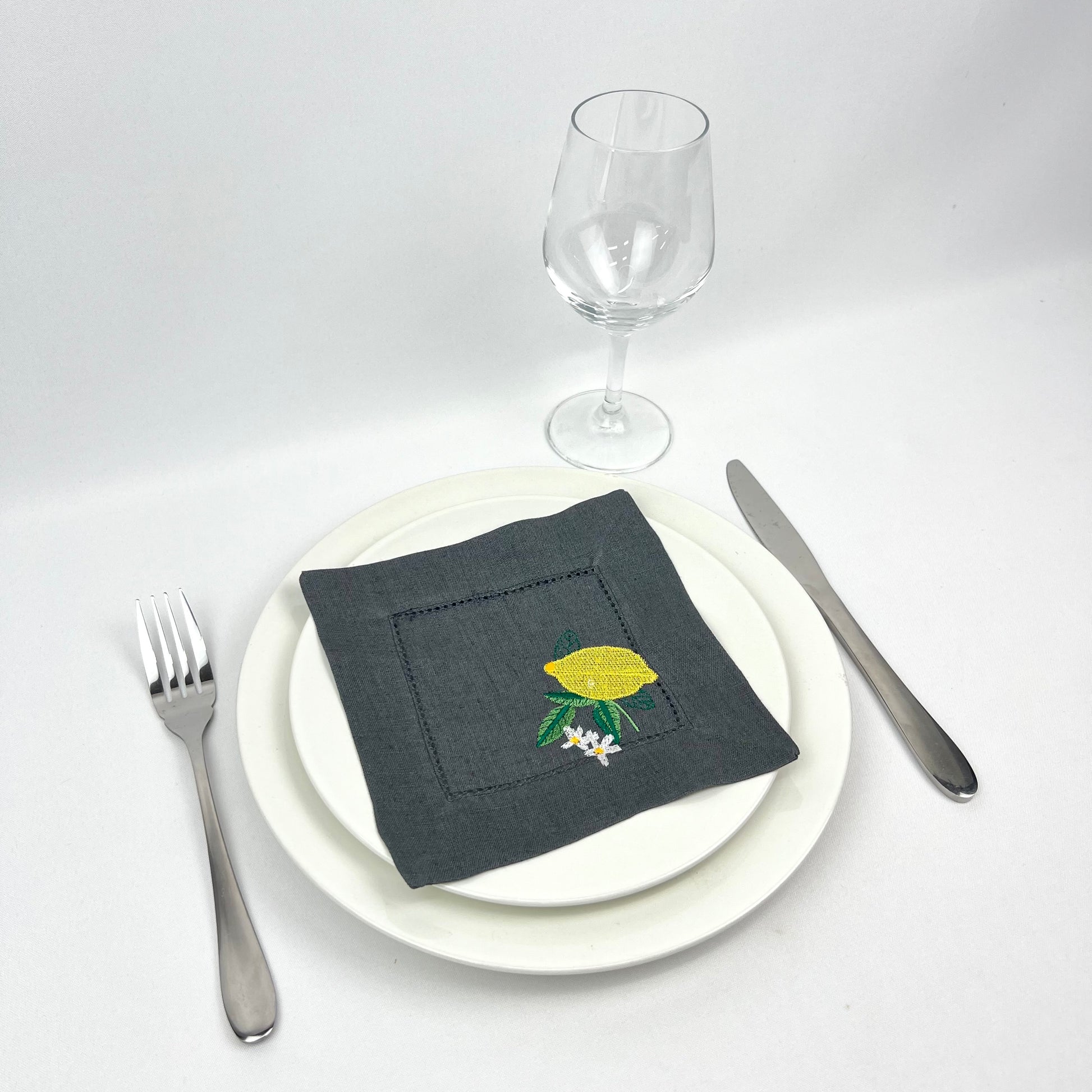 Guardanapo Cocktail em linho cinza com delicado bordado
