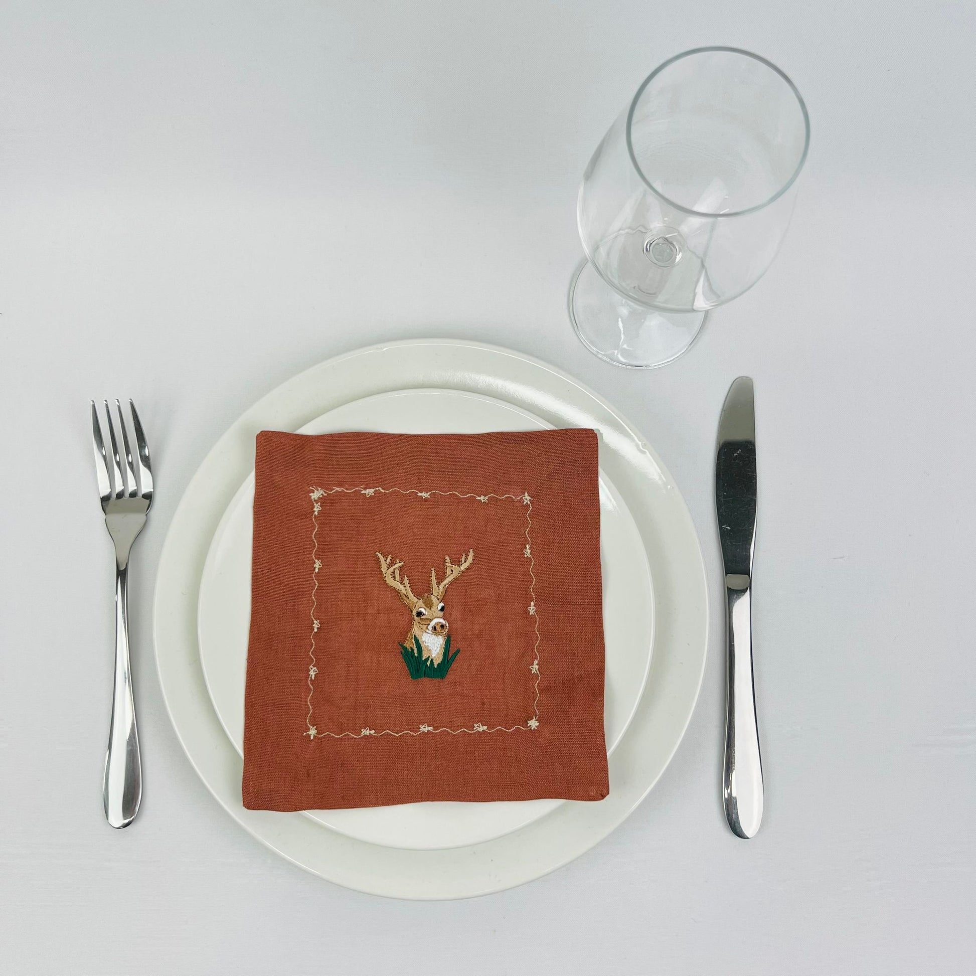 Guardanapo Cocktail em linho, 15x15cm, c/ bordado natalício acabamento ponto estrela.