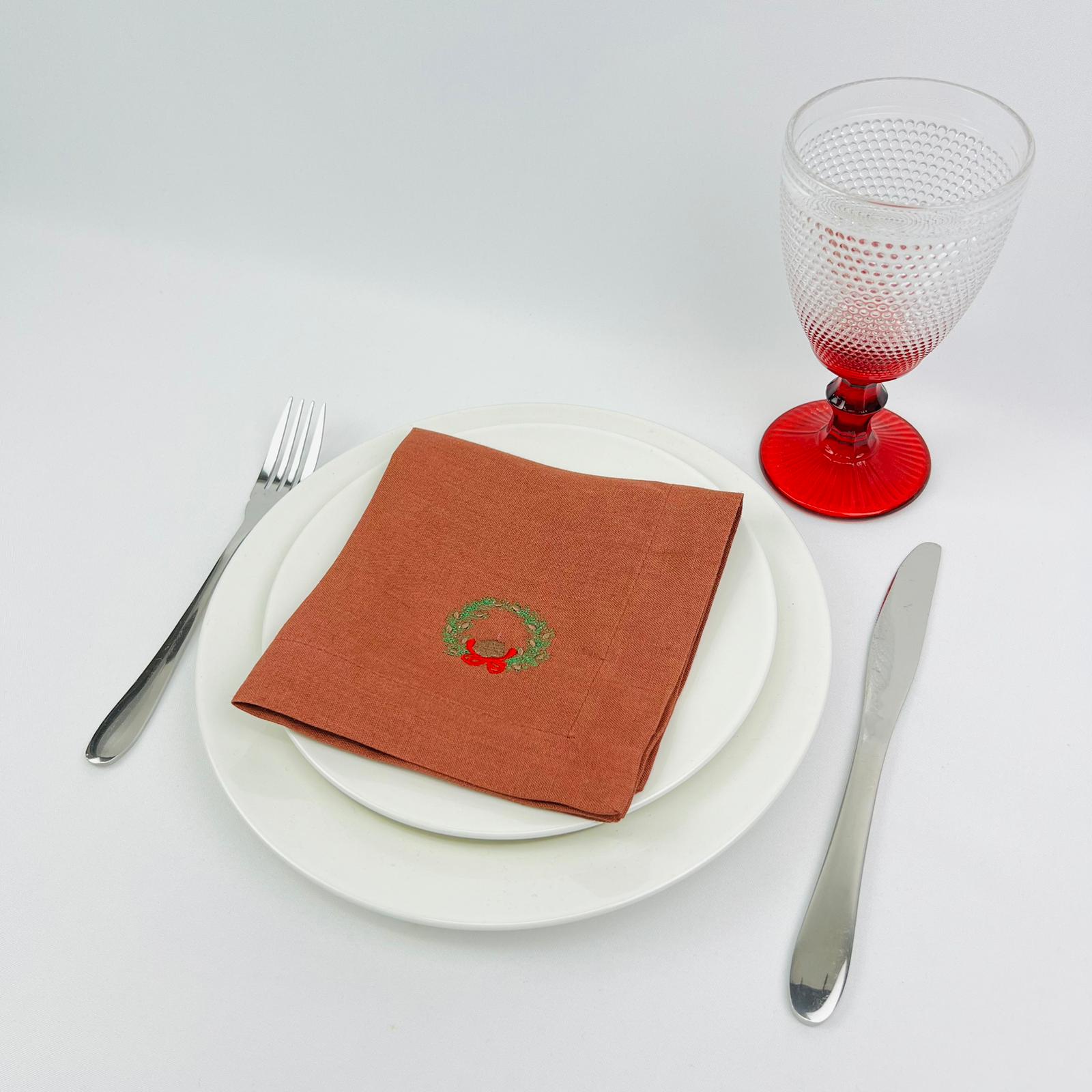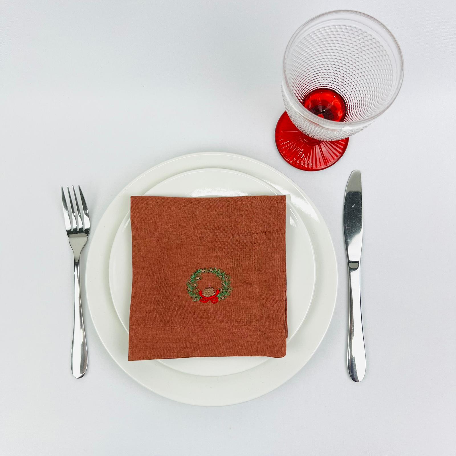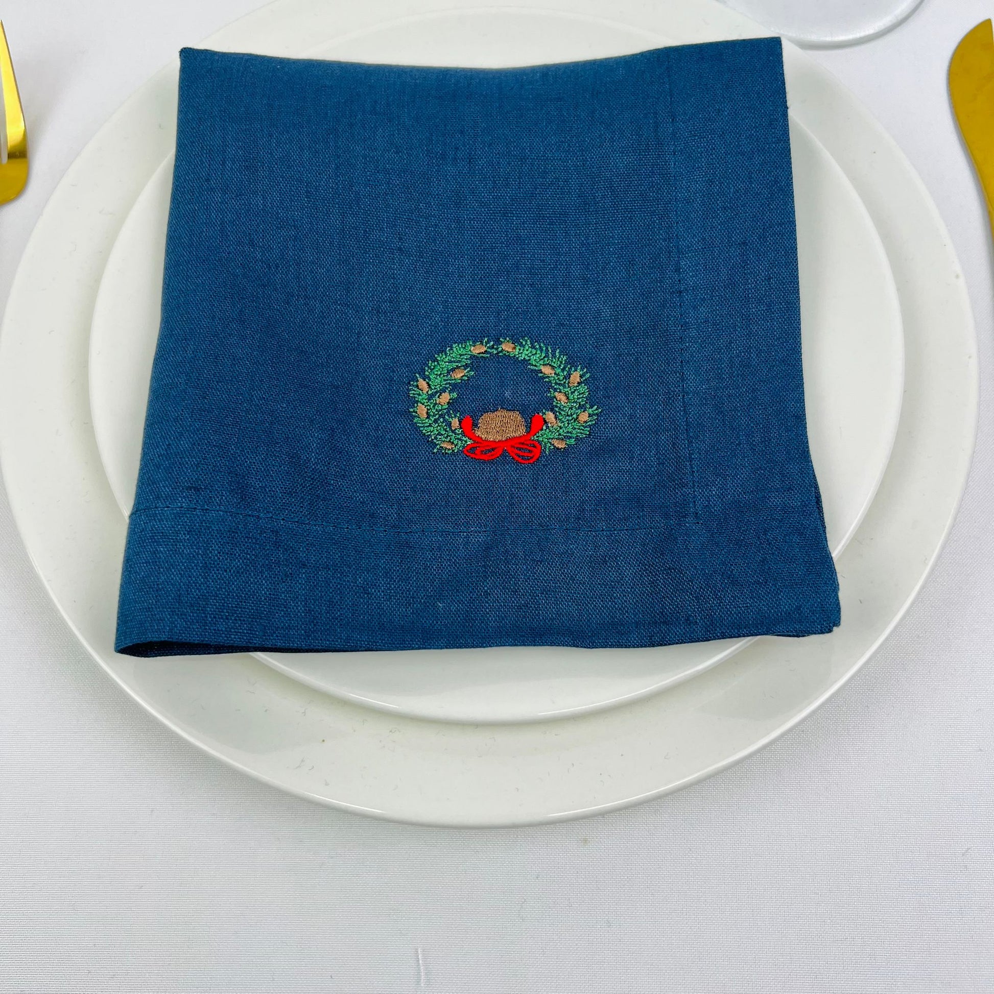 Guardanapo em linho, 30x30cm, c/ bordado e acabamento em bainha inglesa.