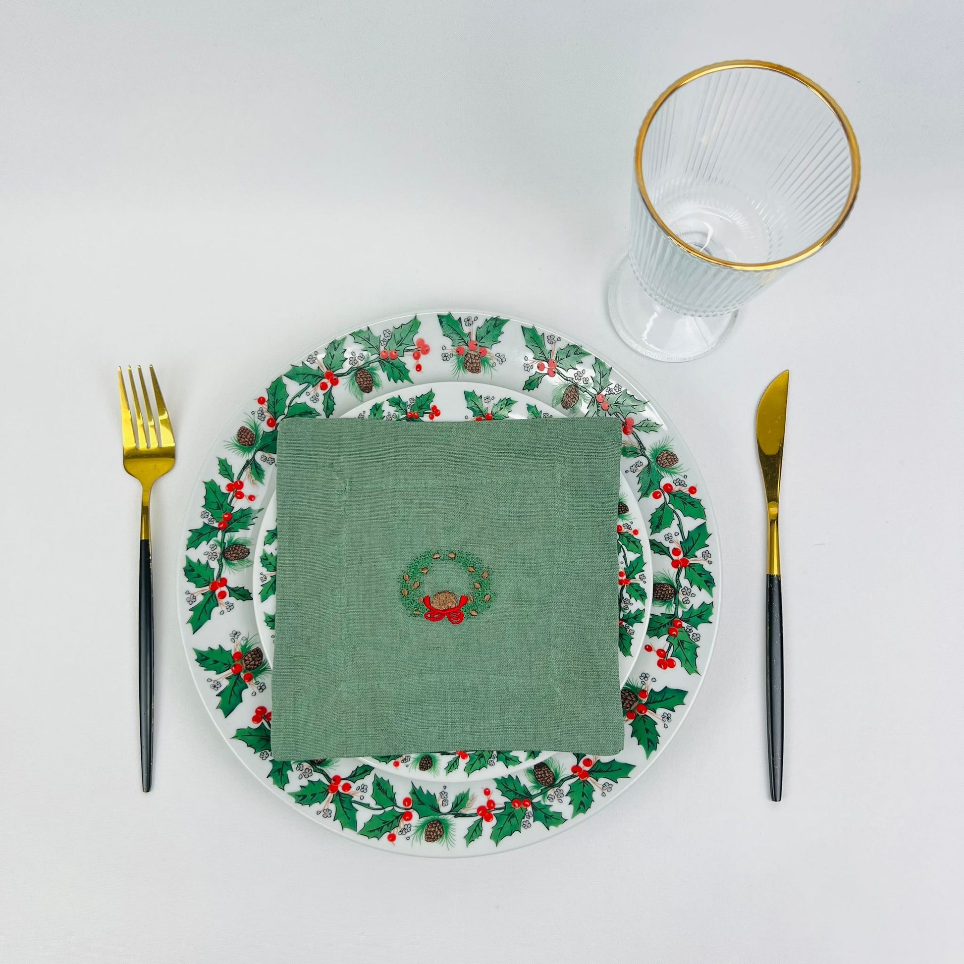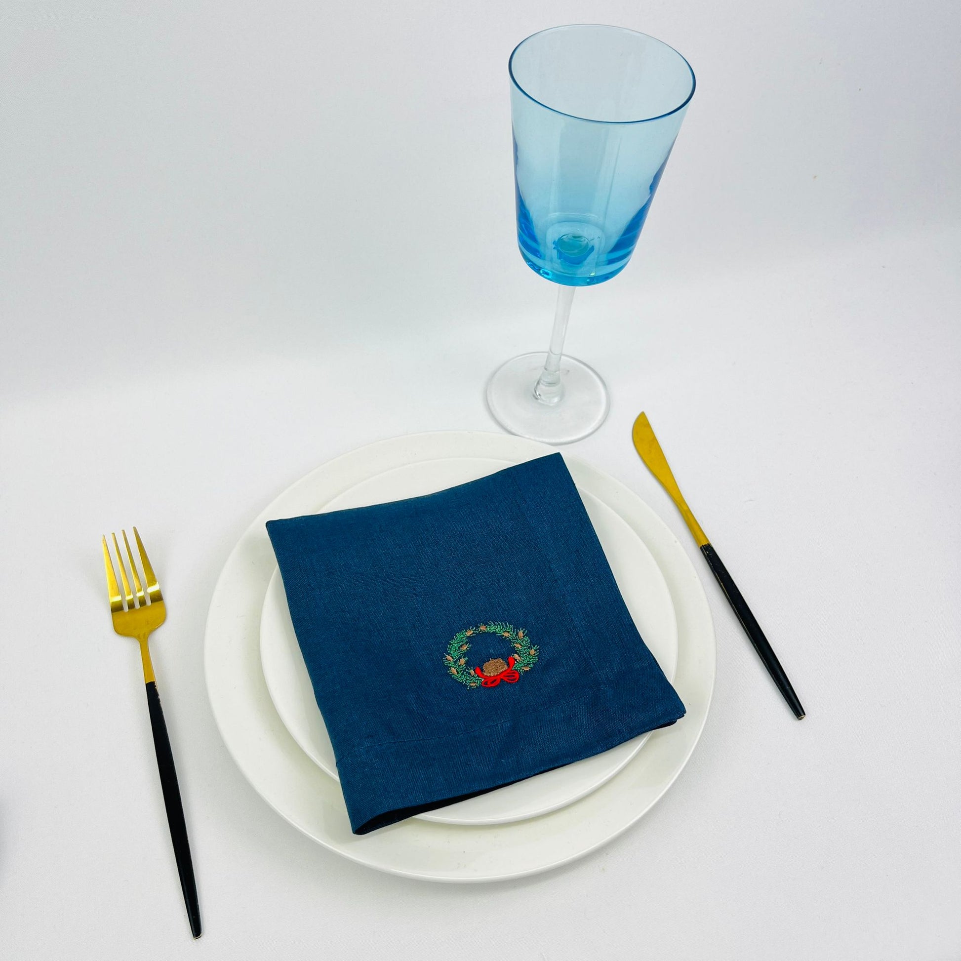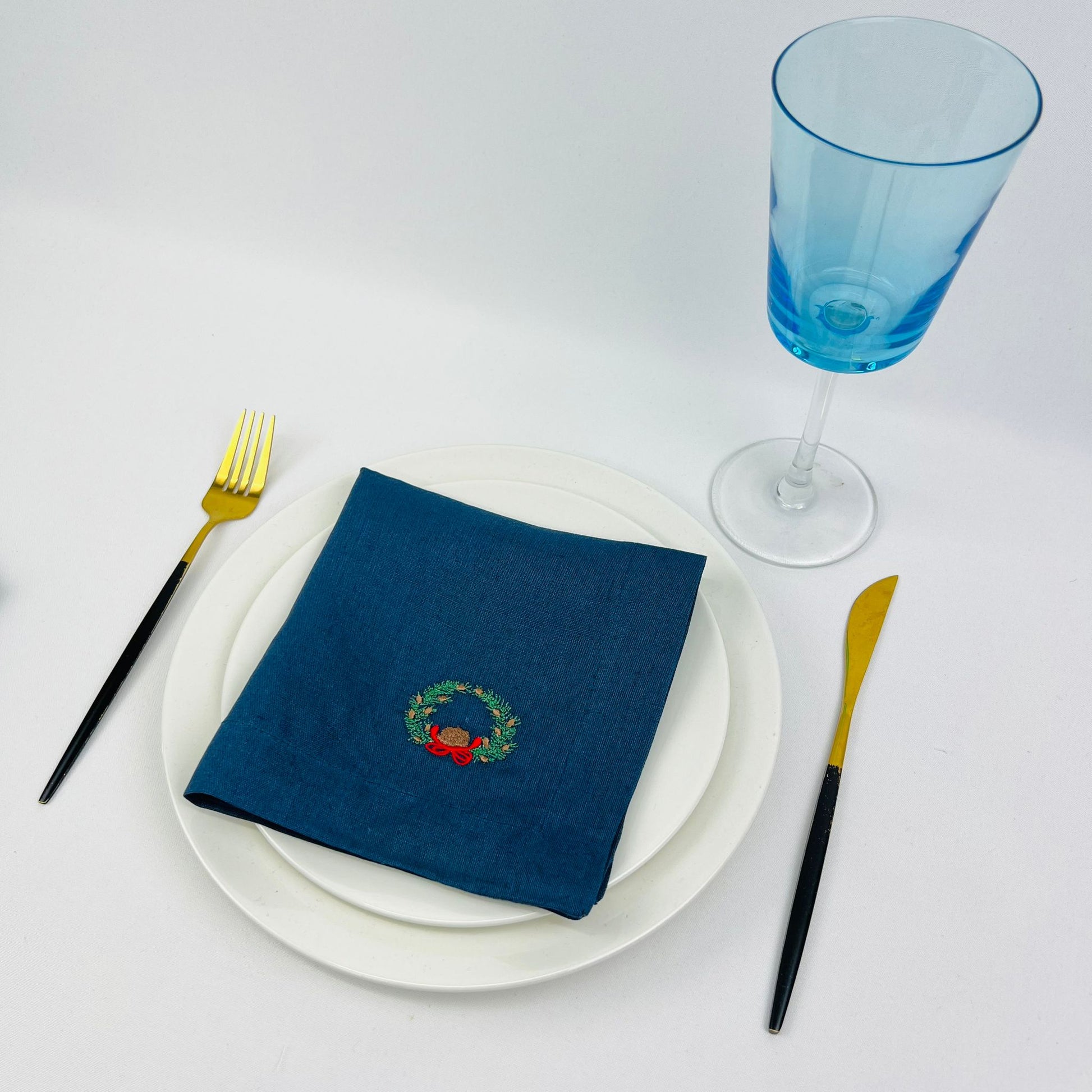 Guardanapo em linho, 30x30cm, c/ bordado e acabamento em bainha inglesa.