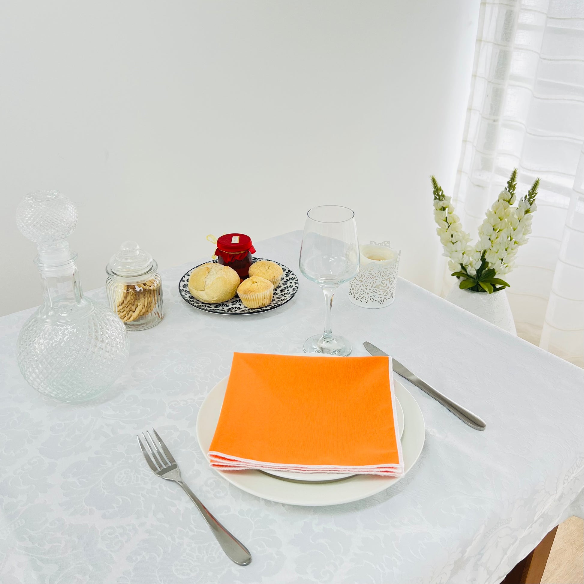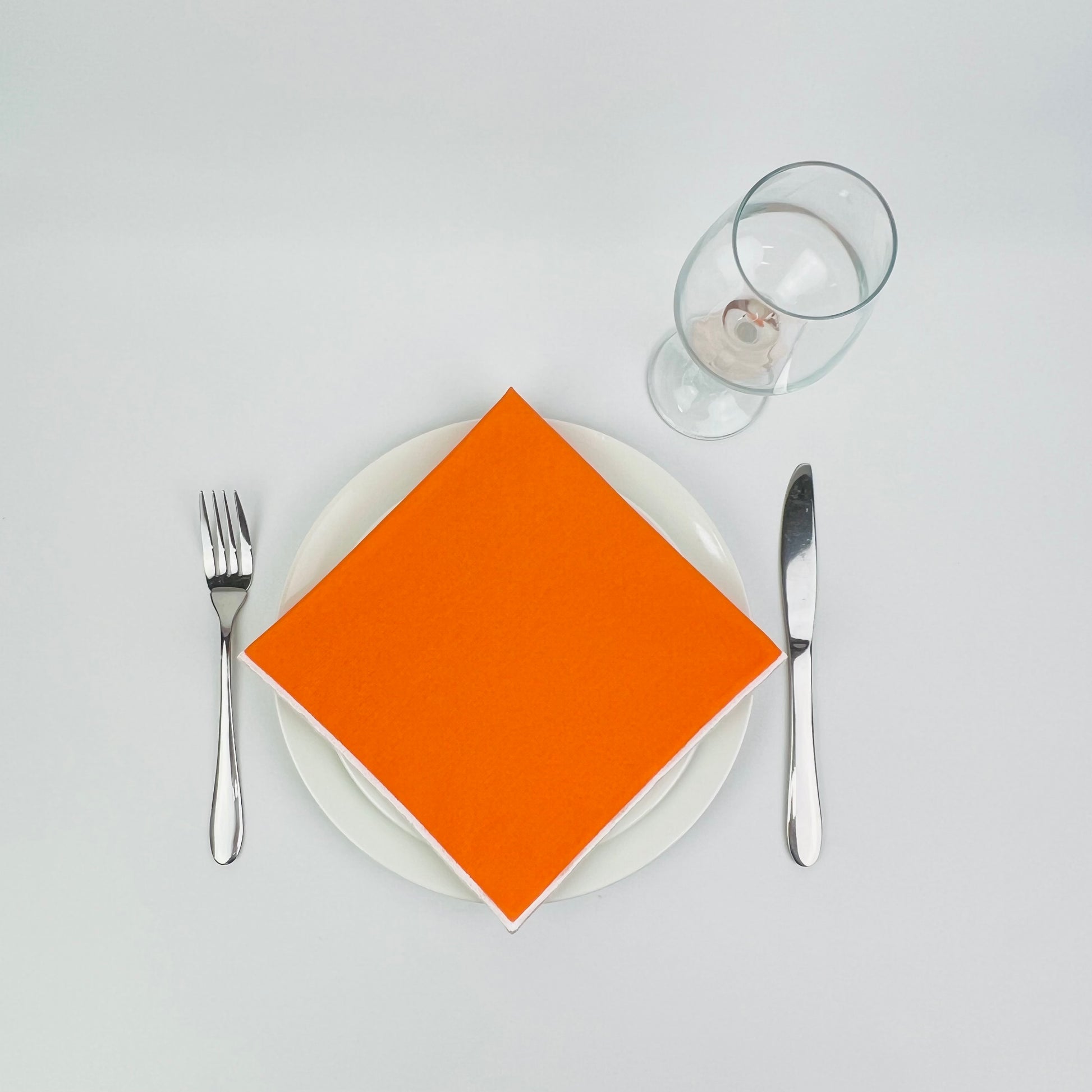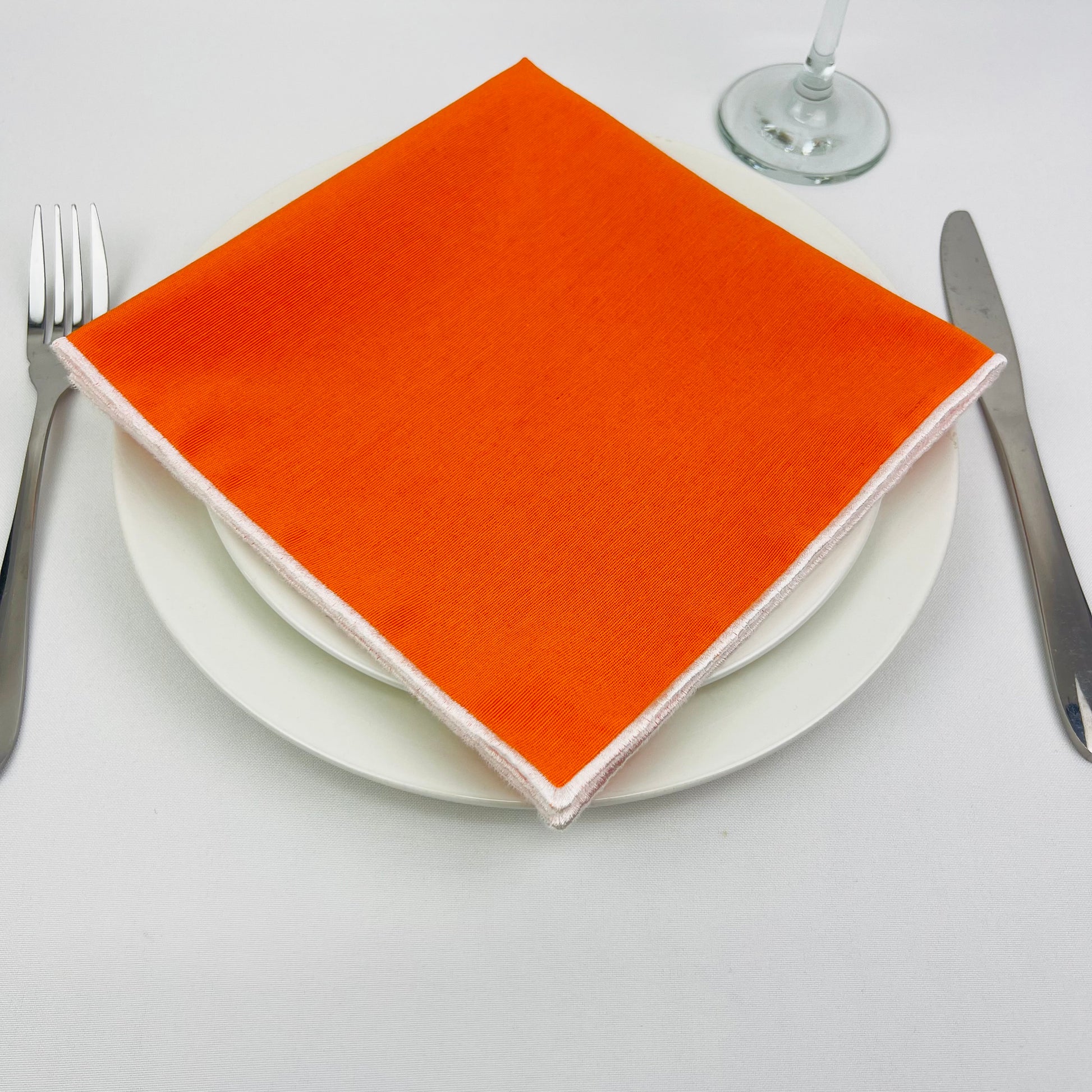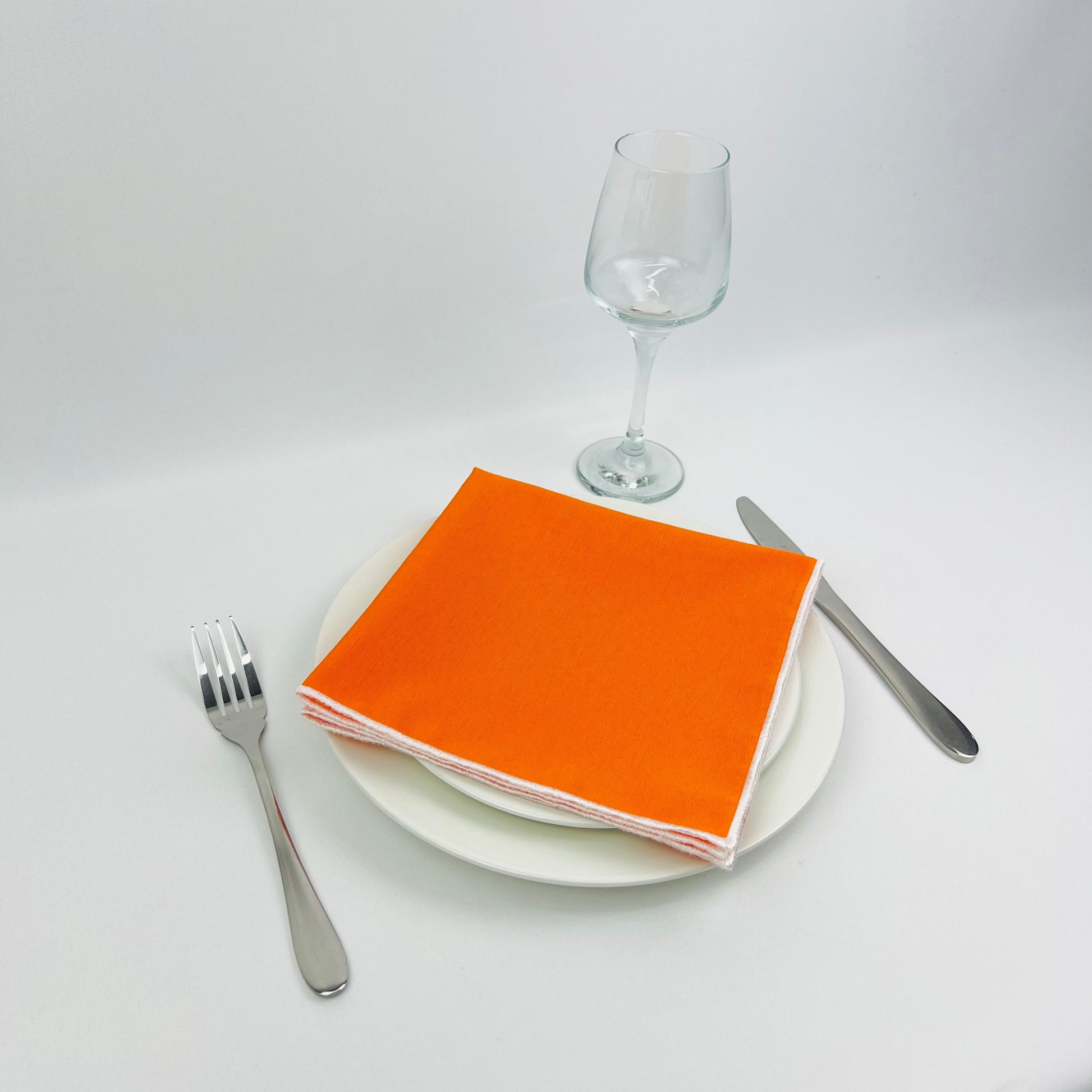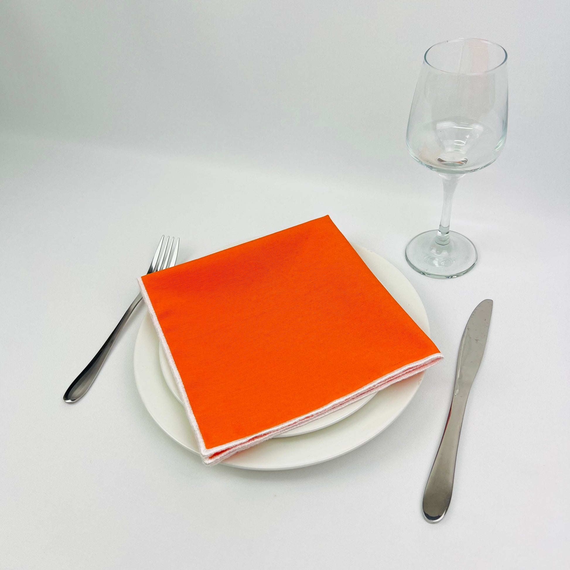Guardanapo em tom laranja e acabamento em rolinho branco, disponível em várias medidas