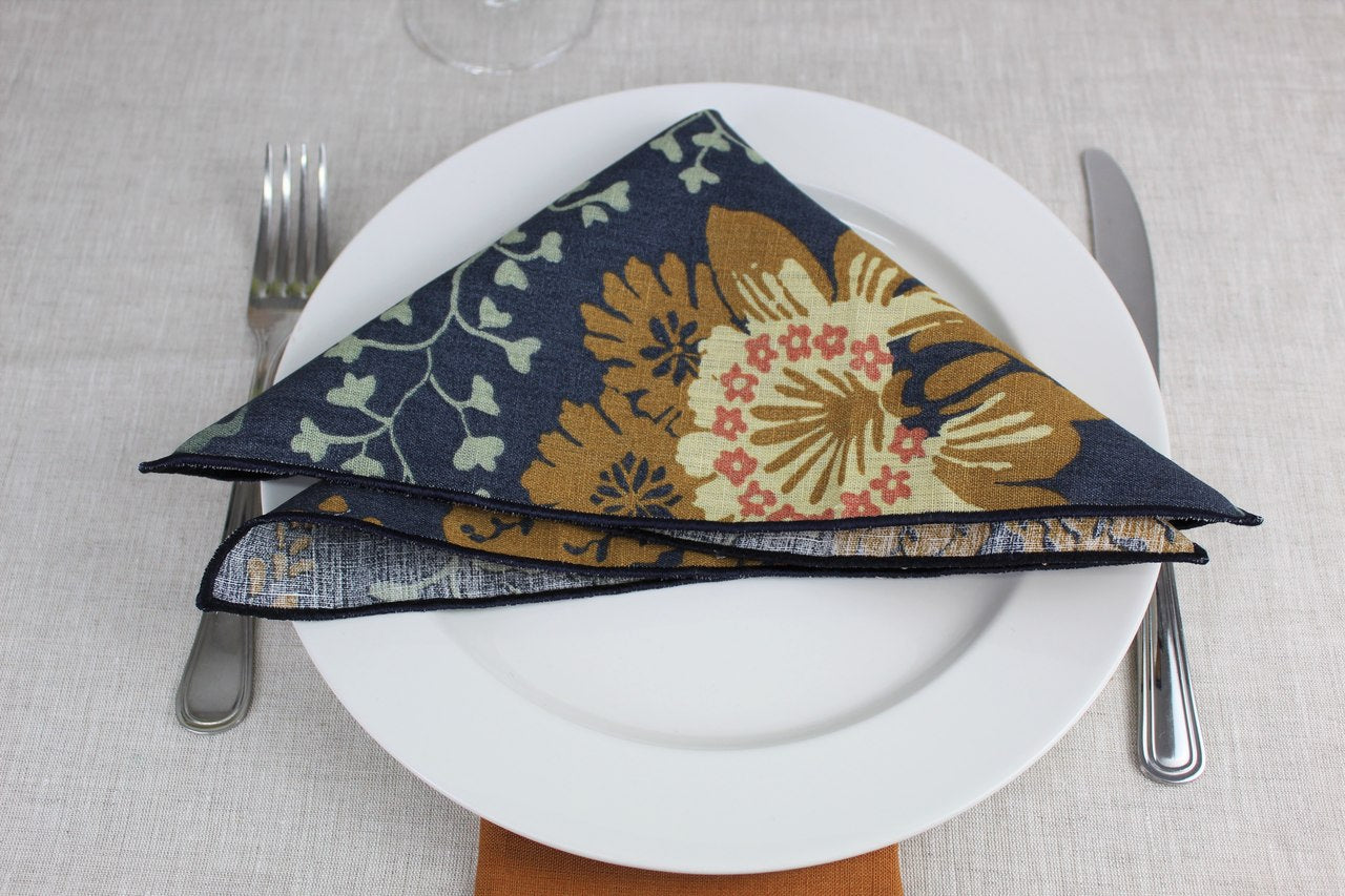 Guardanapo em linho c/acabamento em rolinho, padrão florido azul, 30x30cm