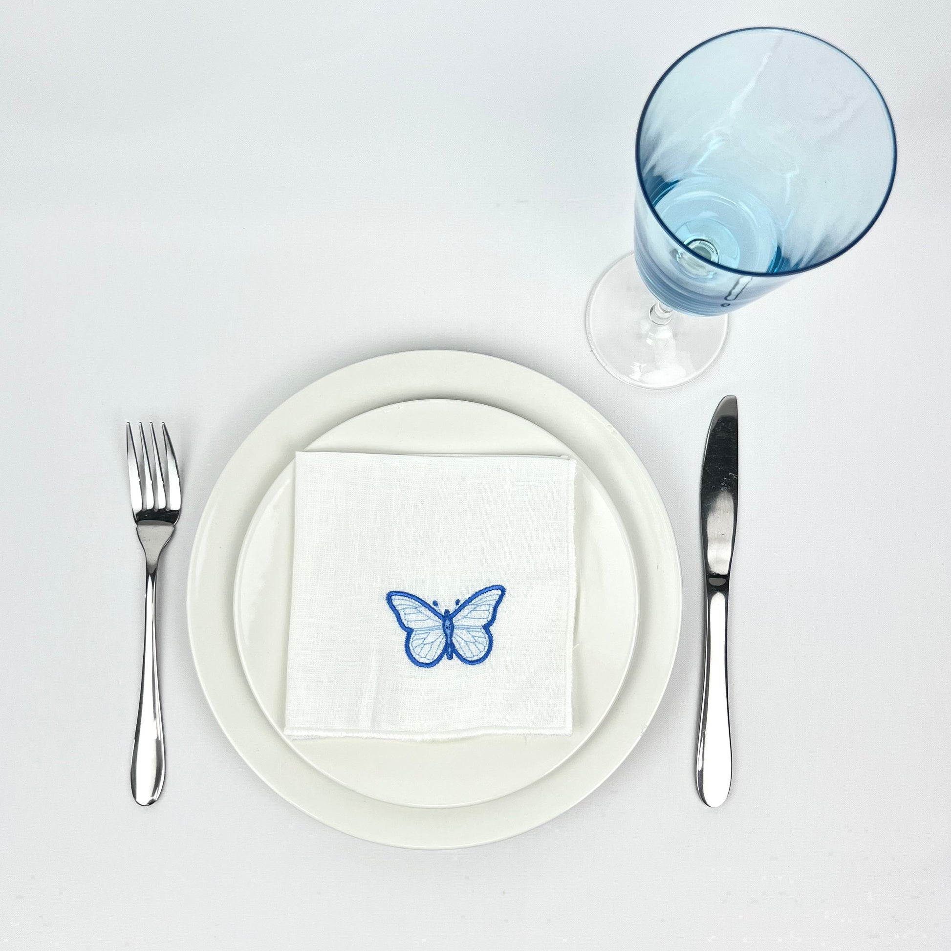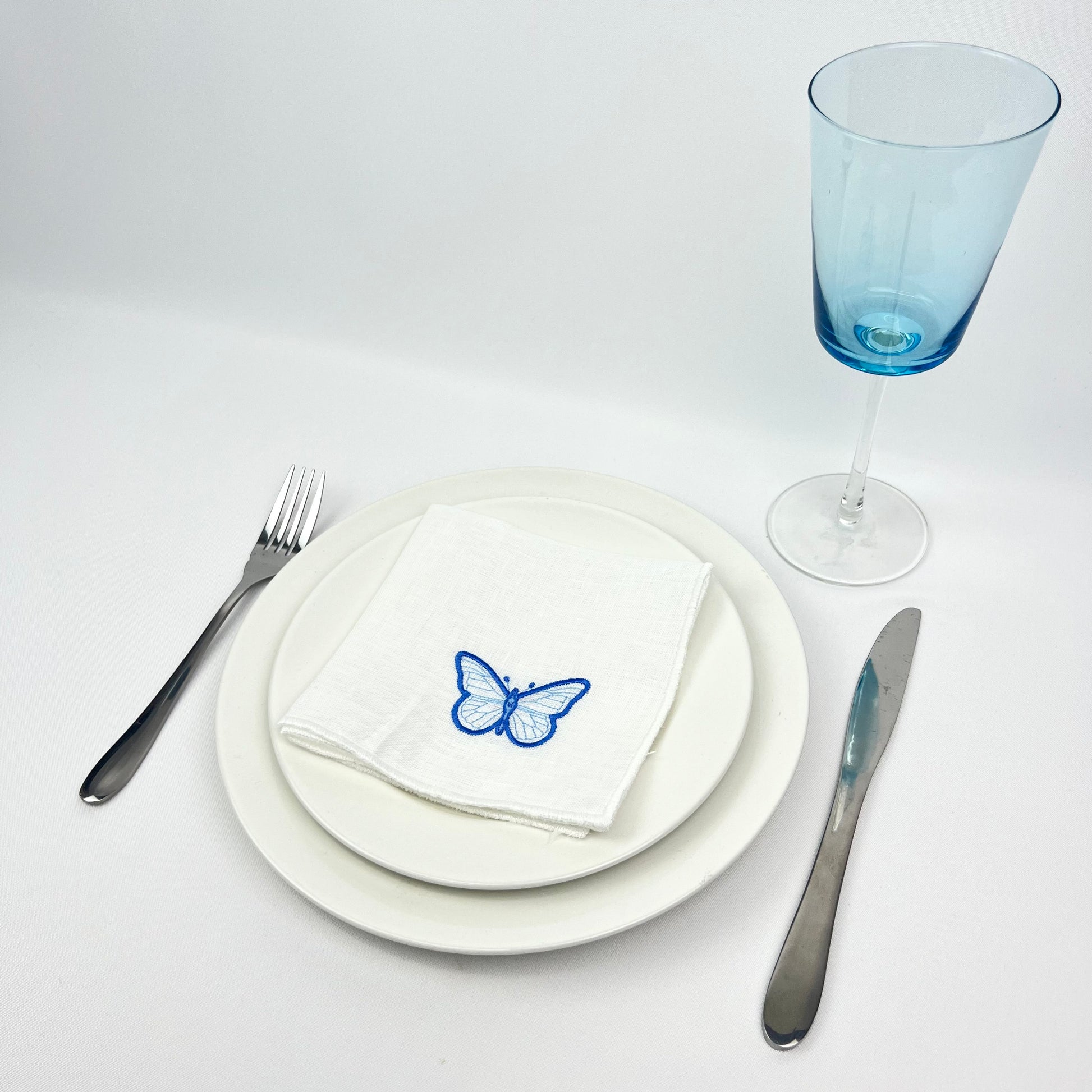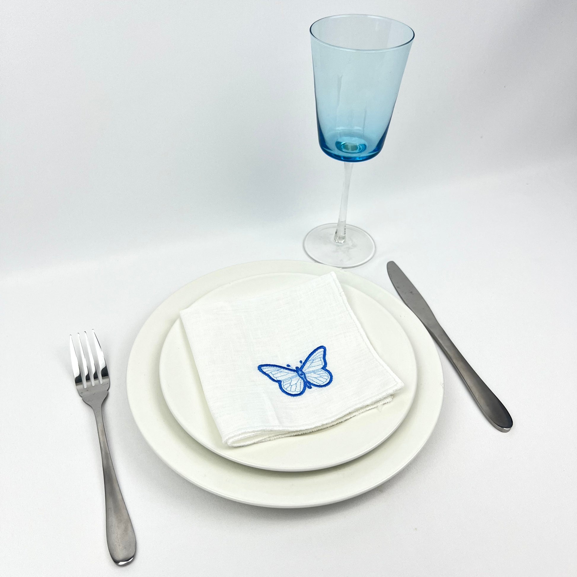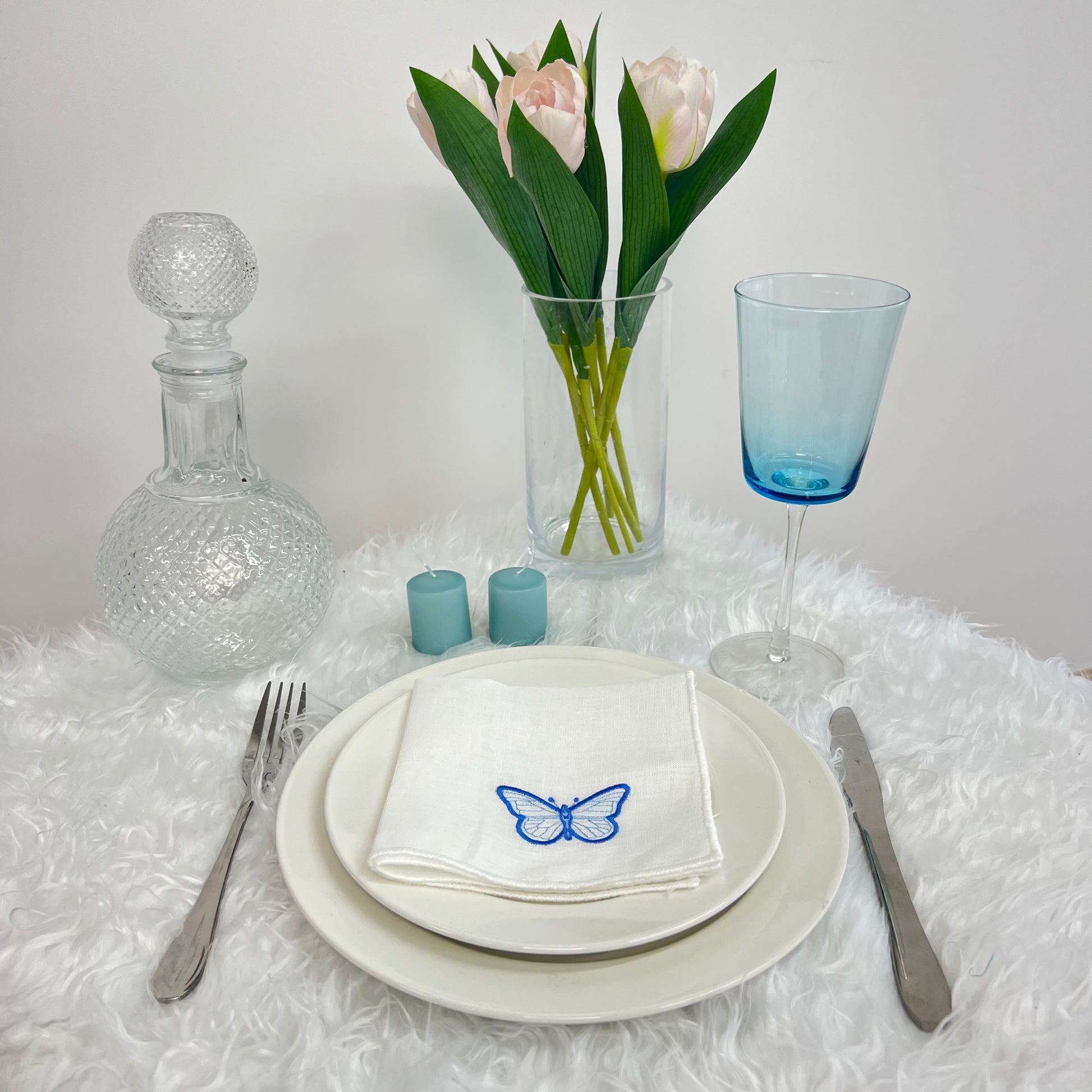 Guardanapo em linho branco, com acabamento em rolinho e bordado