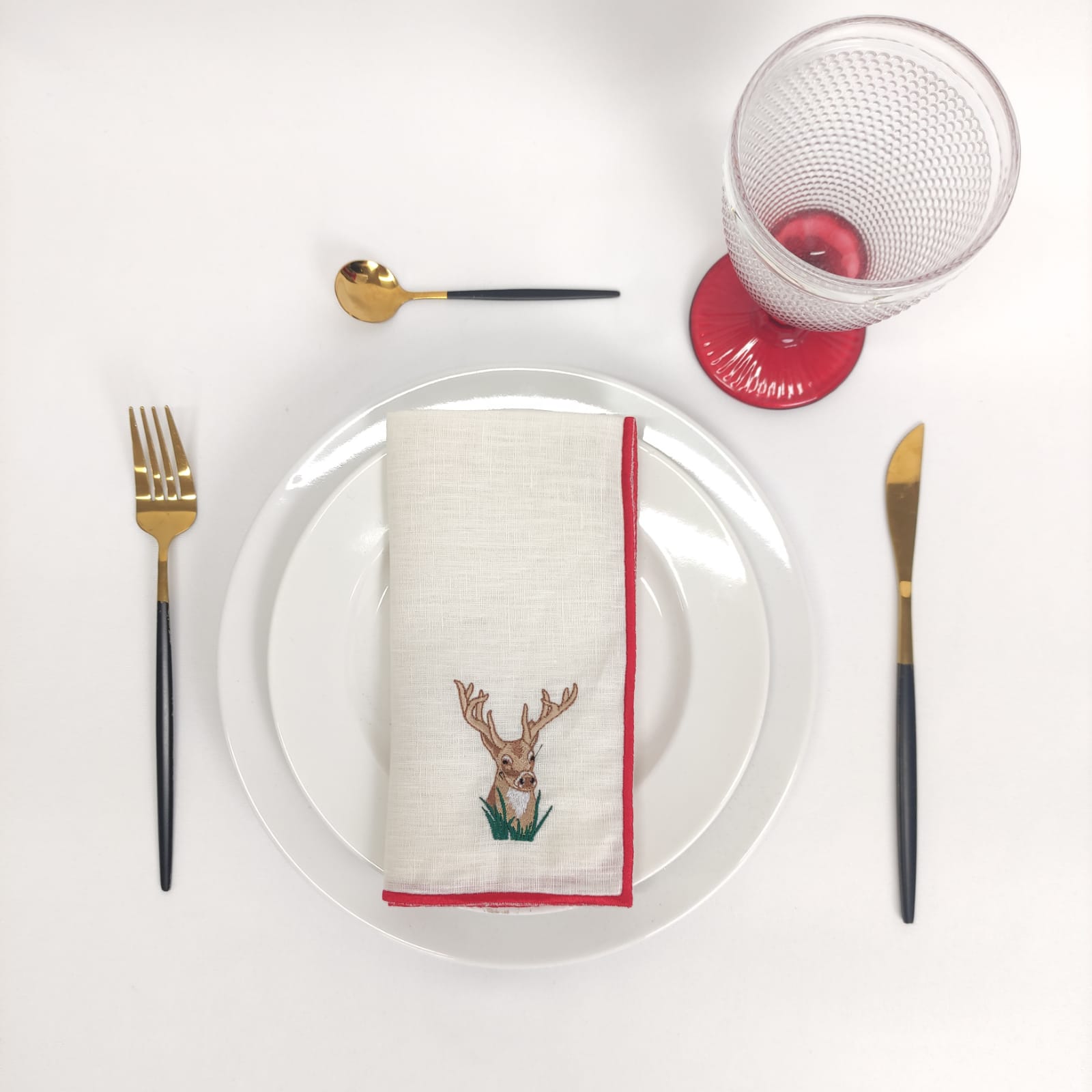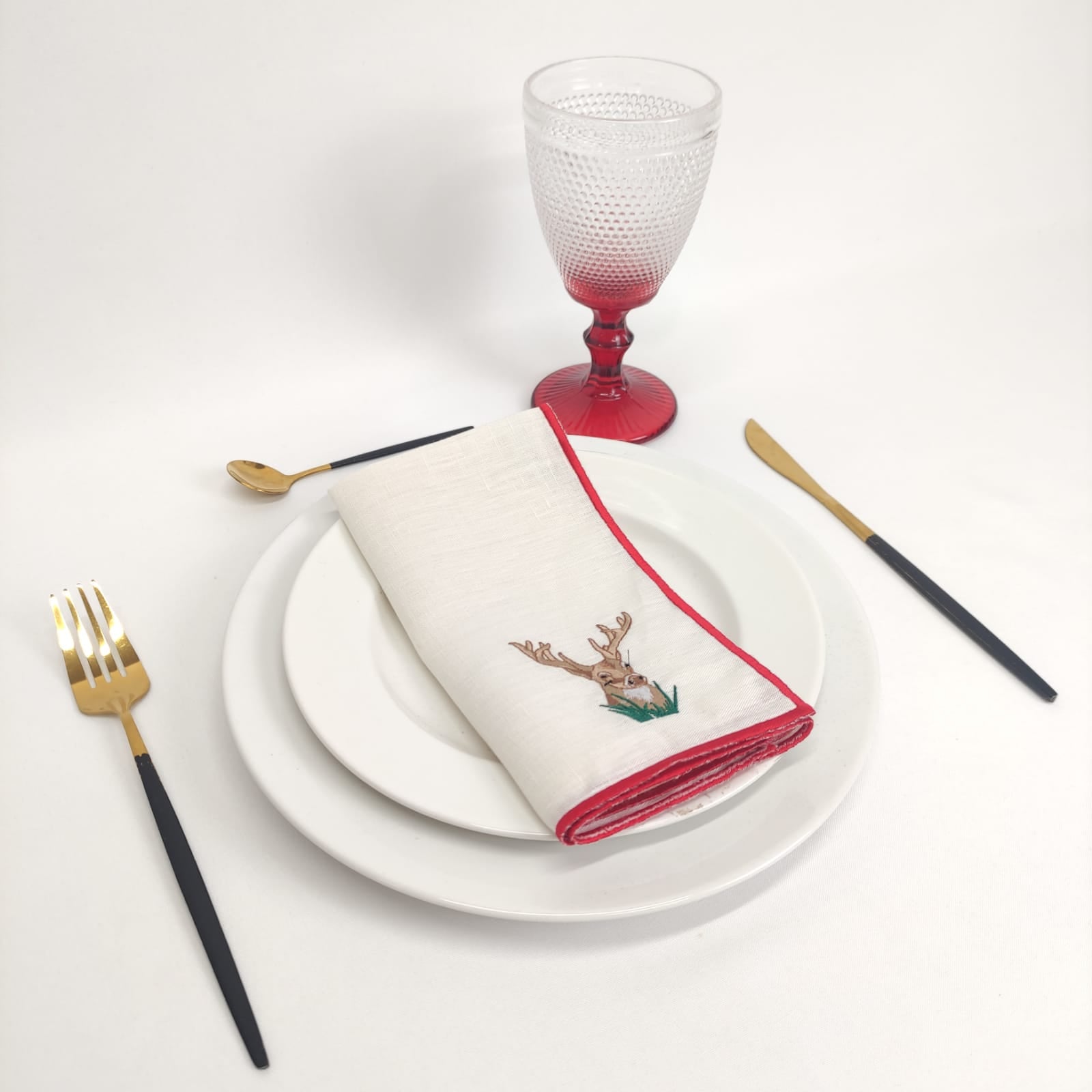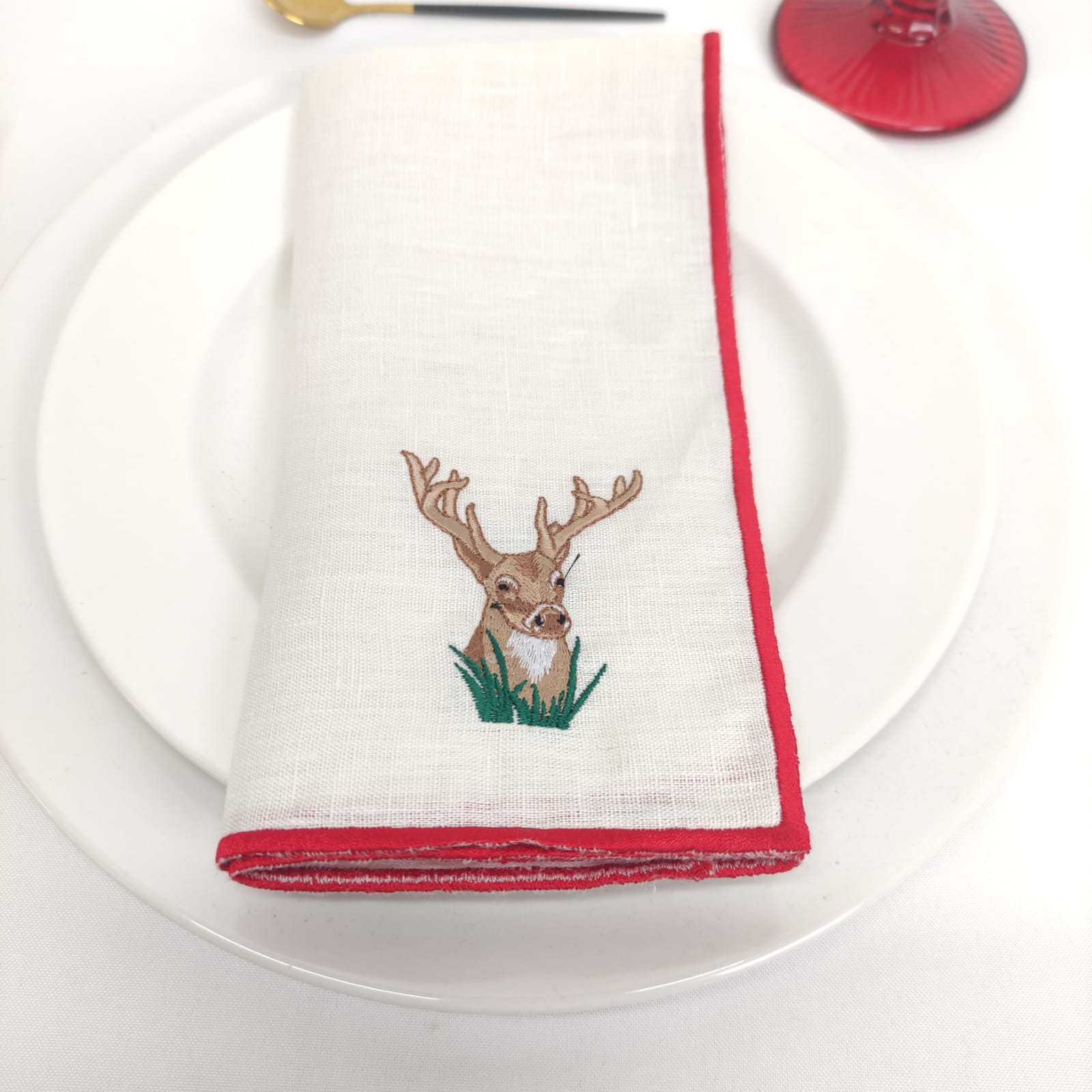 Guardanapo em linho pérola c/bordado de Natal e acabamento em rolinho vermelho,