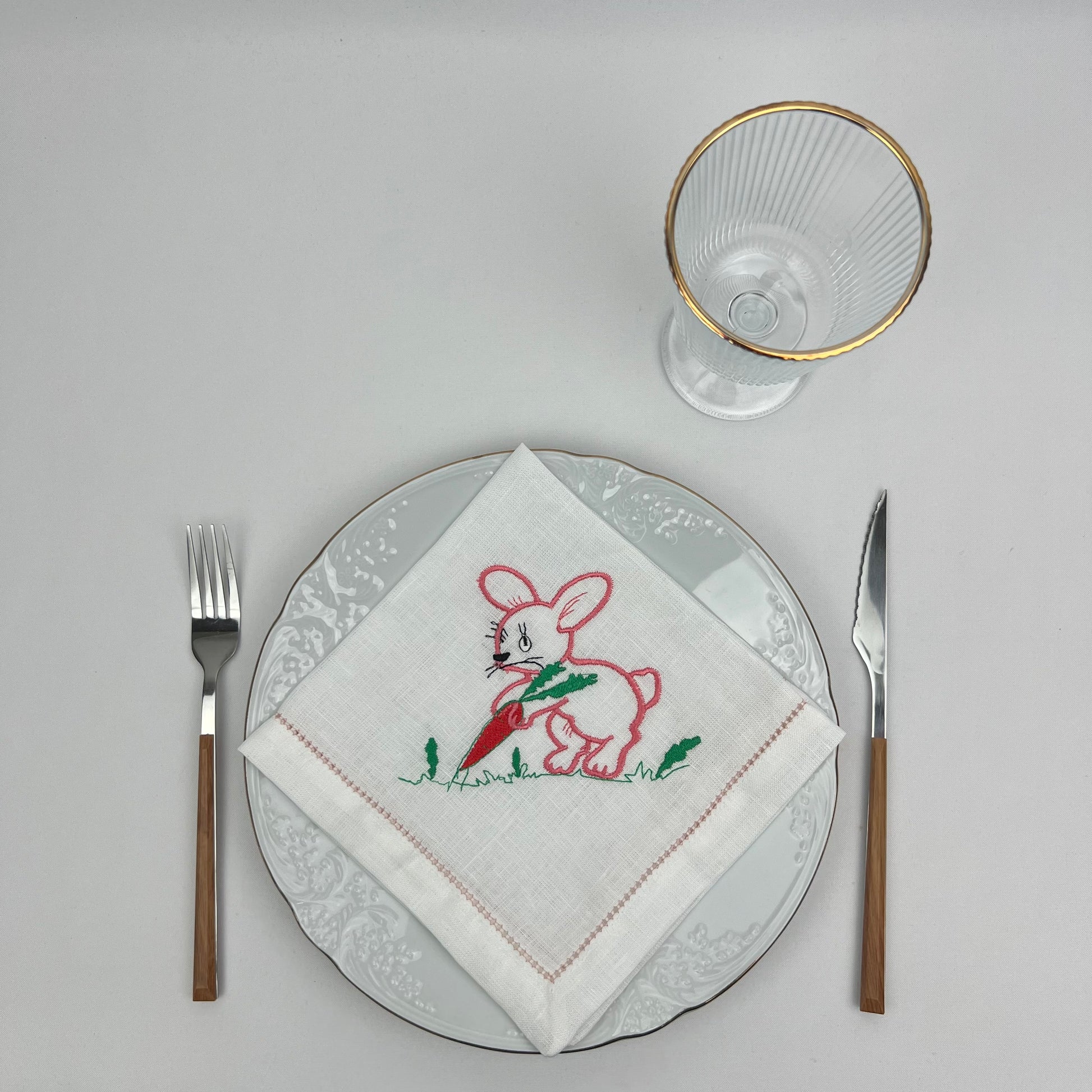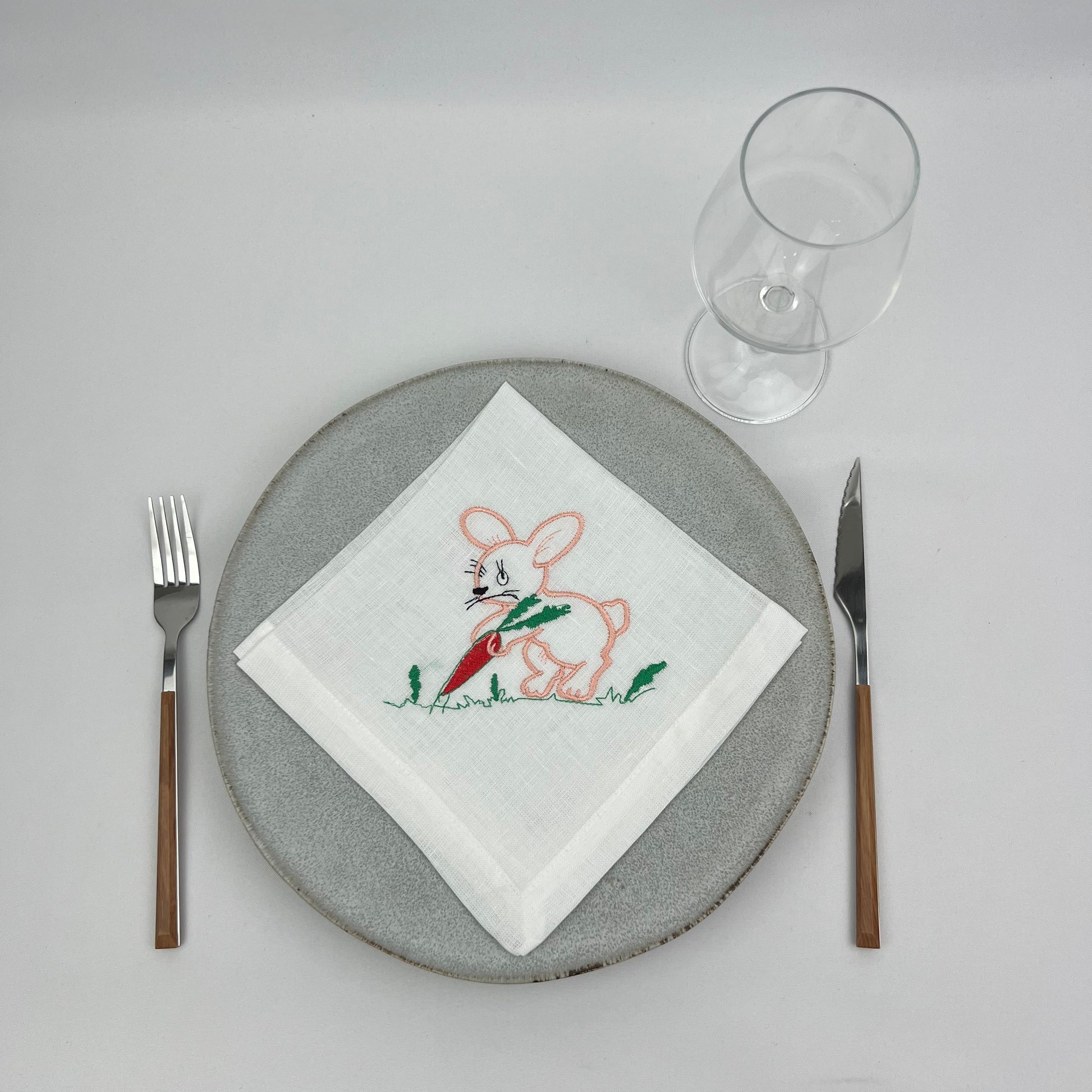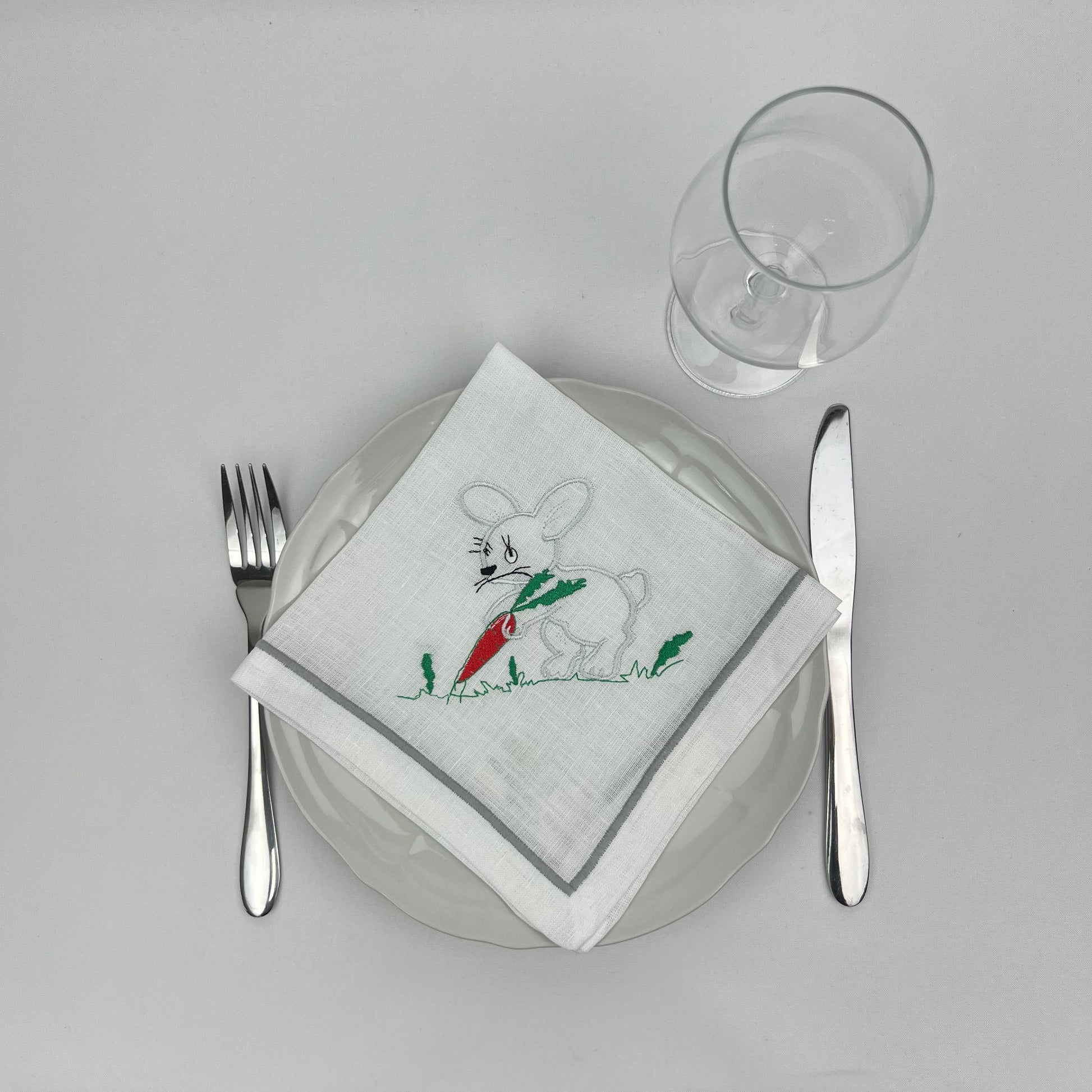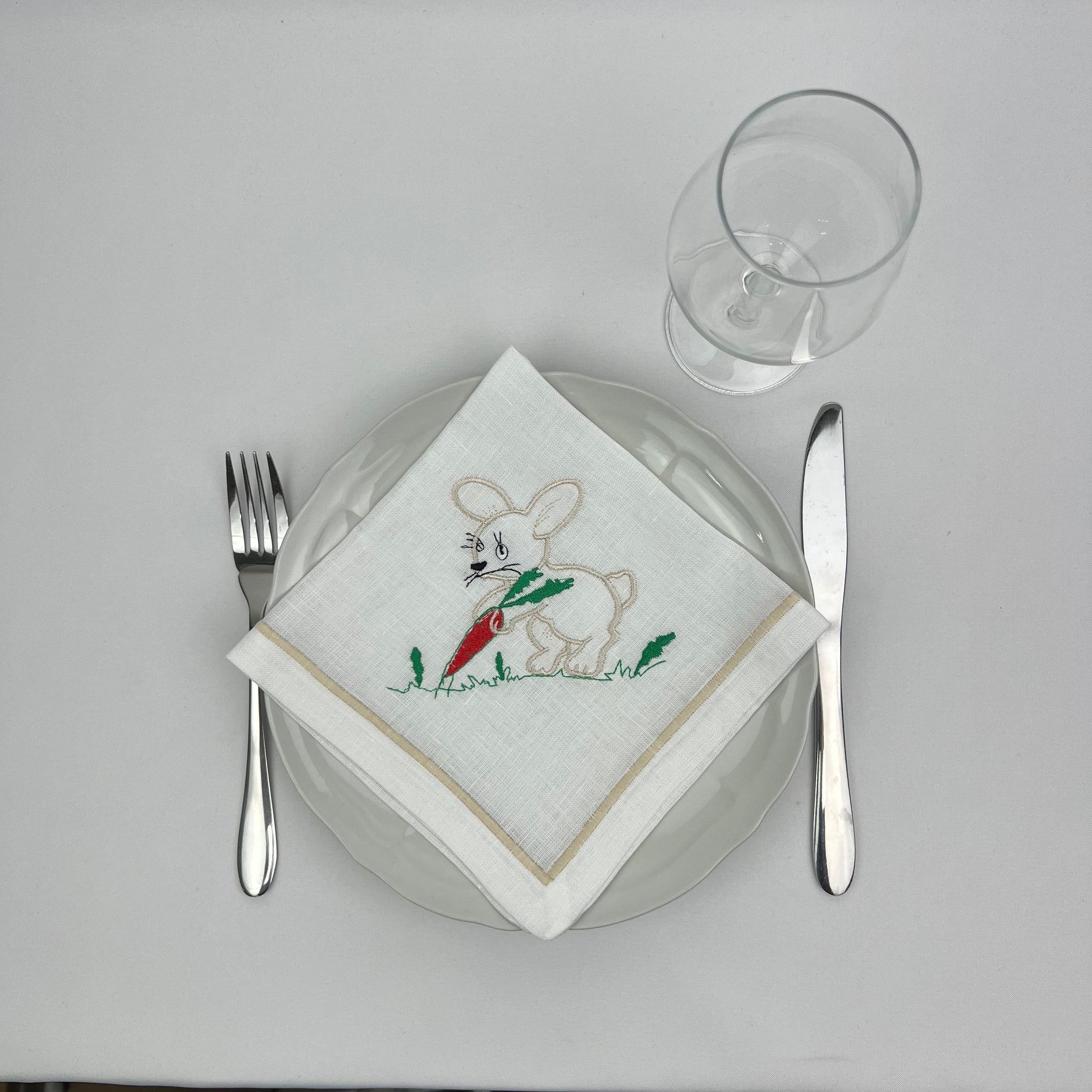 Guardanapo em linho branco c/bordado, 40x40cm aprox, rolinho INTERIOR.