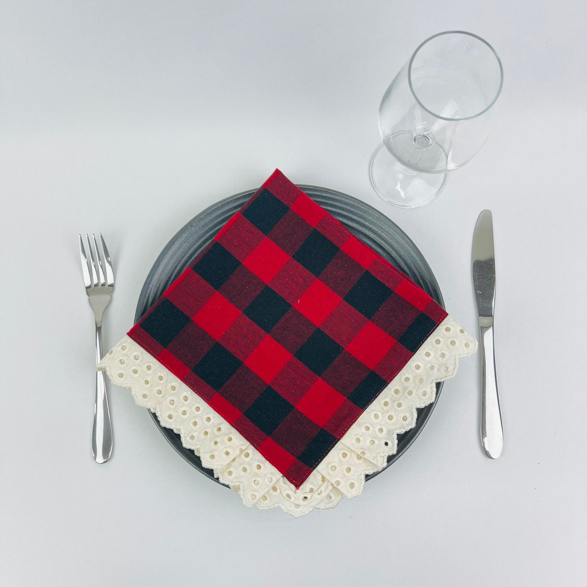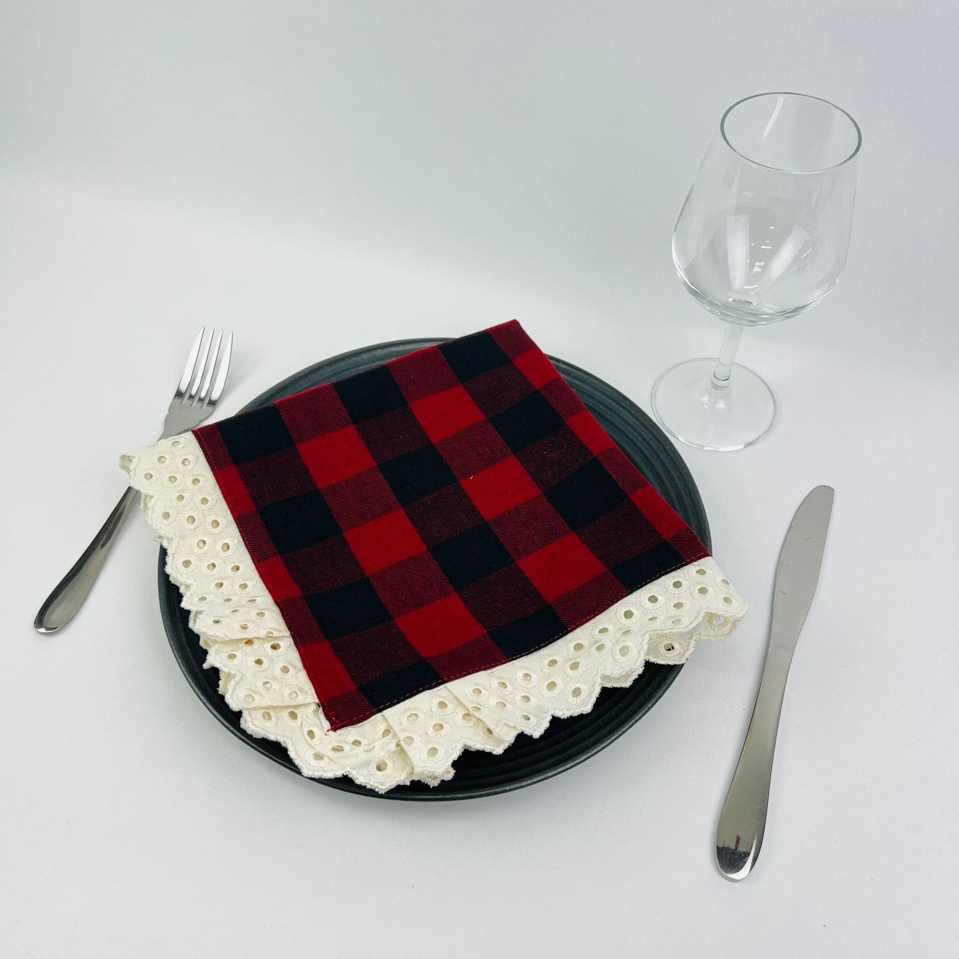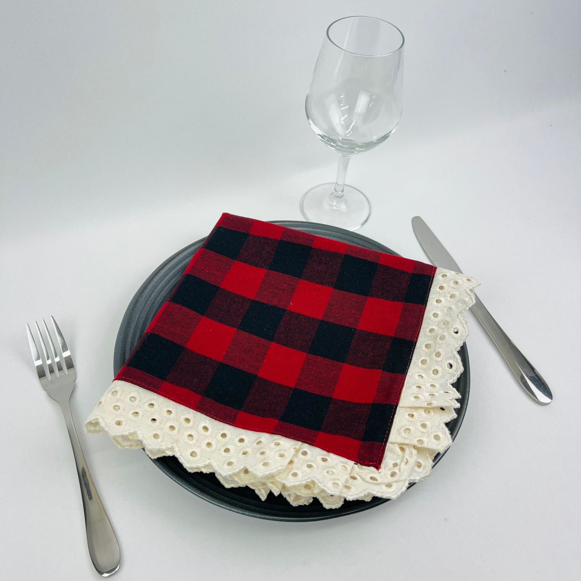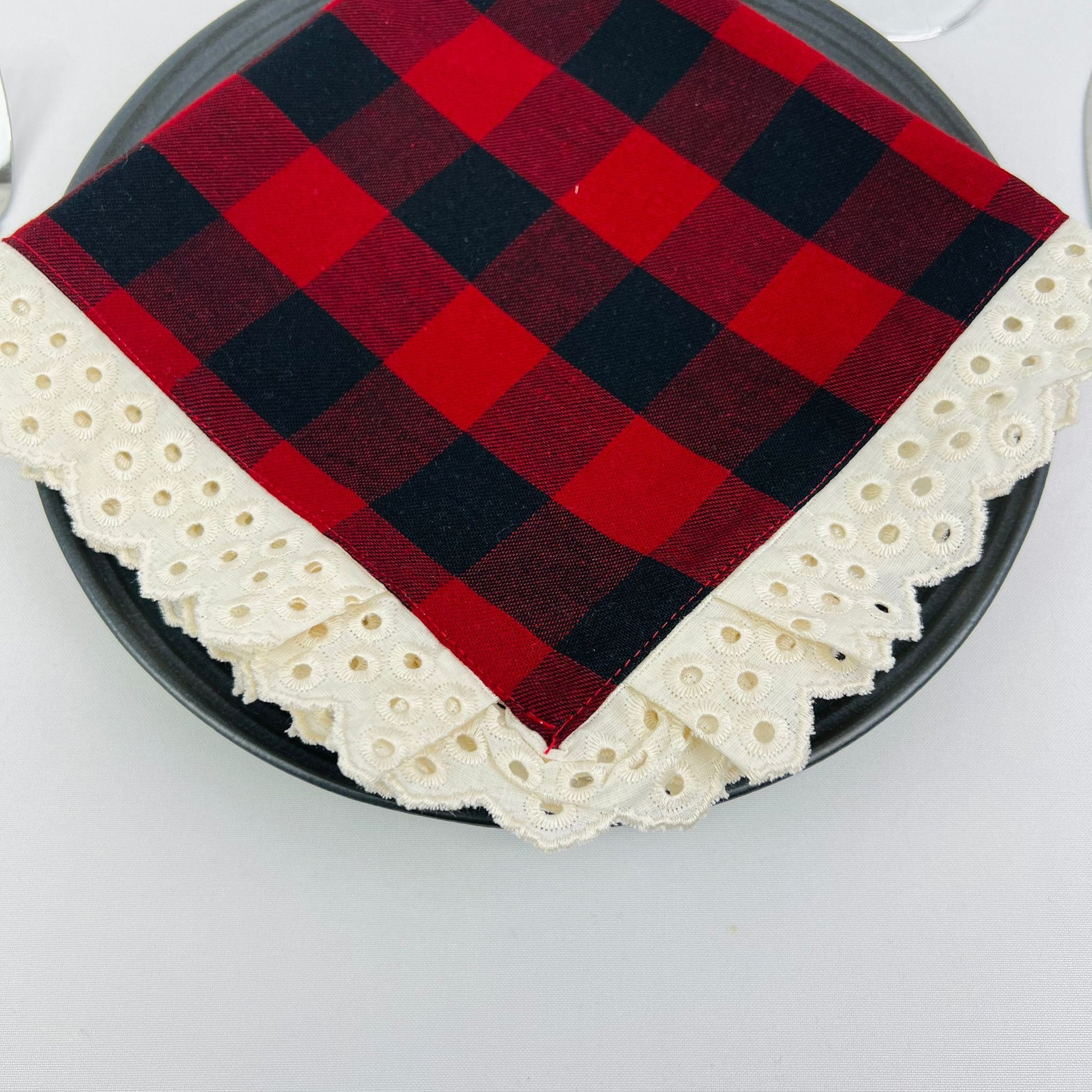 Guardanapo em algodão de tons natalícios, c/ acabamento em renda bege.