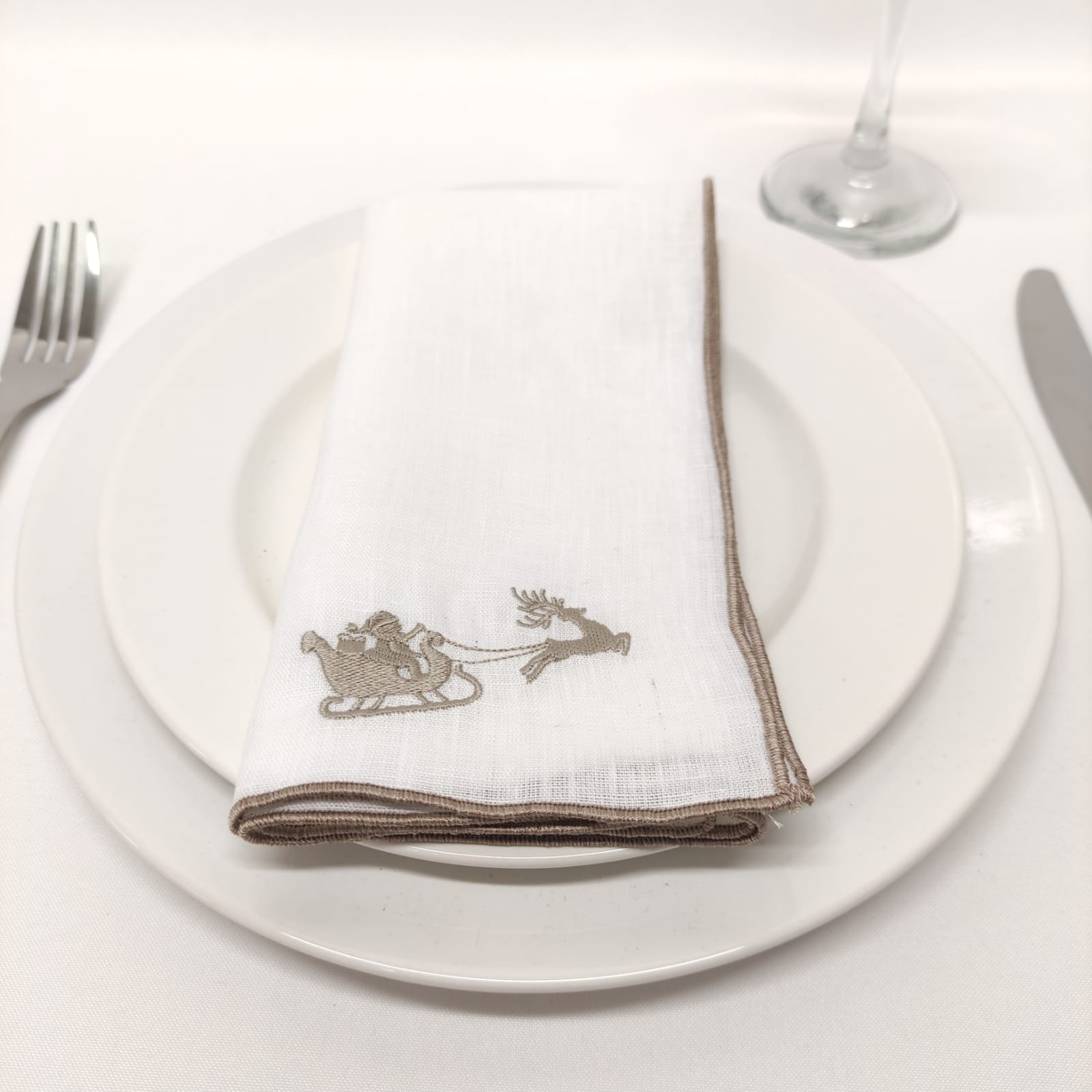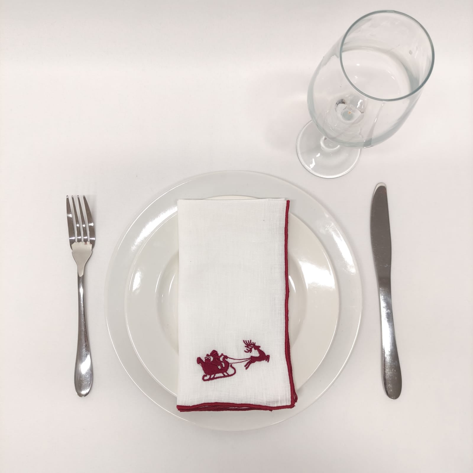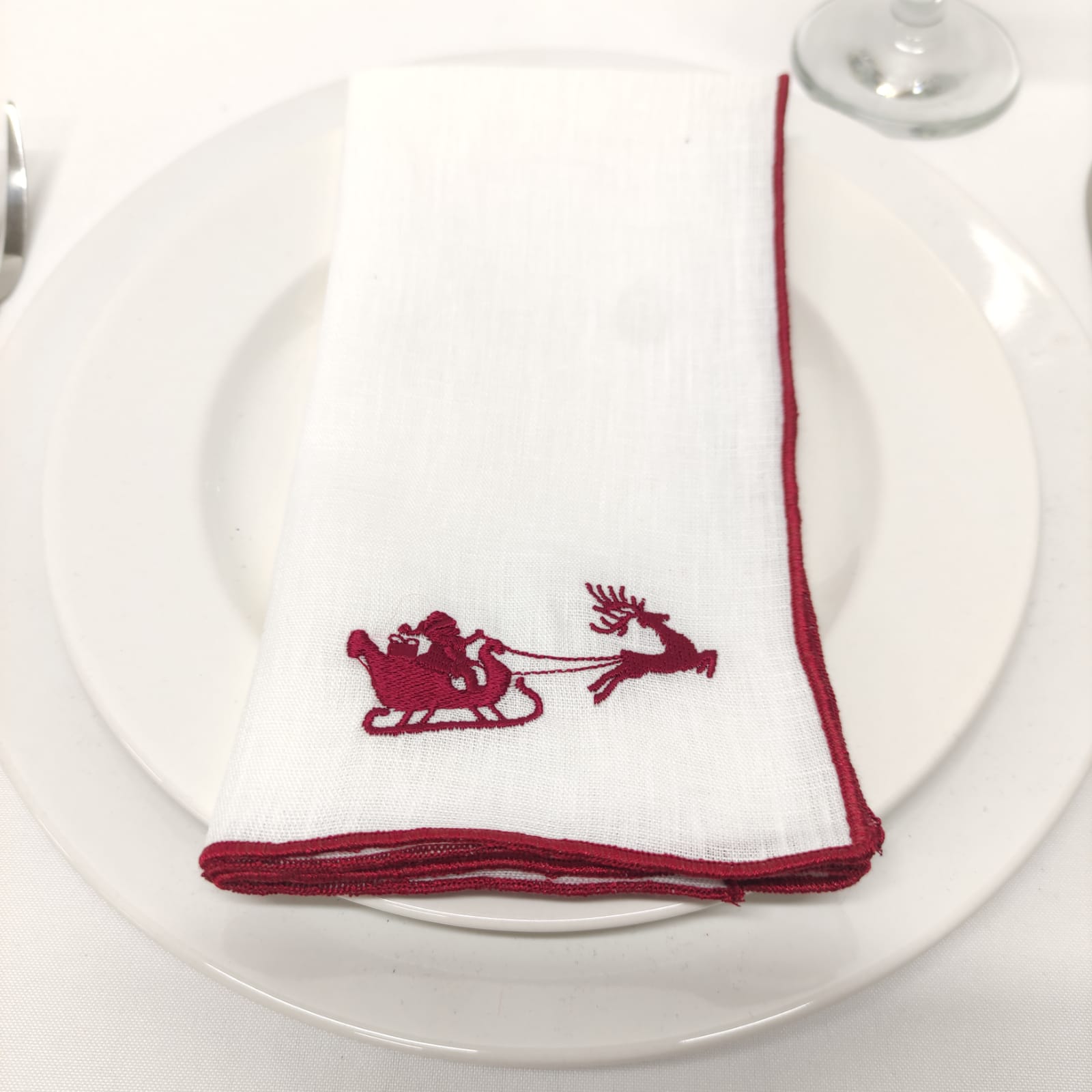 Guardanapo em linho branco com acabamento em rolinho overlock e bordado alusivo ao Natal.
