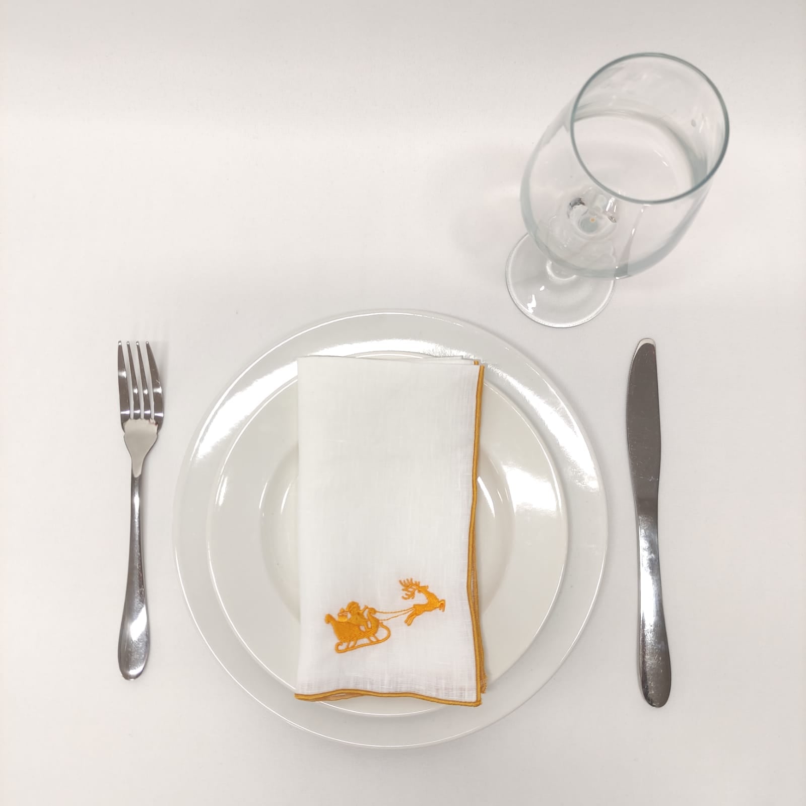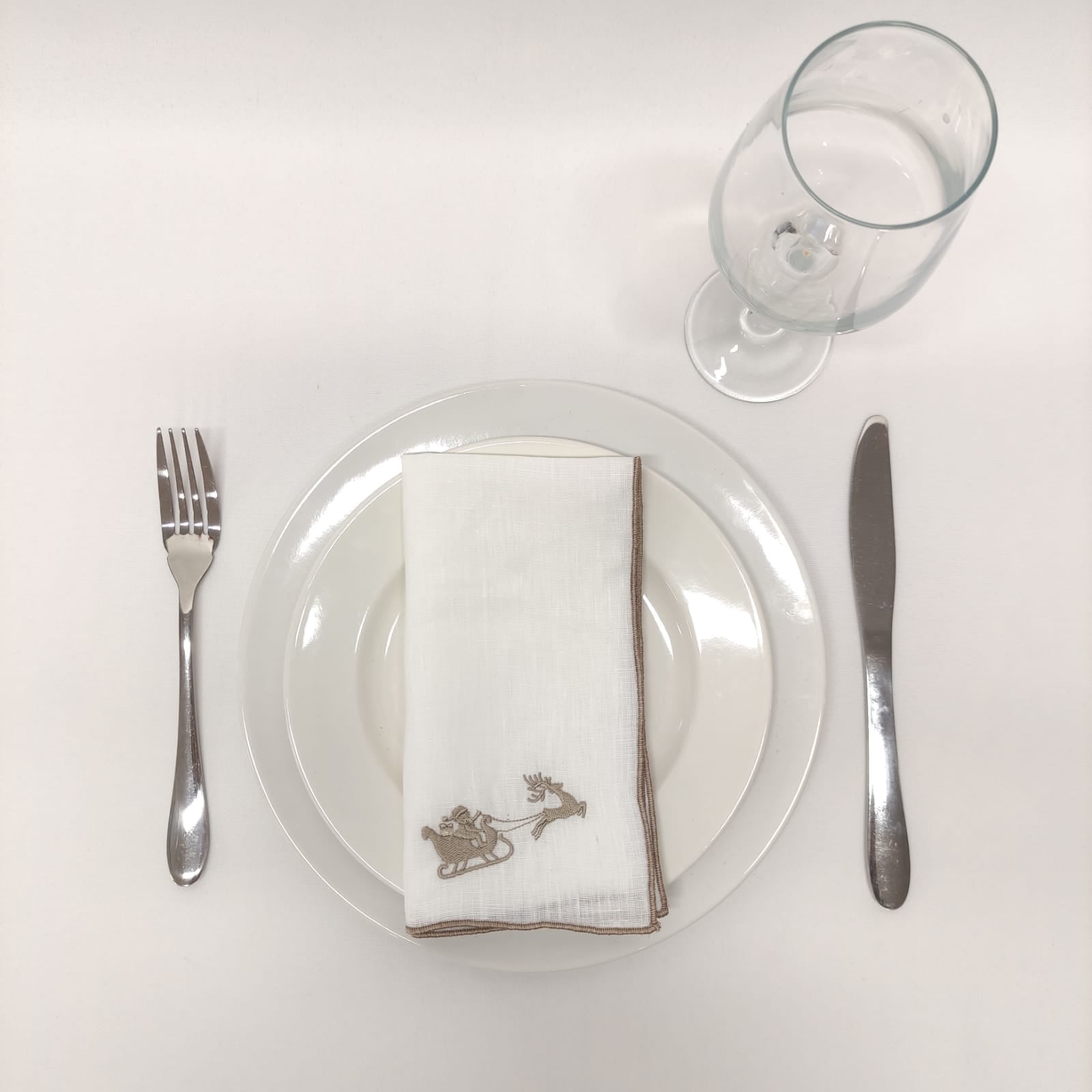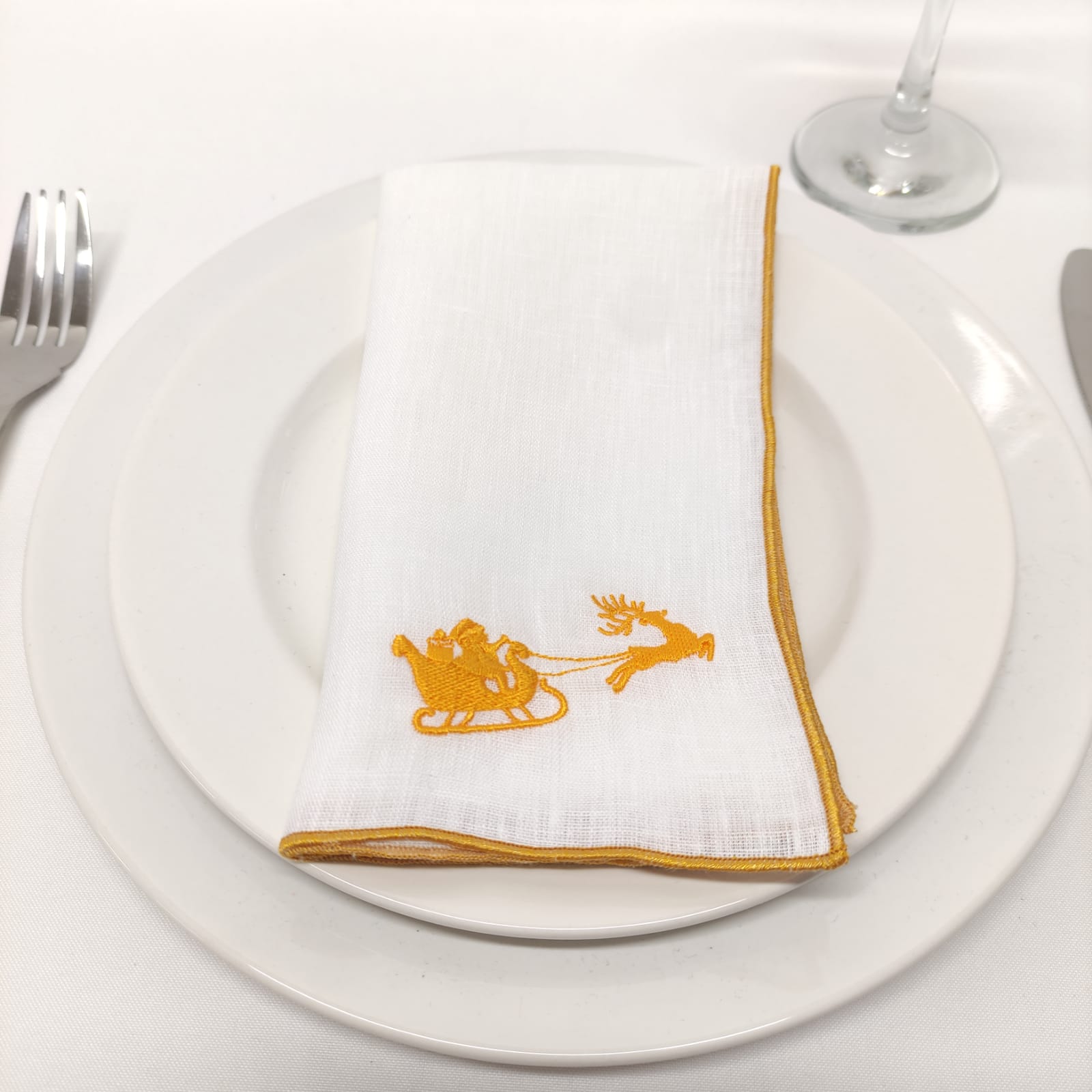 Guardanapo em linho branco com acabamento em rolinho overlock e bordado alusivo ao Natal.