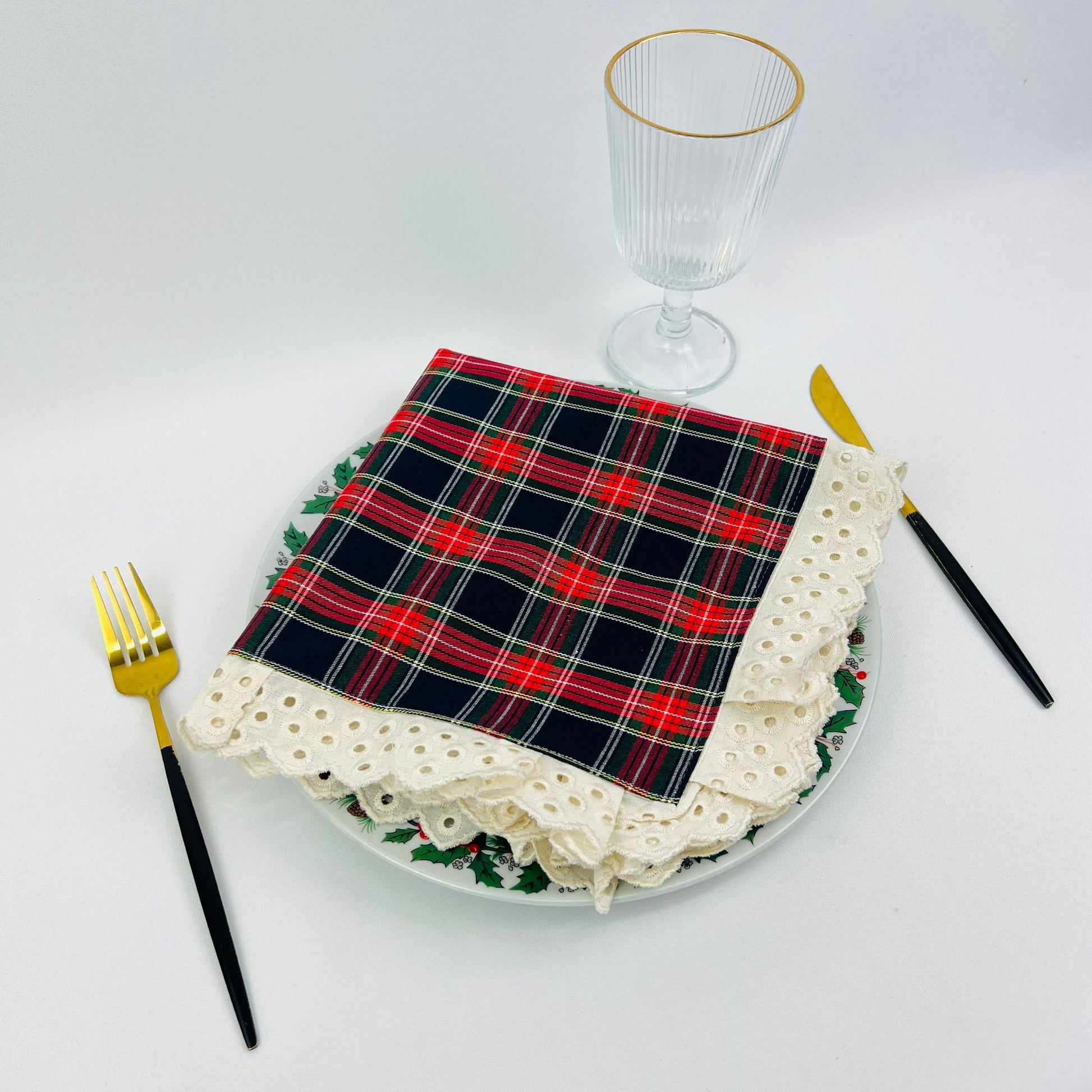 Guardanapo em algodão de tons natalícios, c/ acabamento em renda bege.