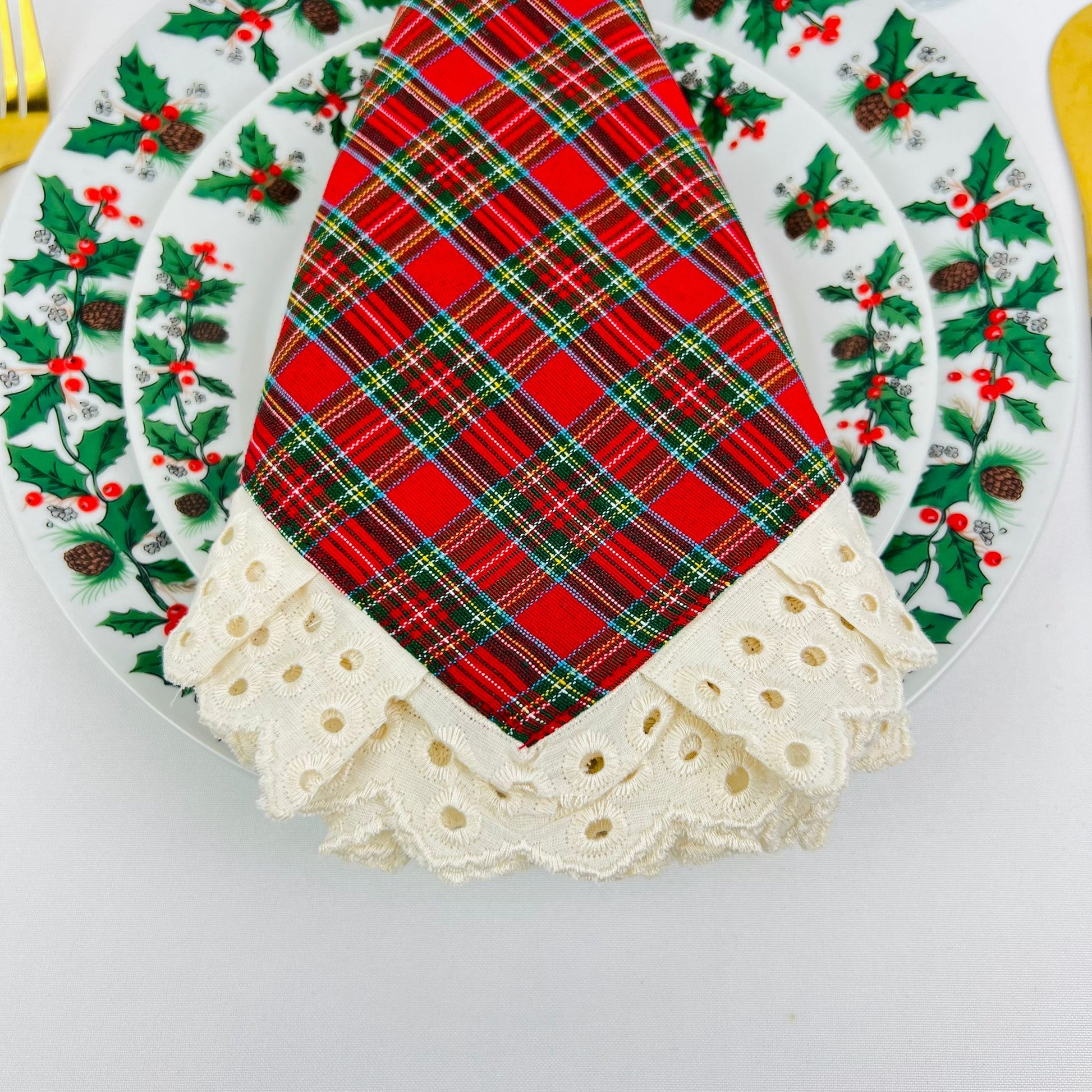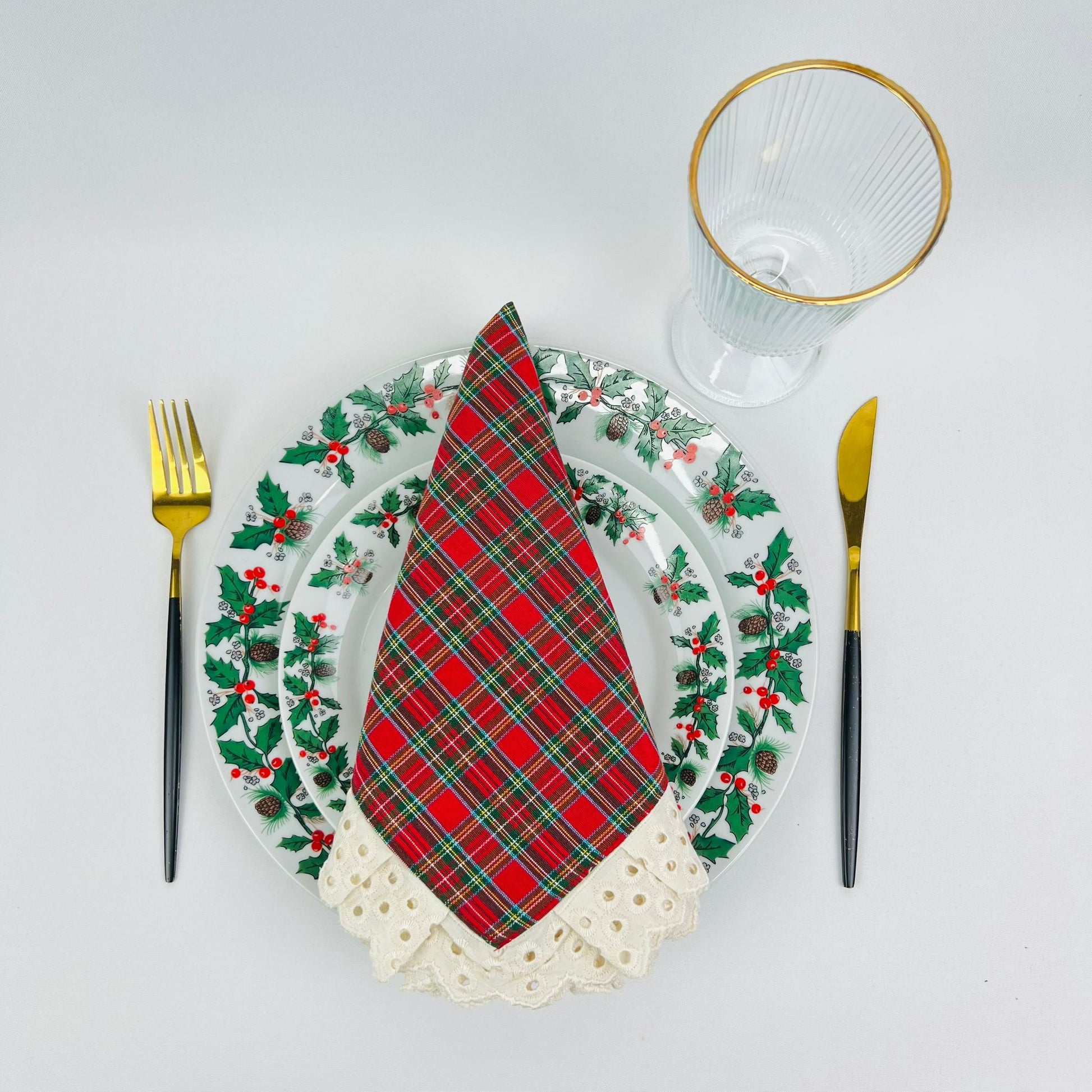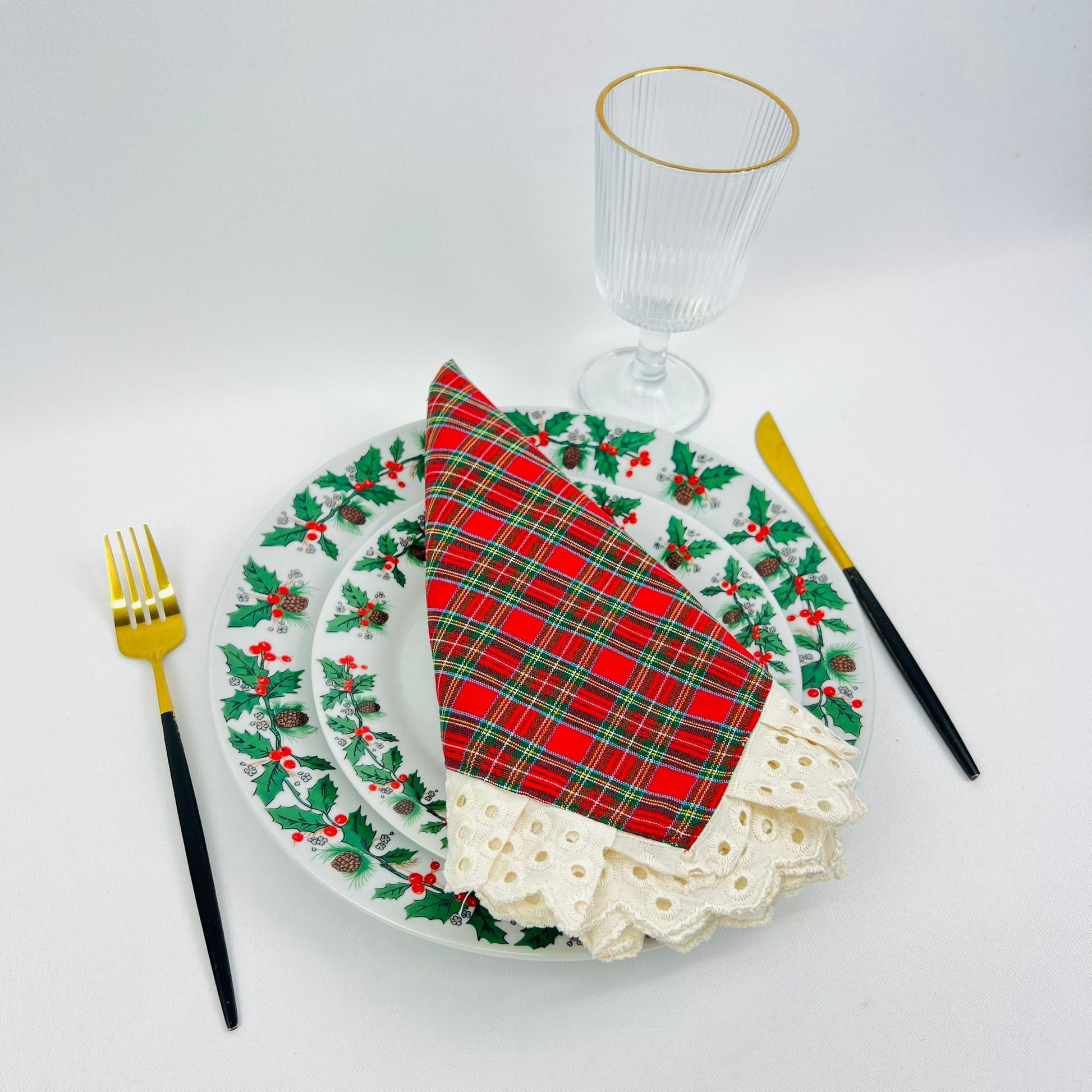 Guardanapo em algodão de tons natalícios, c/ acabamento em renda bege.