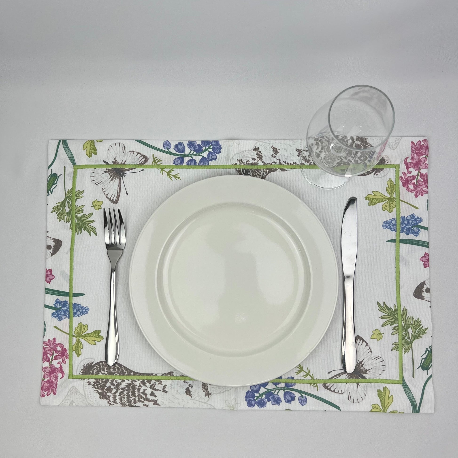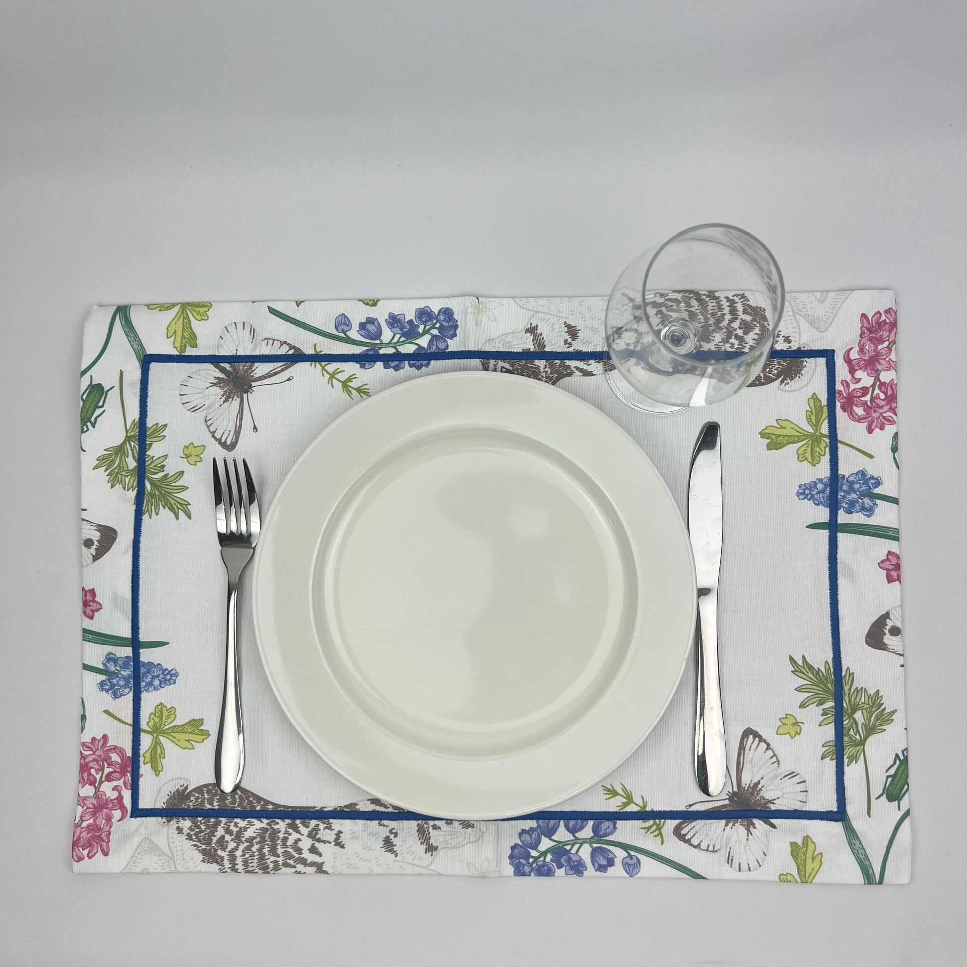 Individual em algodão, 35x50 cm aprox., c/ estampado e acabamento em rolinho azul ou verde.