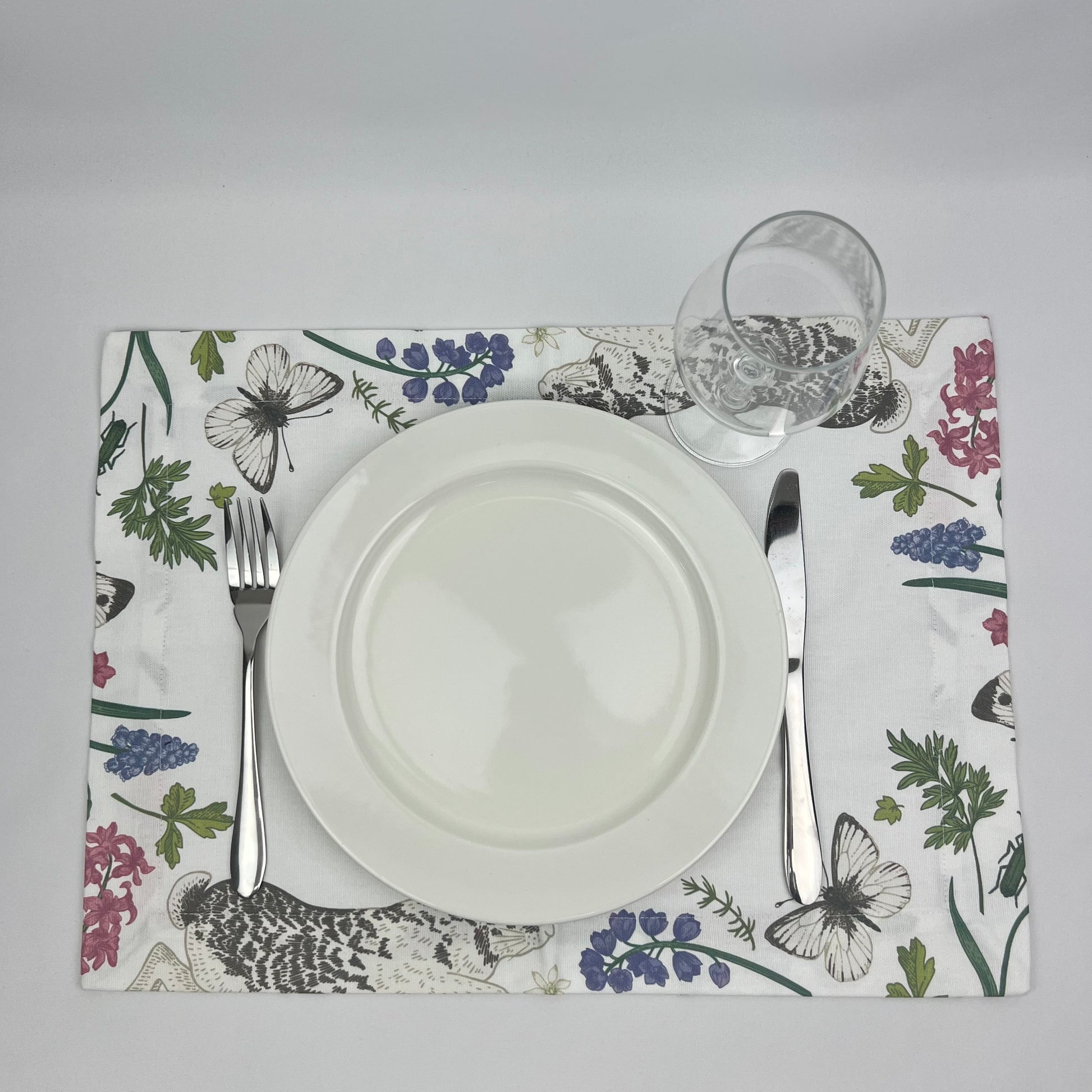 Individual em algodão,35x50 cm aprox., c/ estampado e acabamento em bainha inglesa.