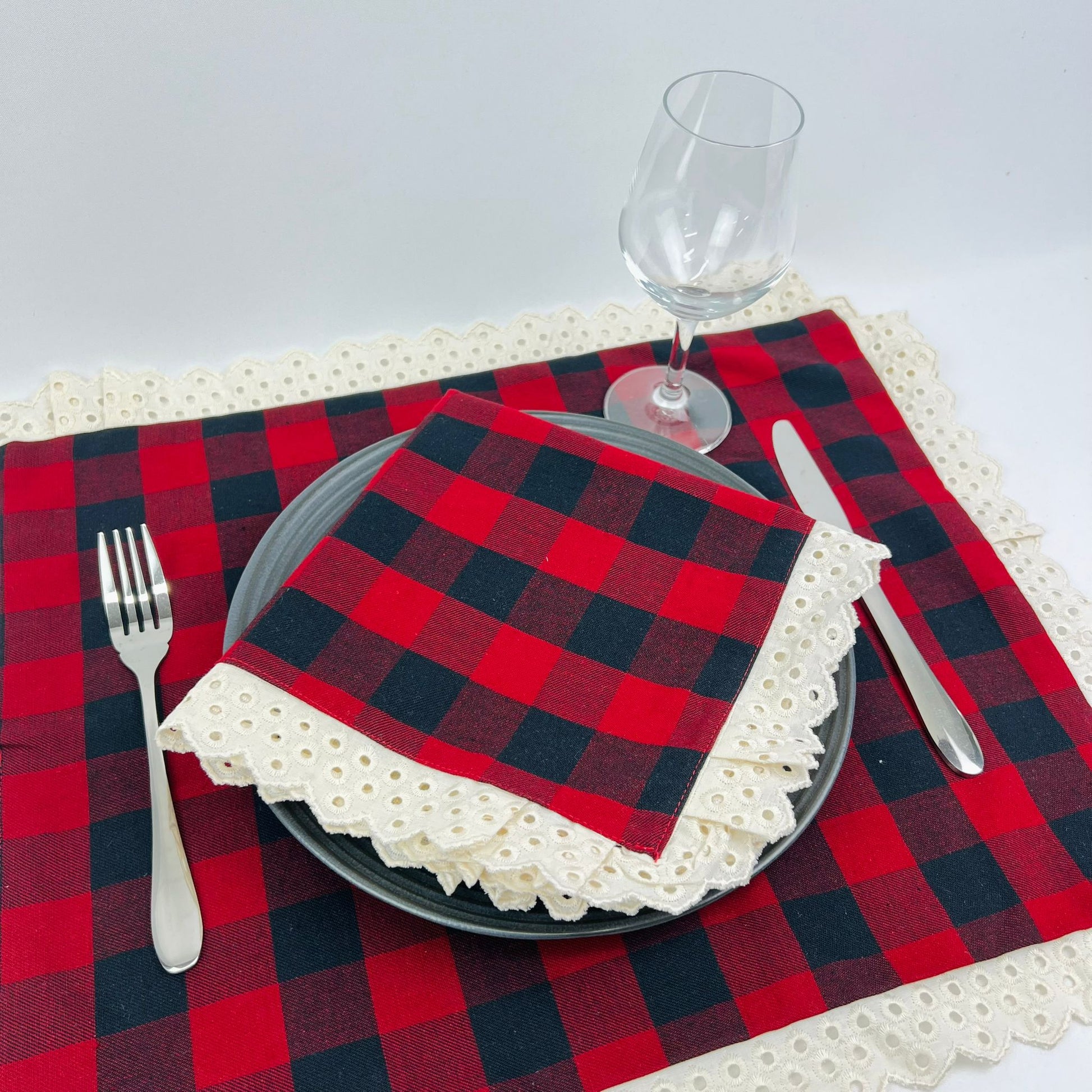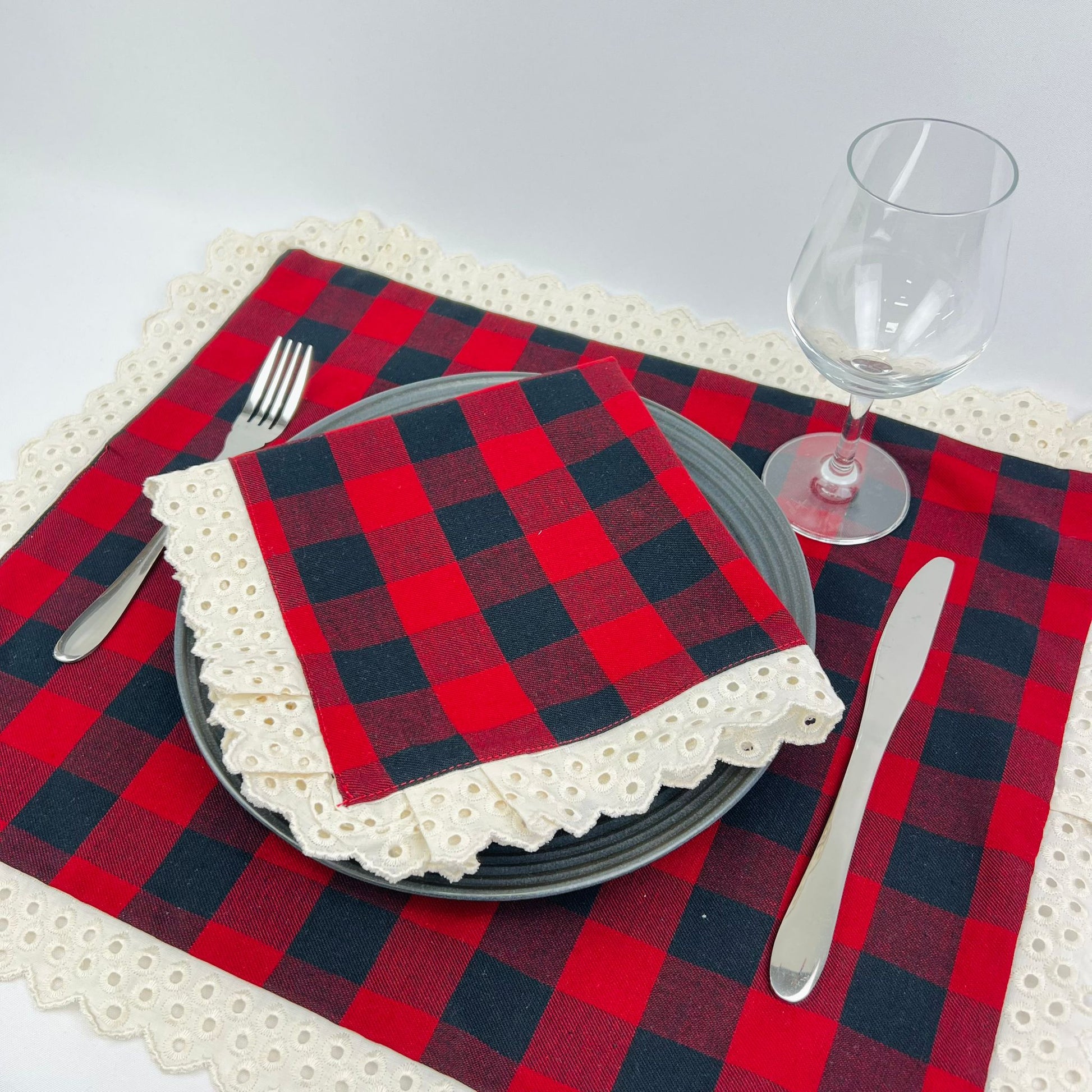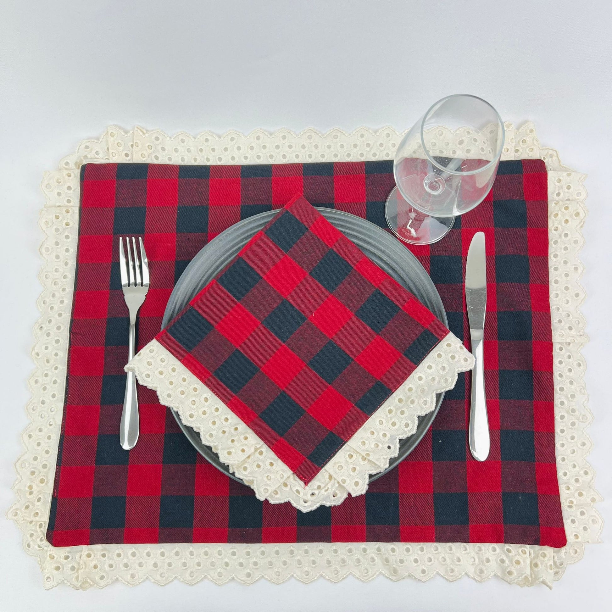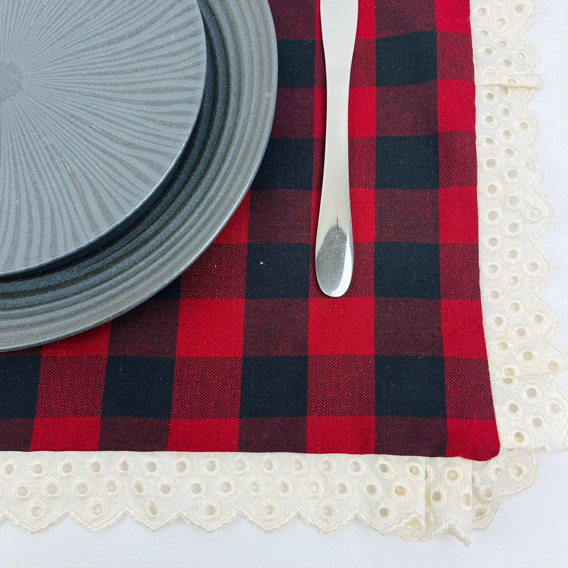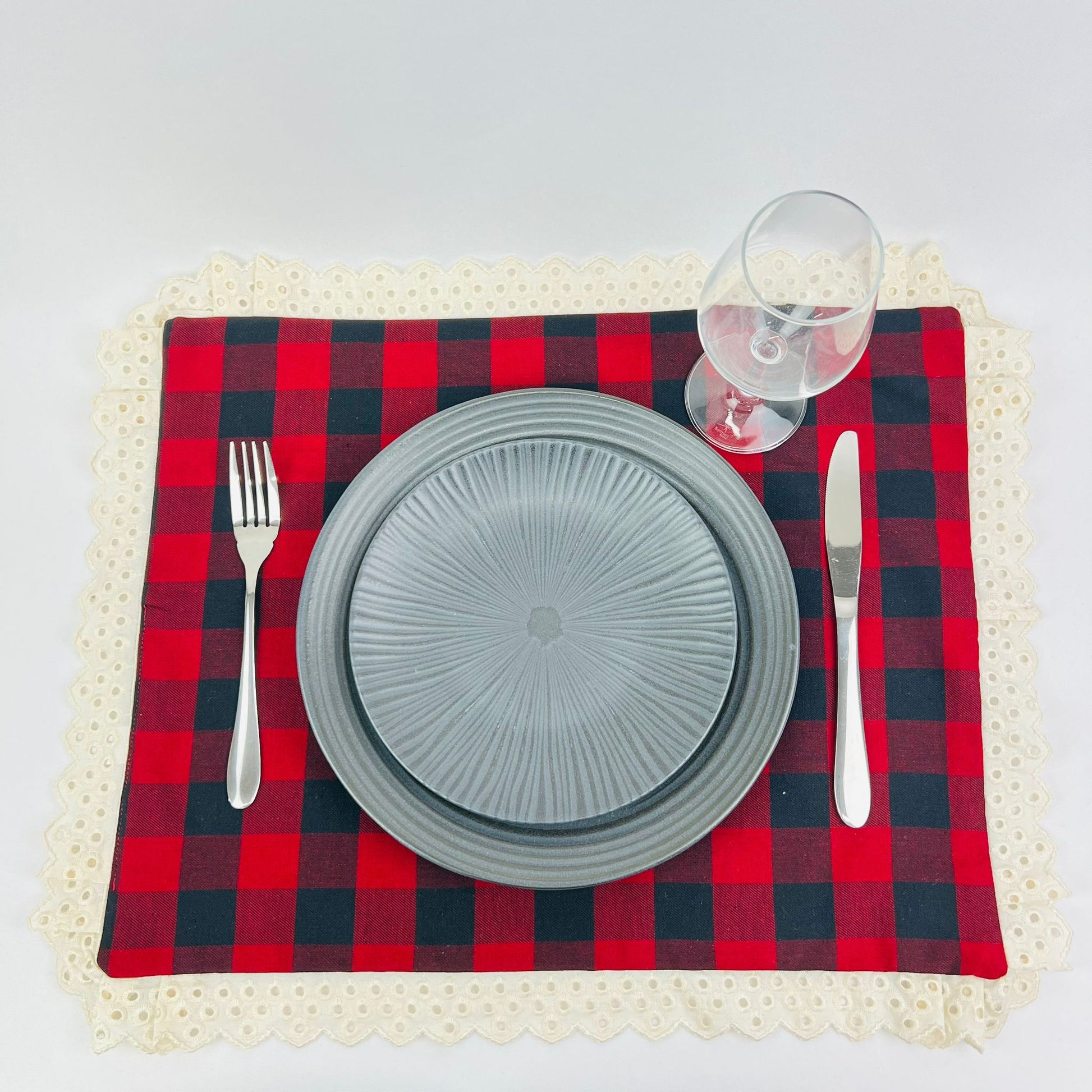 Individual de mesa em algodão, duplo, c/ acabamento em renda bege.