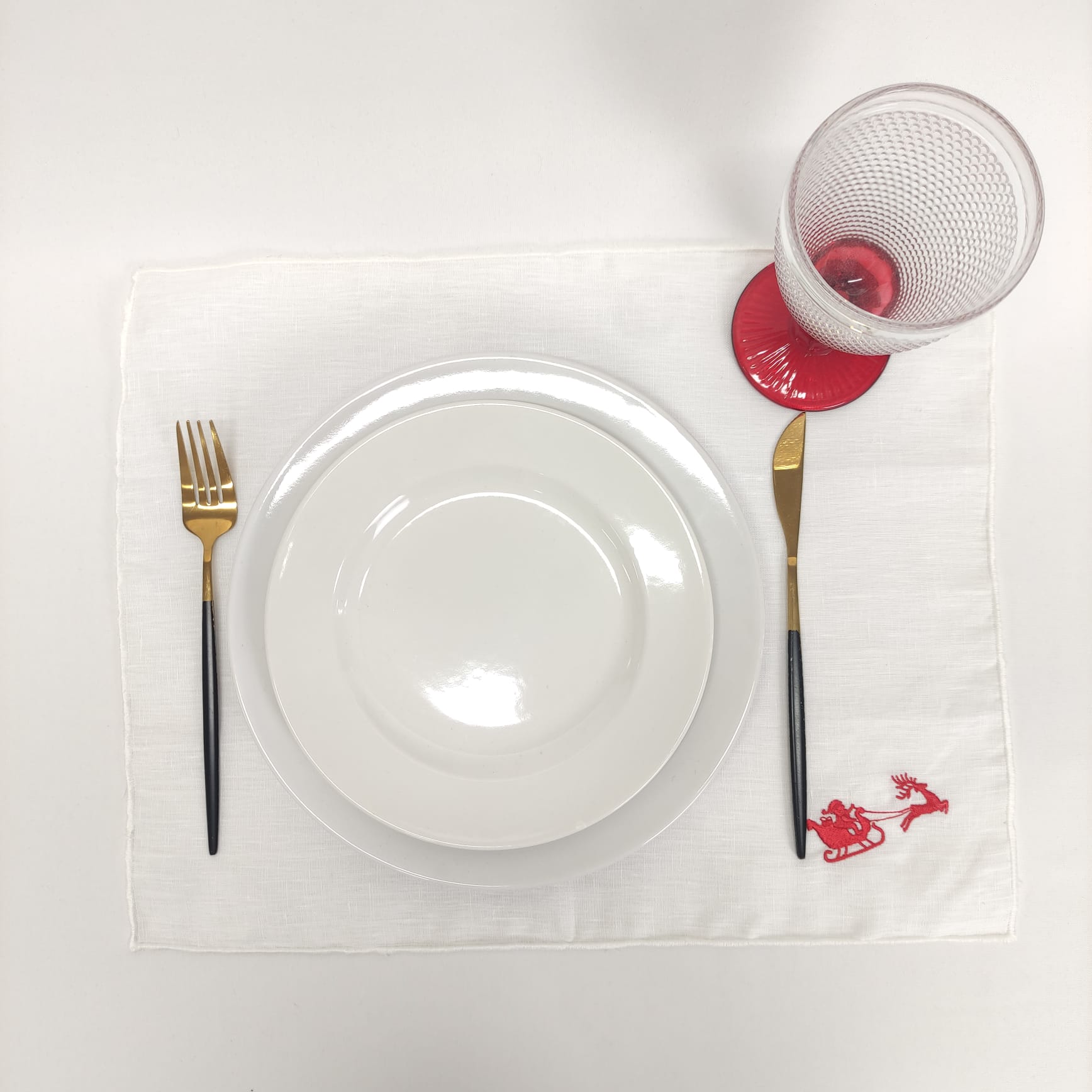 Individual em linho branco, 35x45 cm, com bordado de Natal e acabamento em rolinho.