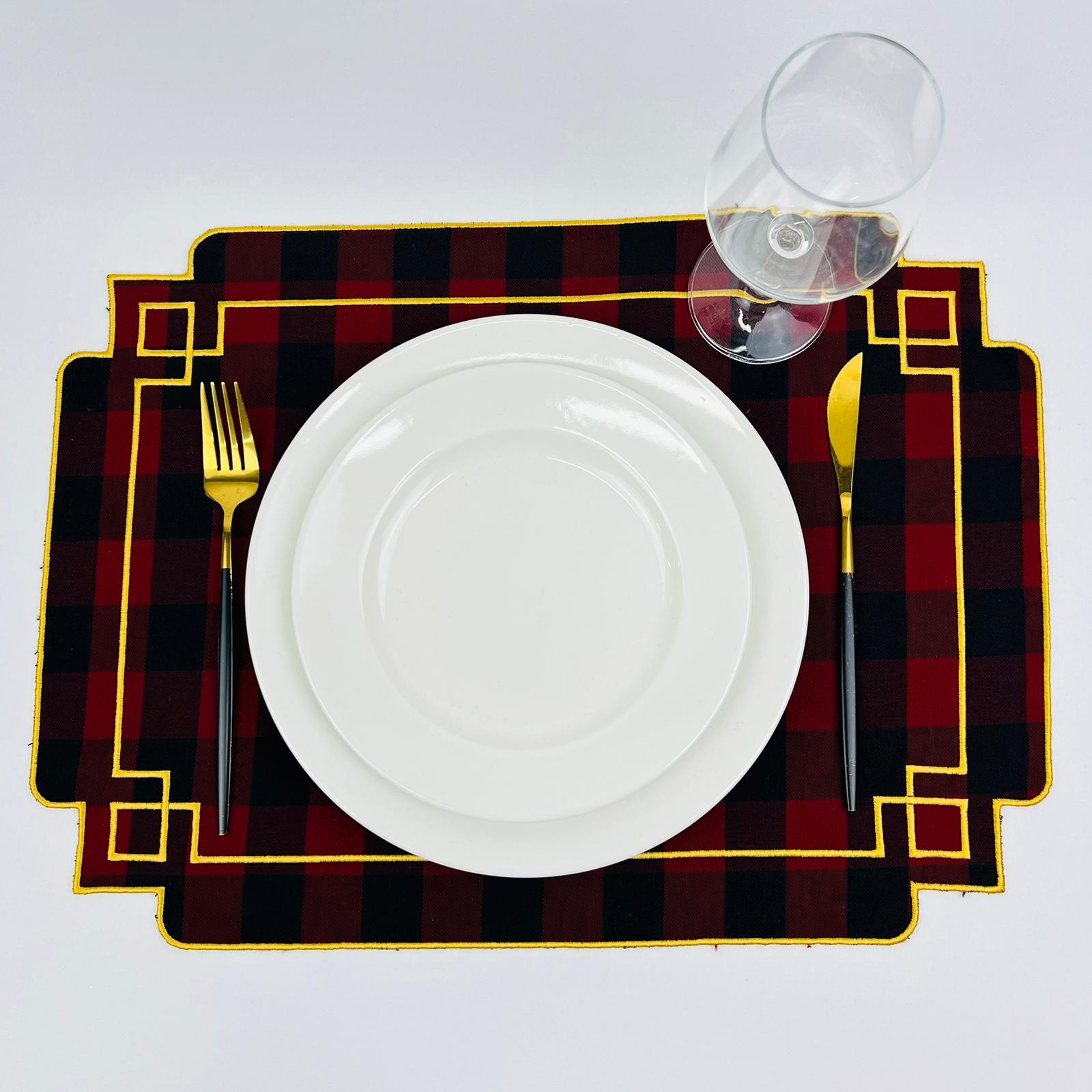 Individual em tons natalícios com acabamento em rolinho dourado.