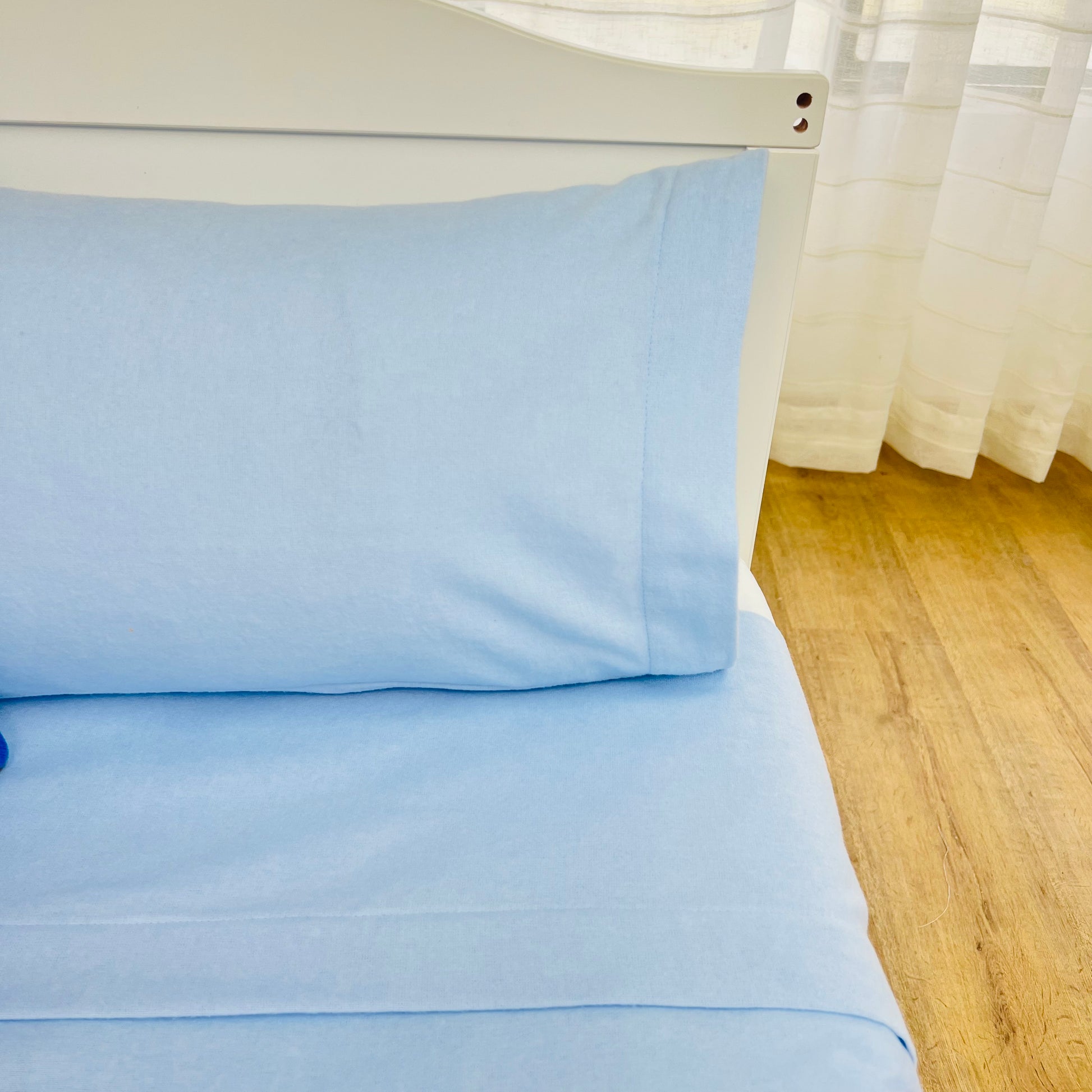 Jogo de lençóis em flanela azul, disponível em várias medidas.