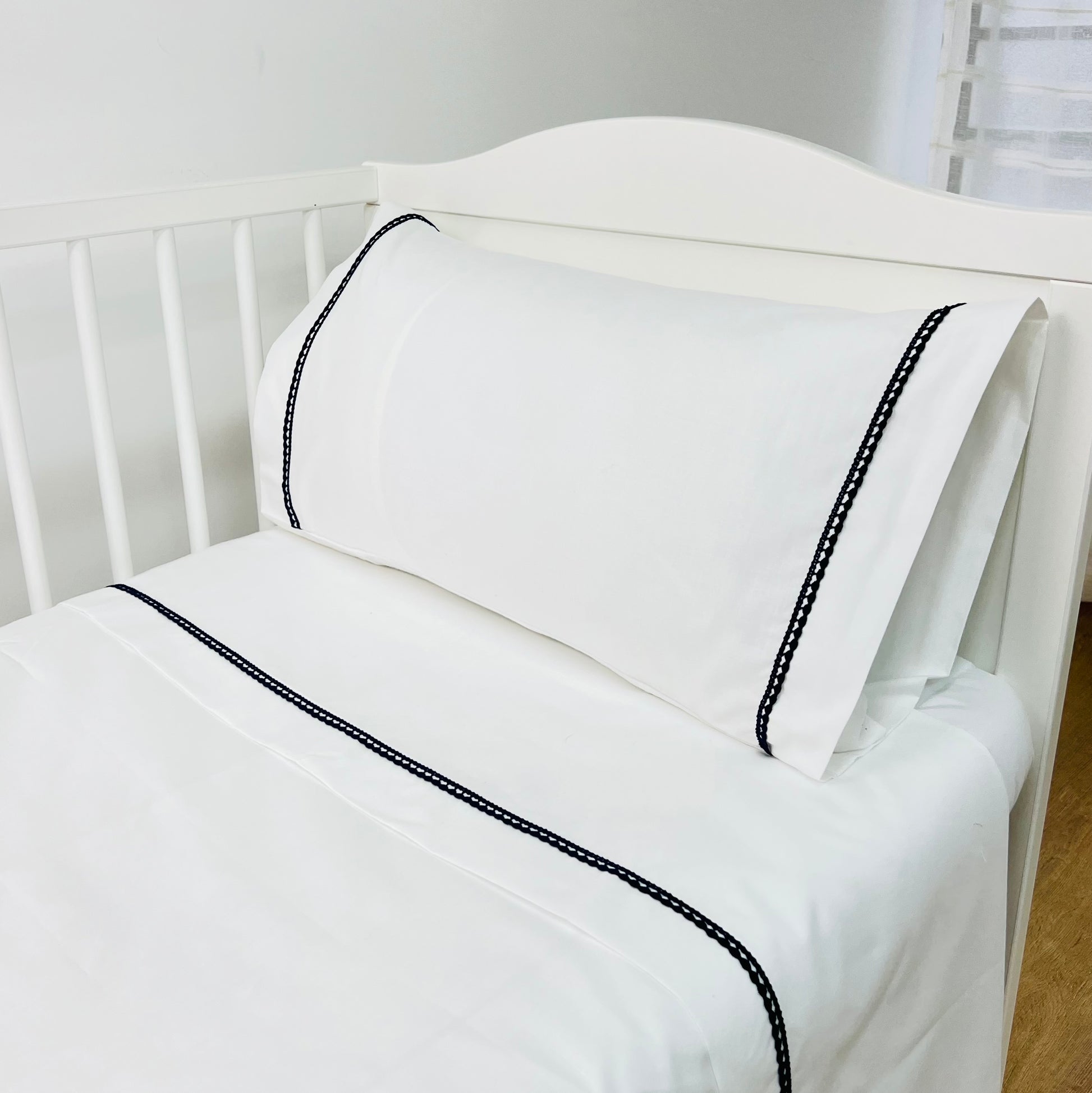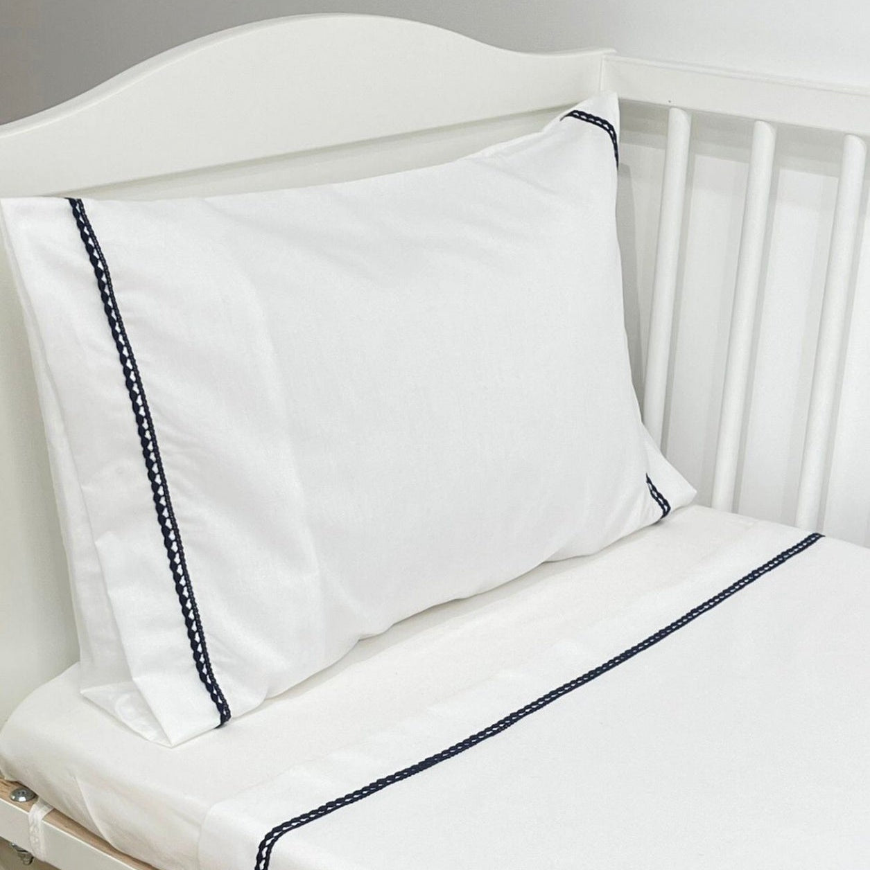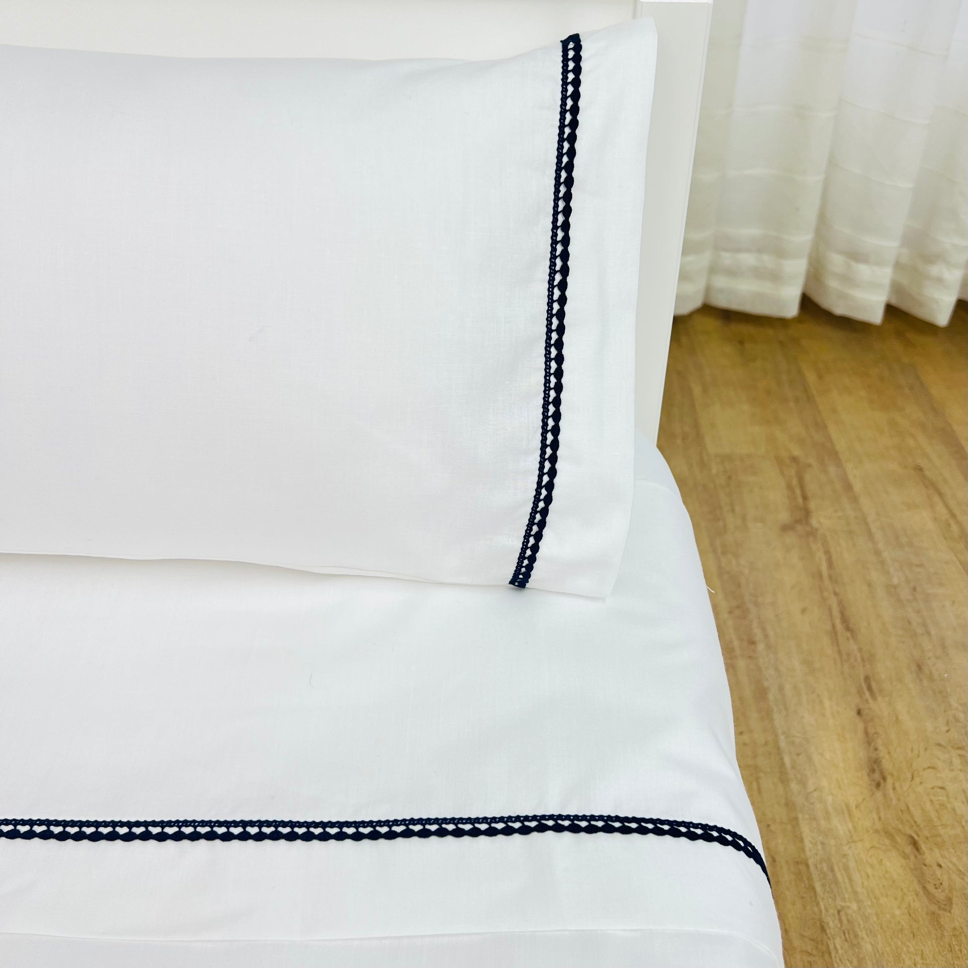Jogo de lençóis em algodão com detalhe de renda azul-marinho, disponível em várias medidas.
