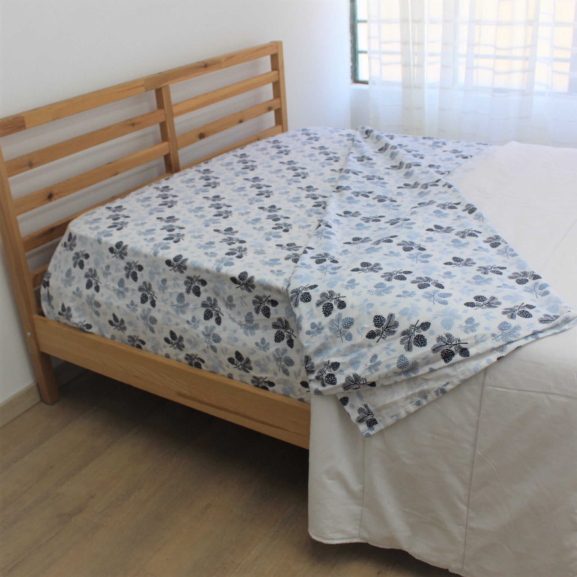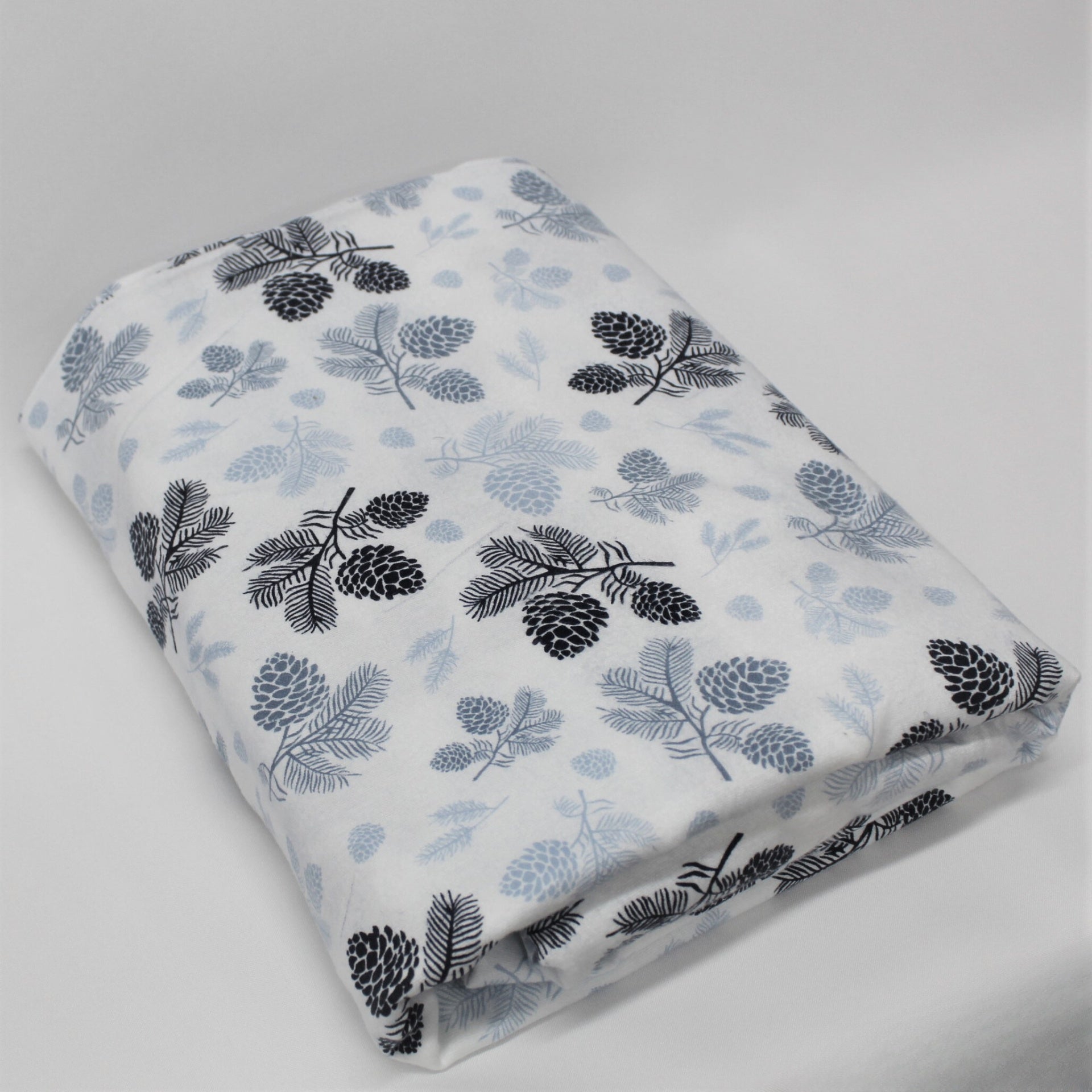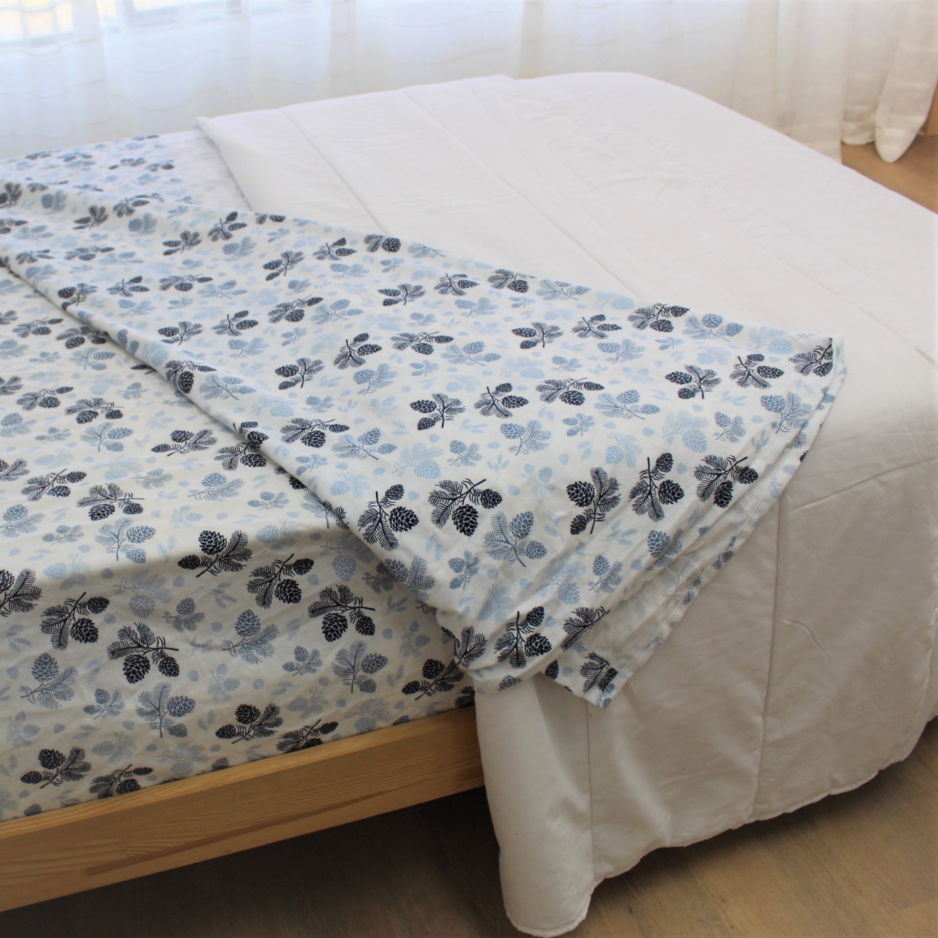 Lençol de cima em flanela com padrão em tons de azul, disponível em várias medidas.