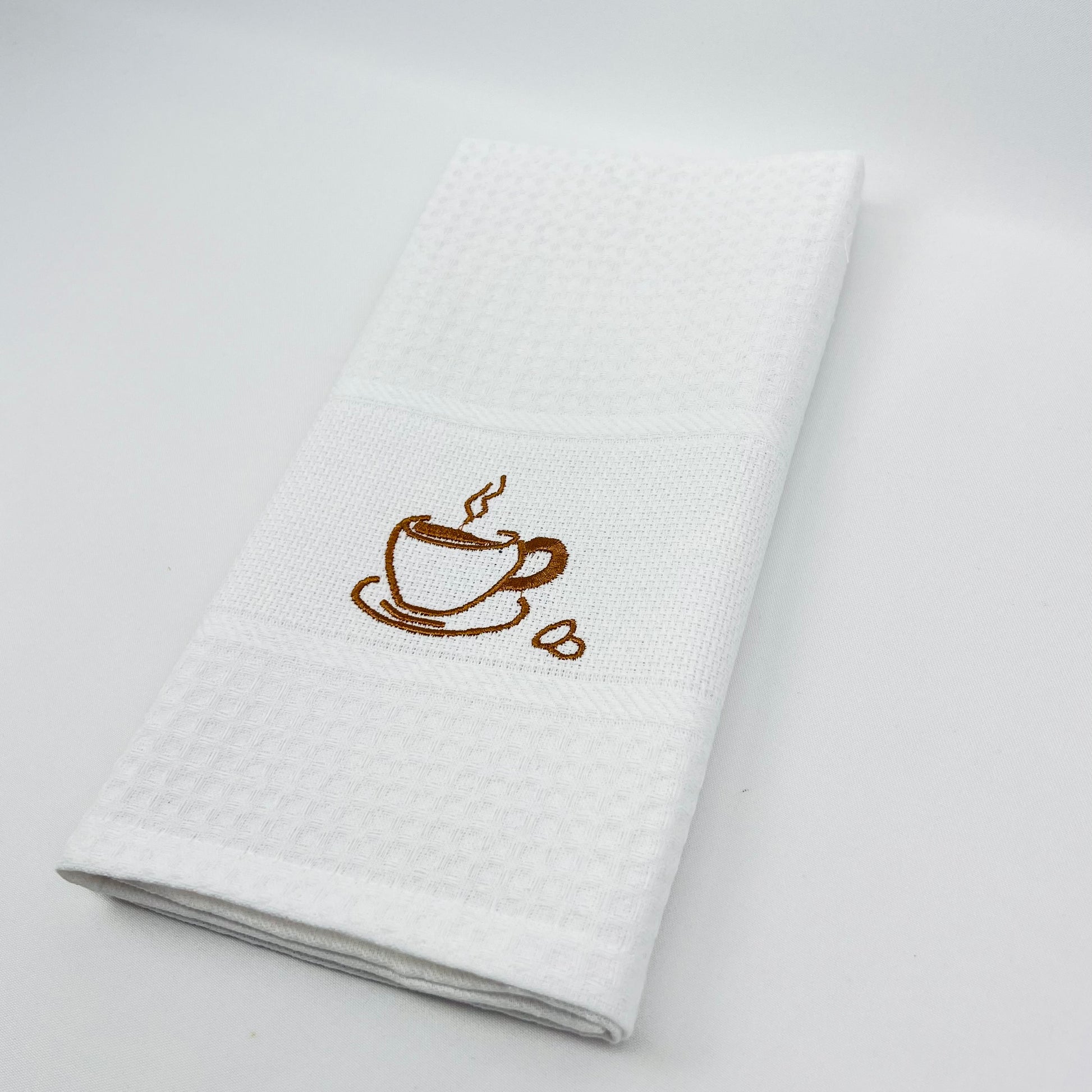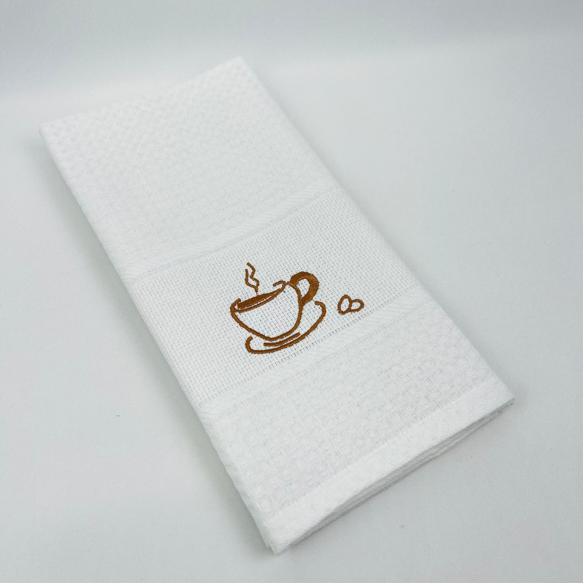 Pano de cozinha em felpo de algodão branco com delicado bordado em dourado