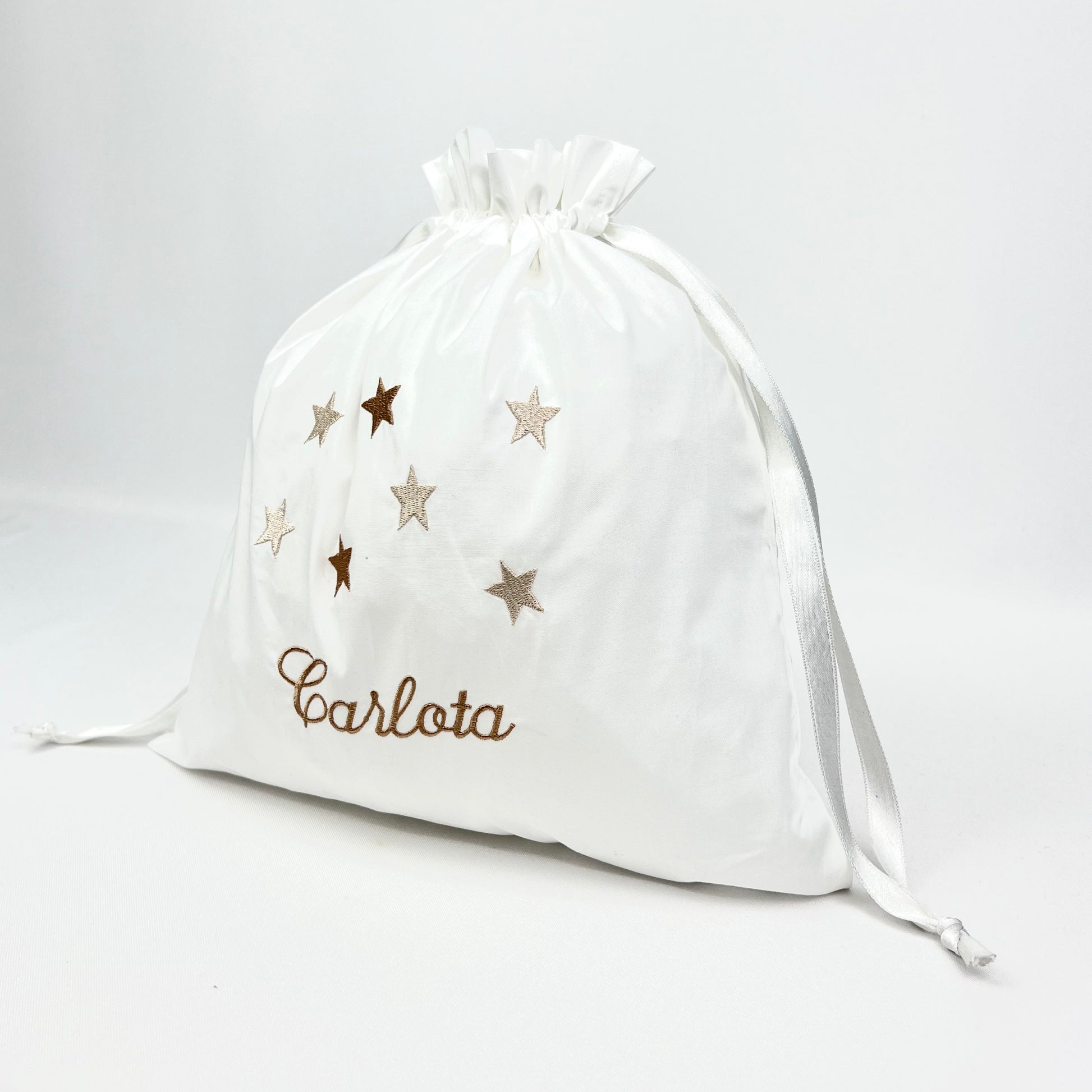 Saco personalizável em algodão, c/ bordado infantil, ideal para transportar os bens pessoais do seu bebé.