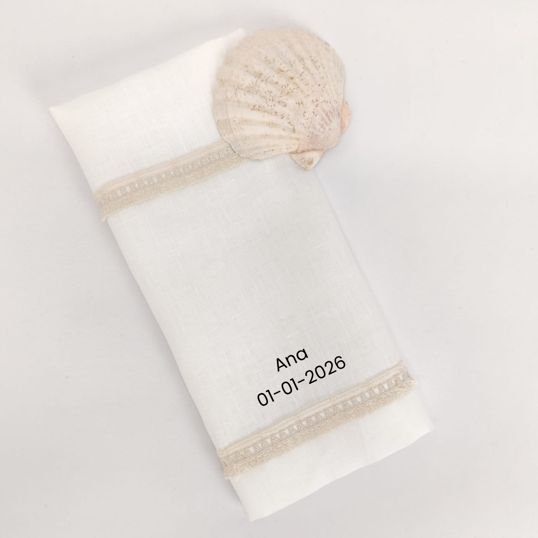 Toalha de batismo personalizável, em linho branco c/ detalhe em renda bege