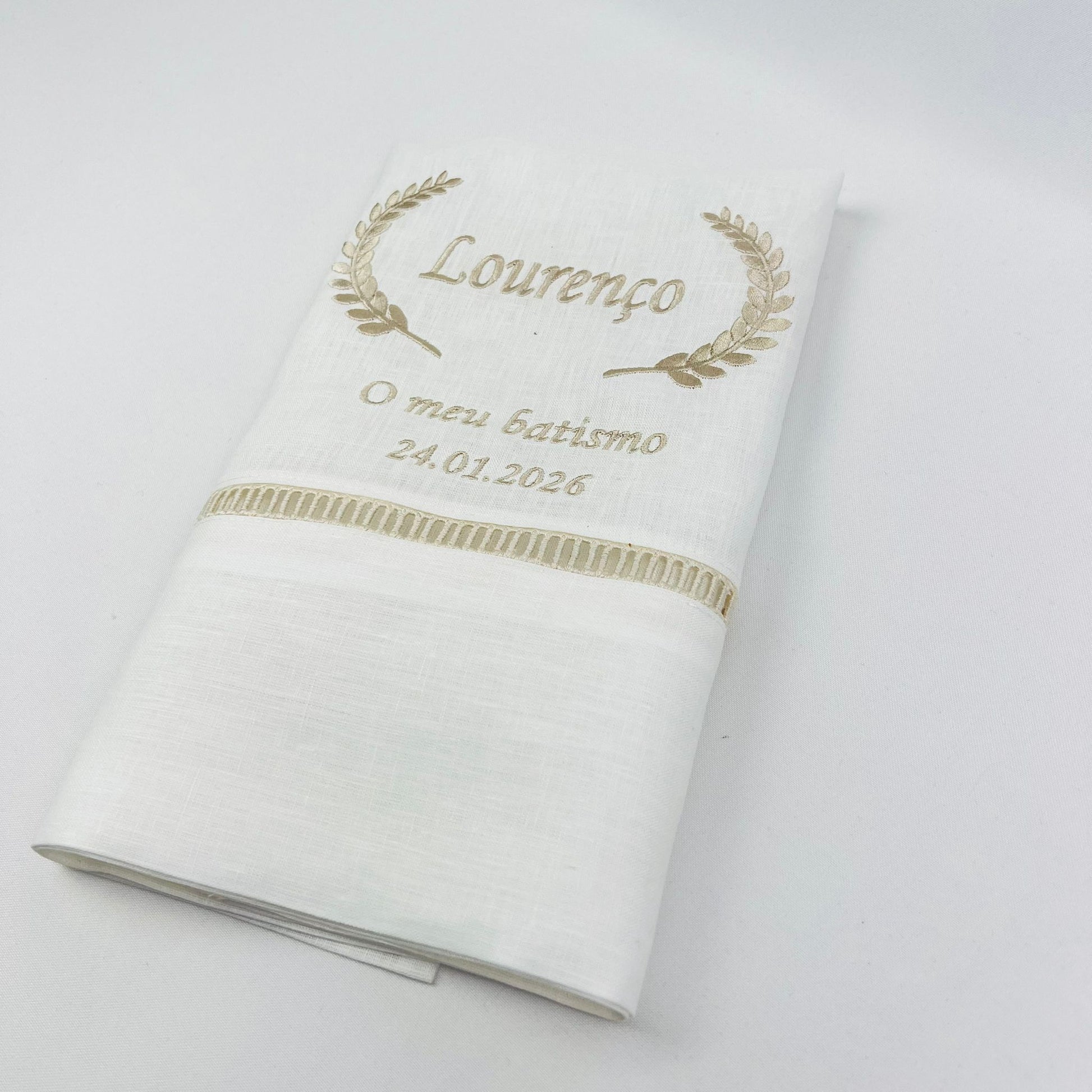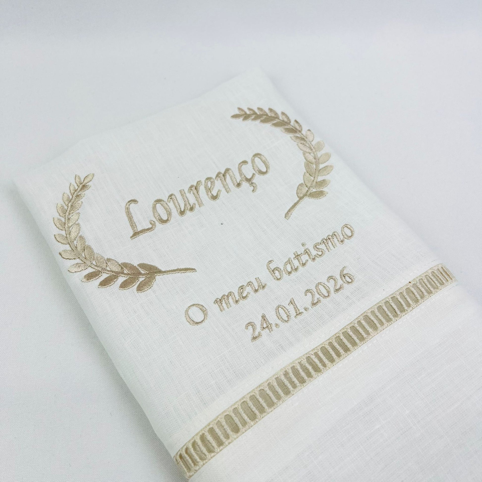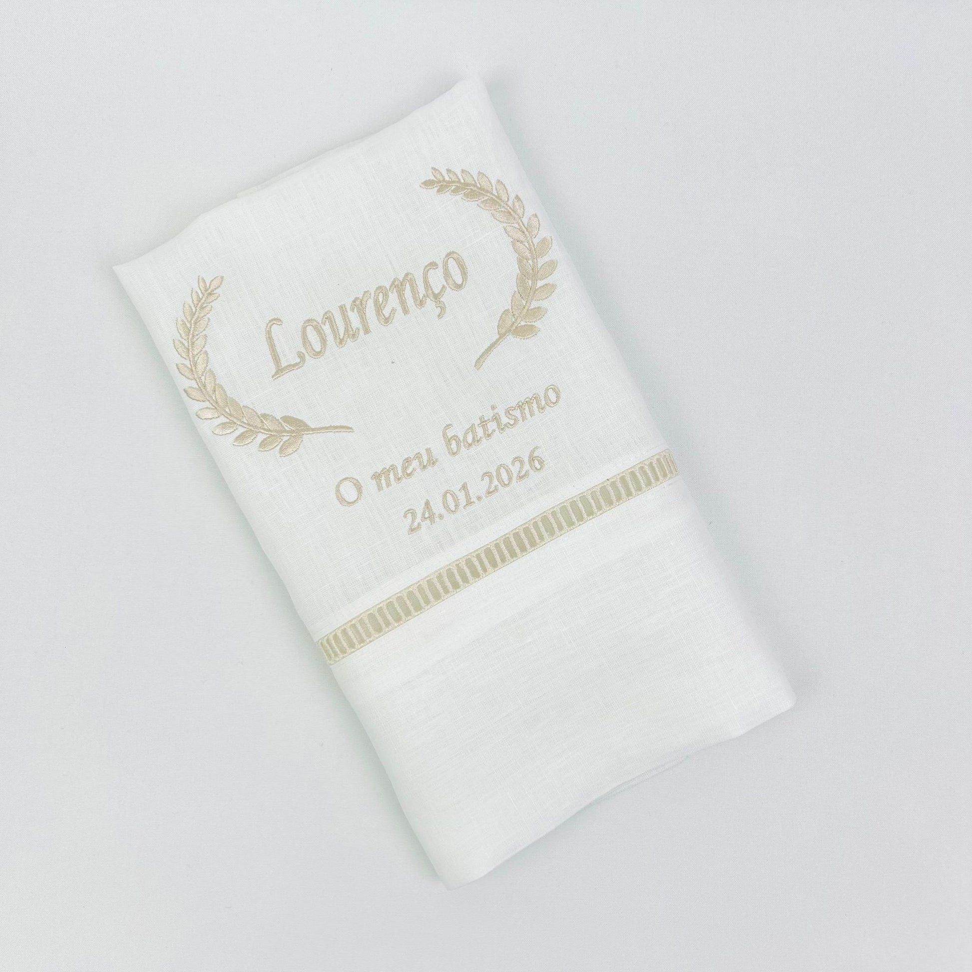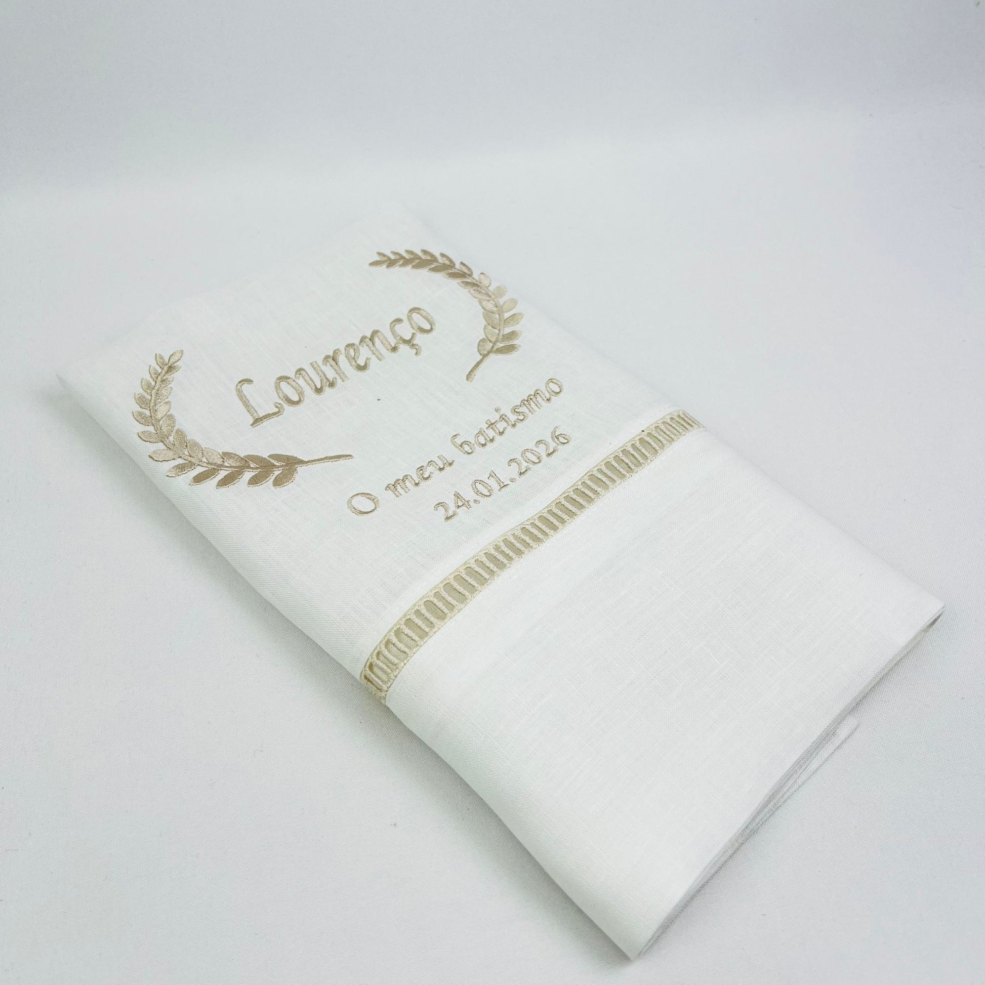 Toalha de batismo personalizável, em linho branco c/ detalhe em escadote bege e bordado disponível em várias cores
