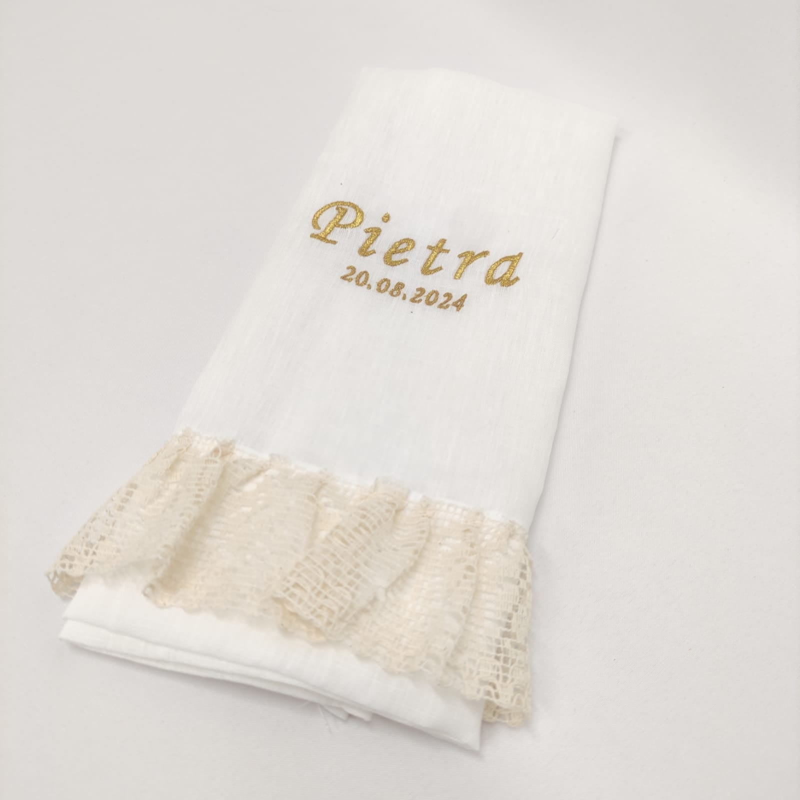 Toalha de batismo personalizável, em linho branco c/ detalhe em folho bege