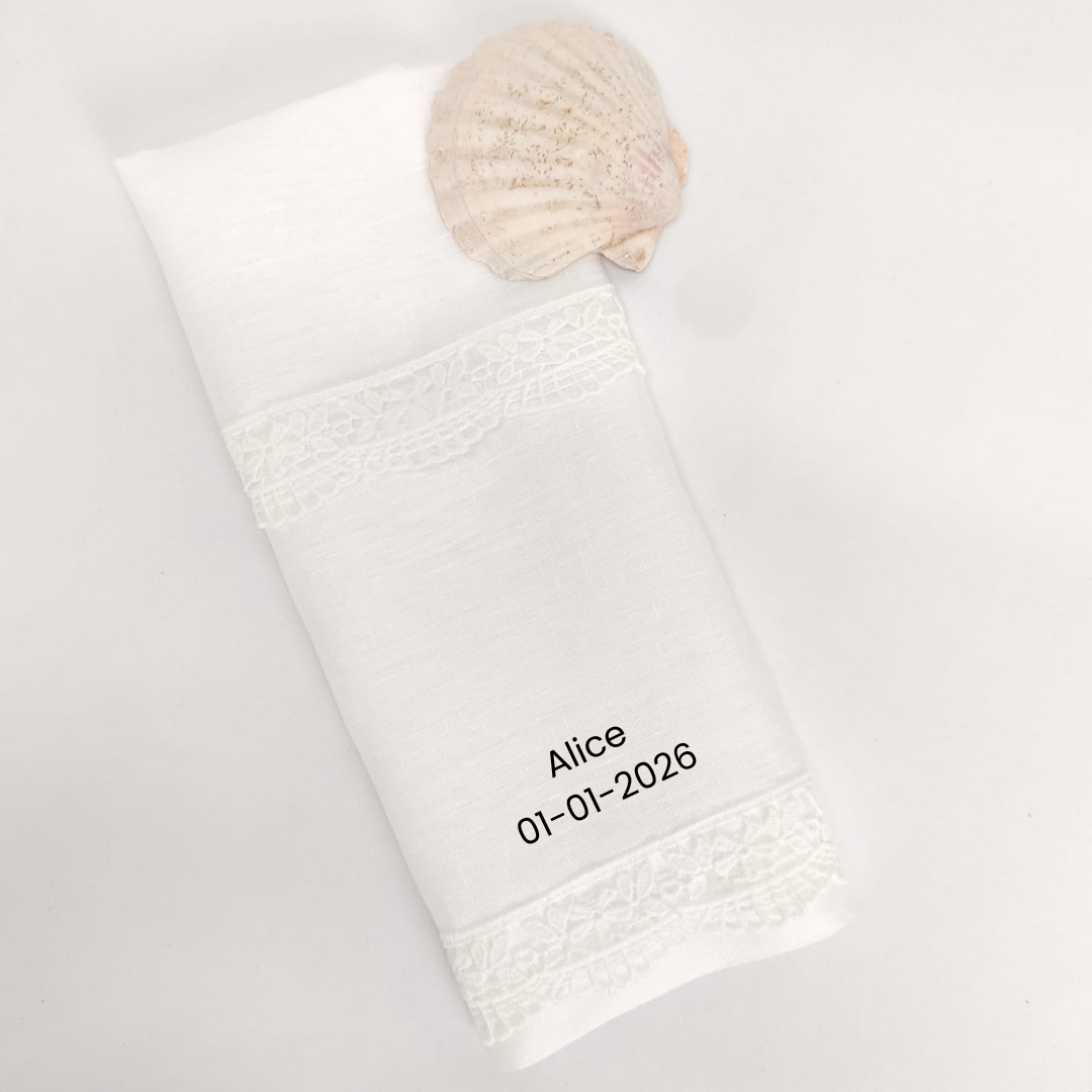Toalha de batismo personalizável, em linho branco c/ detalhe em renda bege.