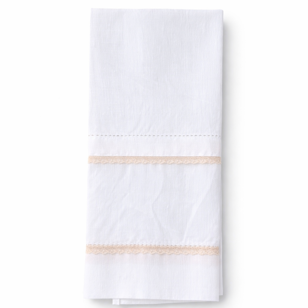 Toalha de batismo em linho branco c/ detalhe em renda salmão