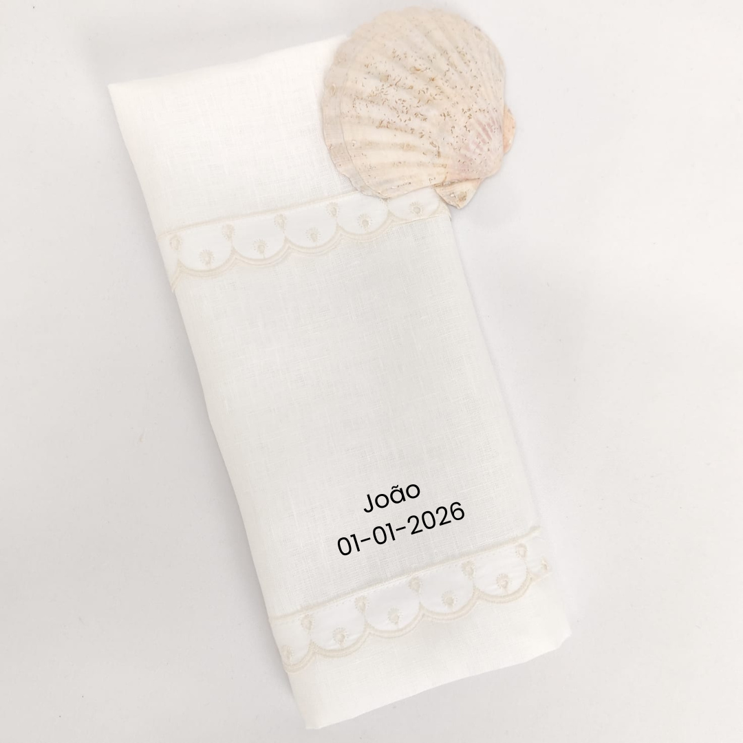 Toalha de batismo personalizável, em linho branco c/ detalhe em renda bege